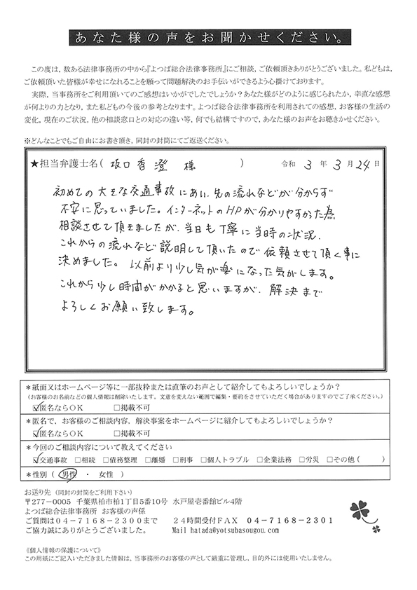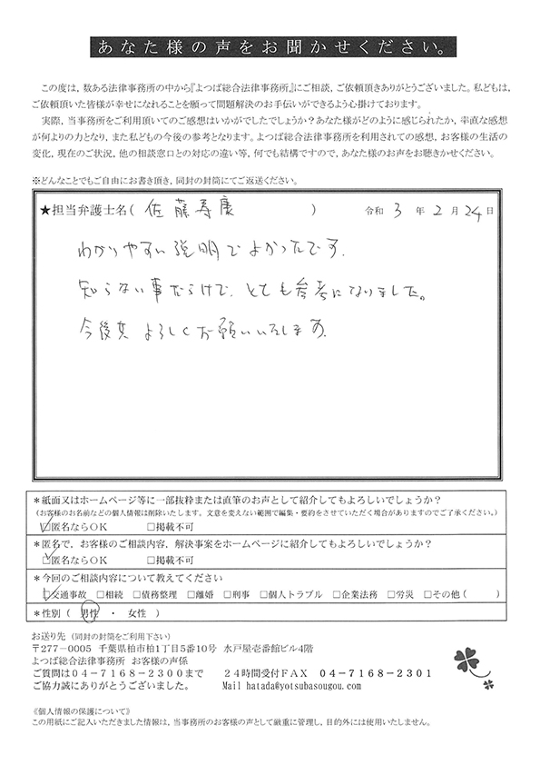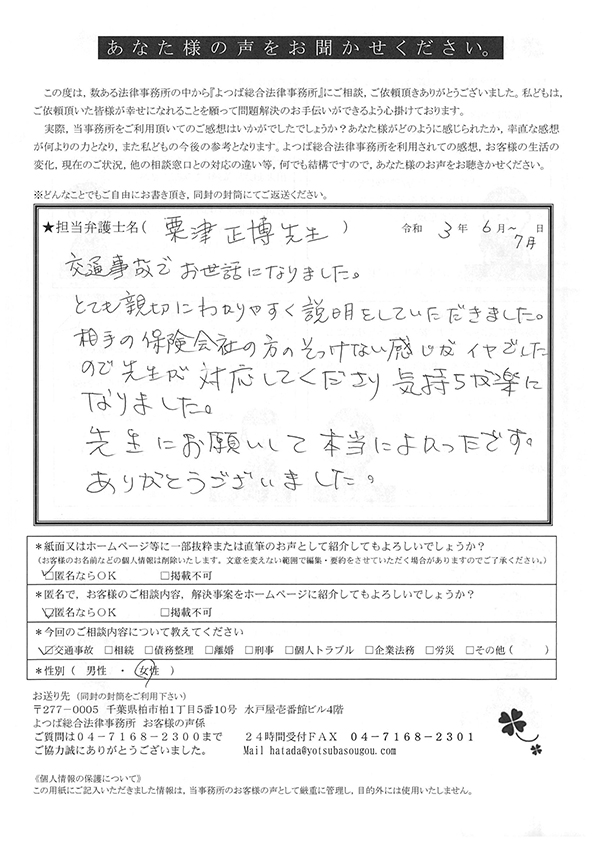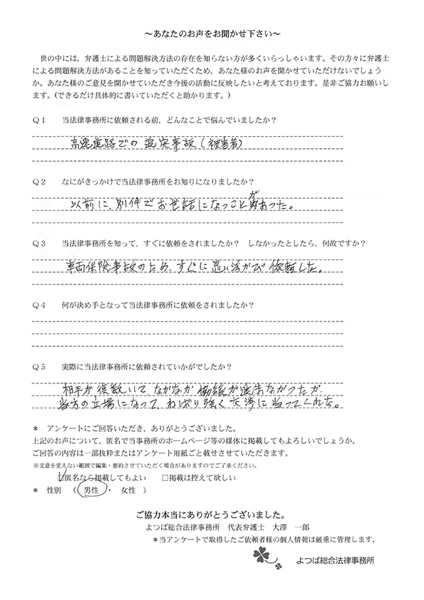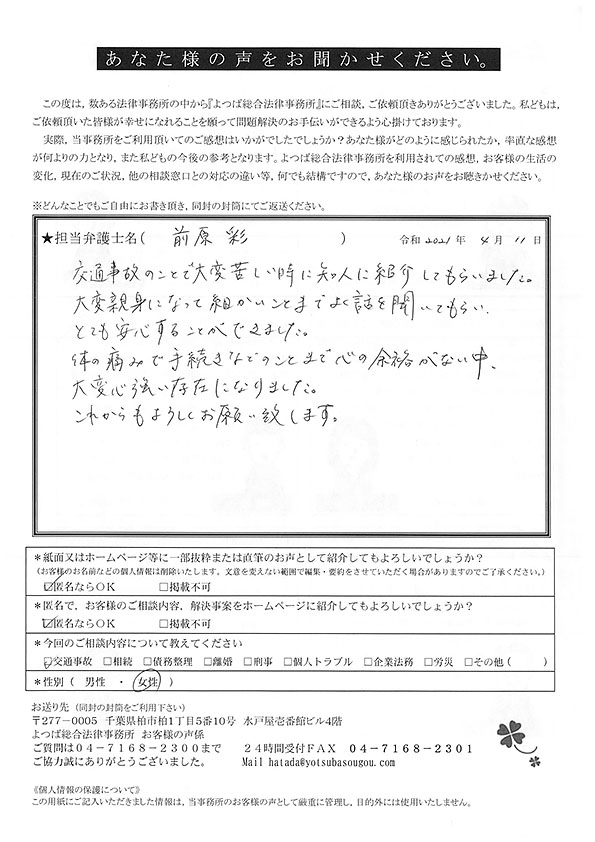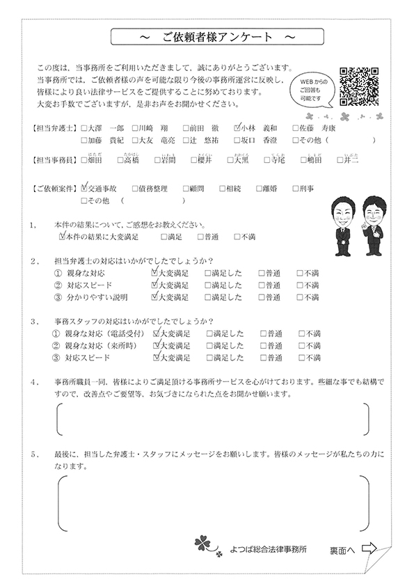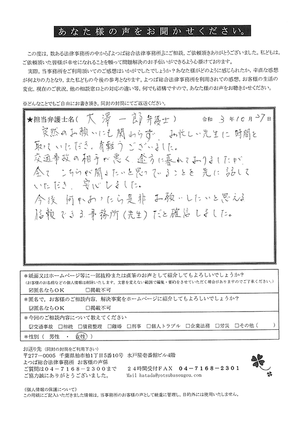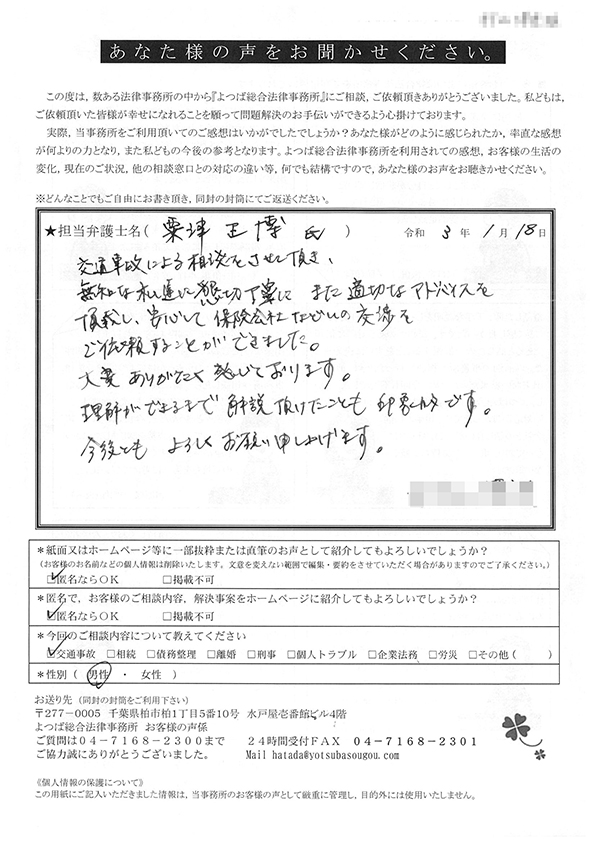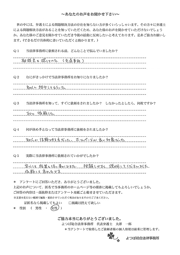交通事故による相談をさせていただき、無知な私たちに懇切丁寧にまた適切なアドバイスを頂戴し、安心して保険会社などの交渉をご依頼することができました。大変ありがたく思っております。今後ともよろしくお願い申し上げます。