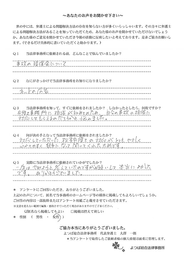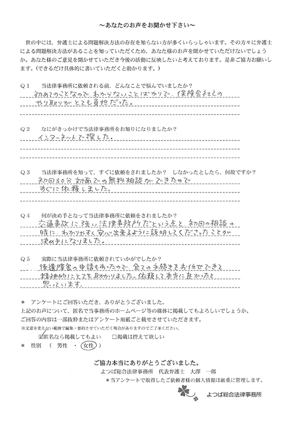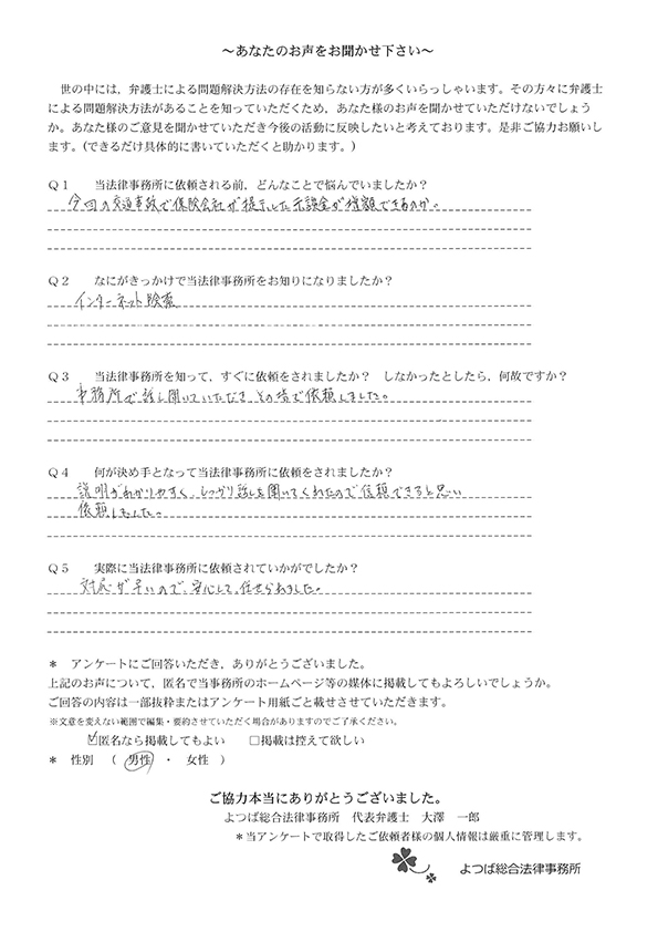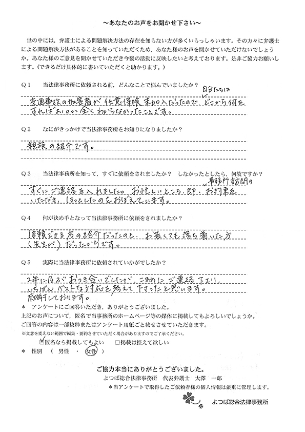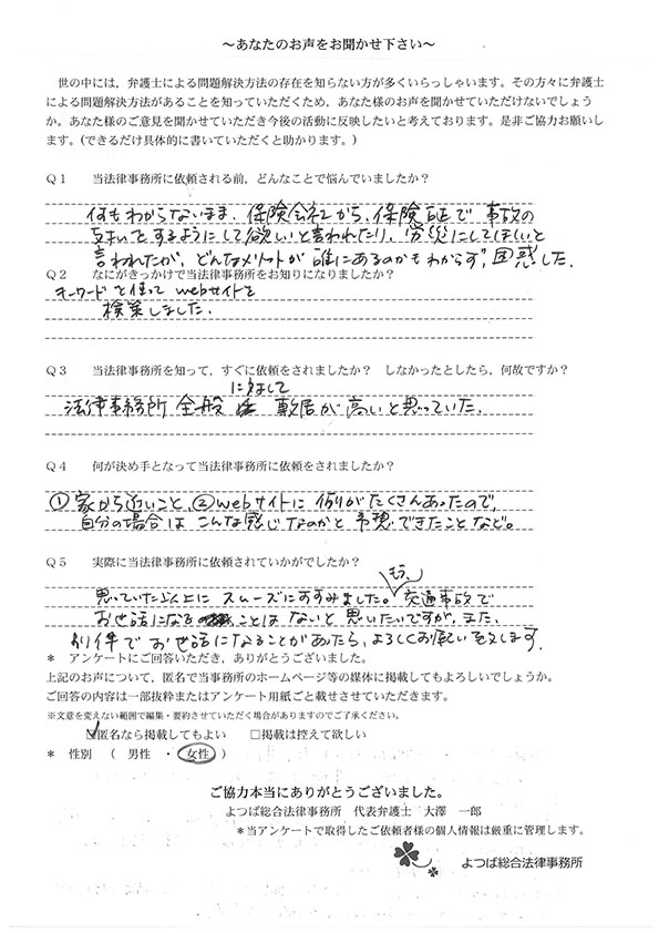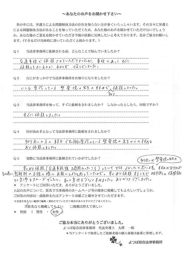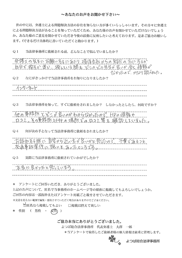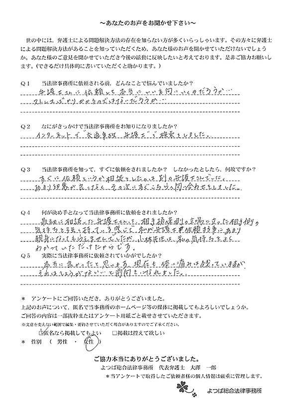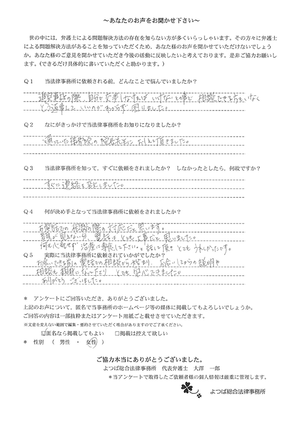 ホームページでこちらを知り、お話をしてすぐお願いすることと決めました。交通事故に強いとのことと、質問に的確に答えていただけたことが決め手でした。