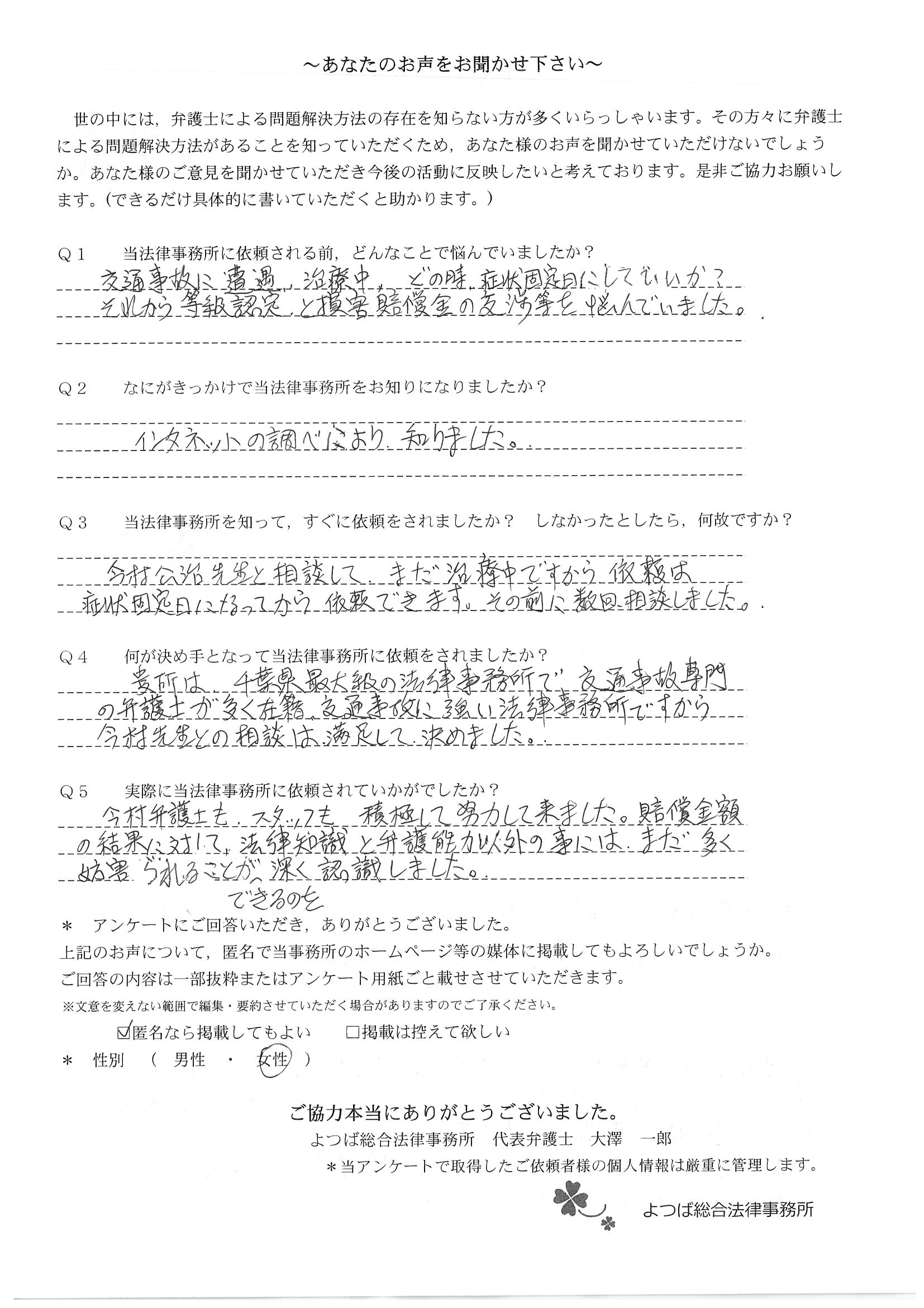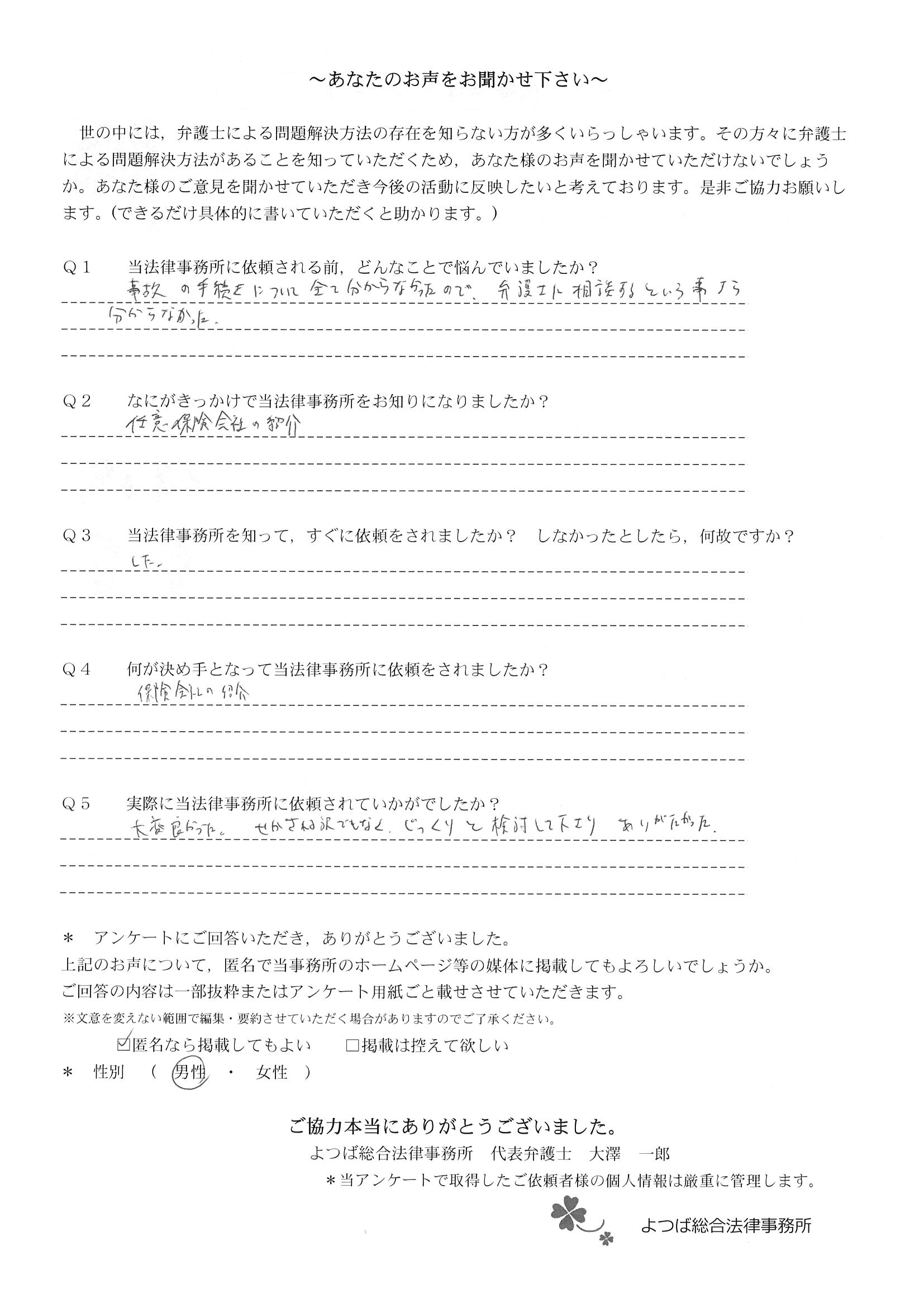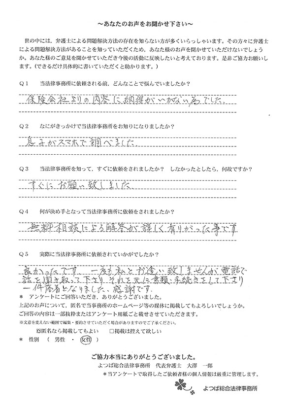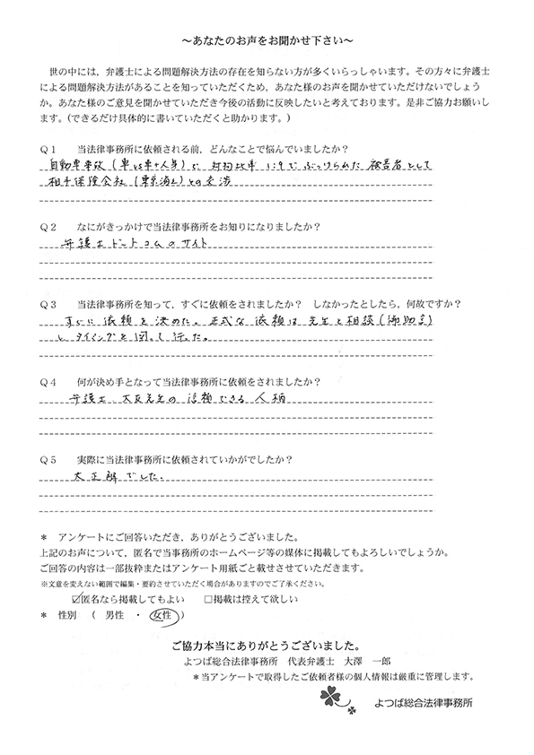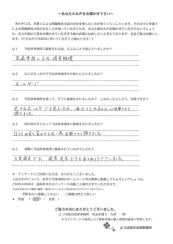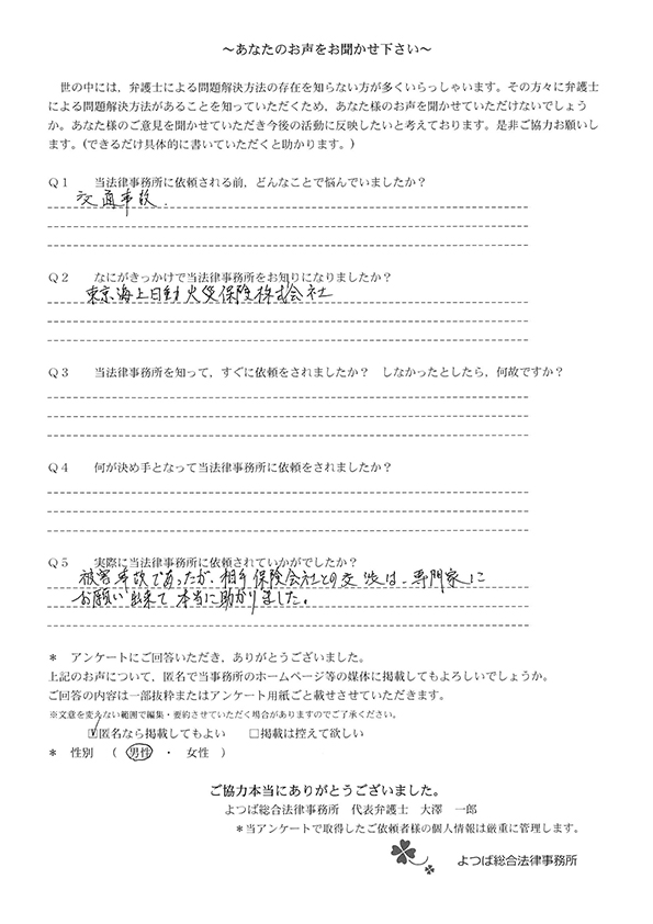 ホームページでこちらを知り、お話をしてすぐお願いすることと決めました。交通事故に強いとのことと、質問に的確に答えていただけたことが決め手でした。