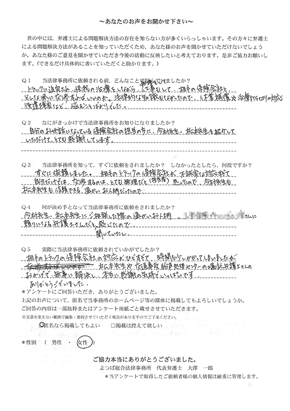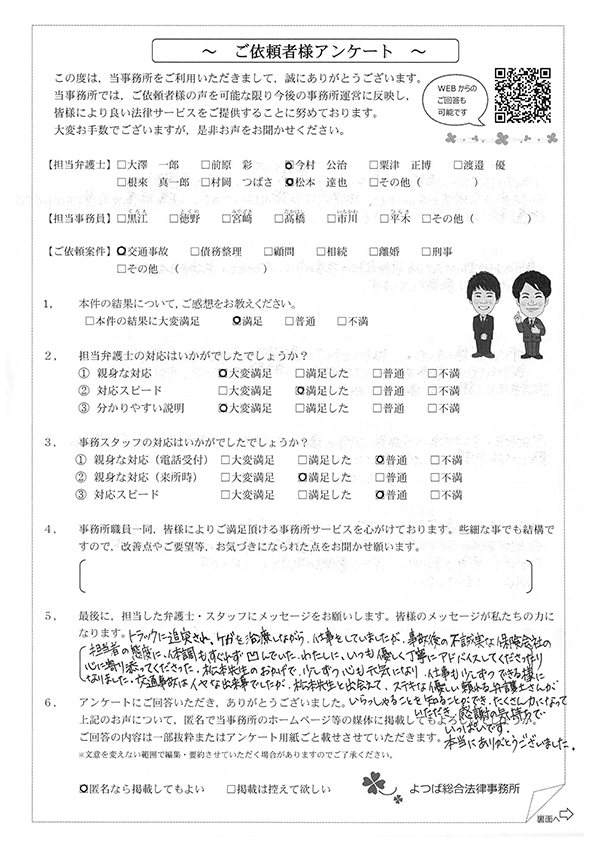 相手のトラックの保険会社の対応がひどすぎて、時間も少しかかってしまいましたが、松本先生や交通事故紛争処理センターの嘱託弁護士さんのおかげで無事に解決し、本当に感謝の気持ちでいっぱいです。ありがとうございました。