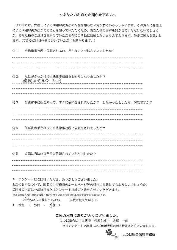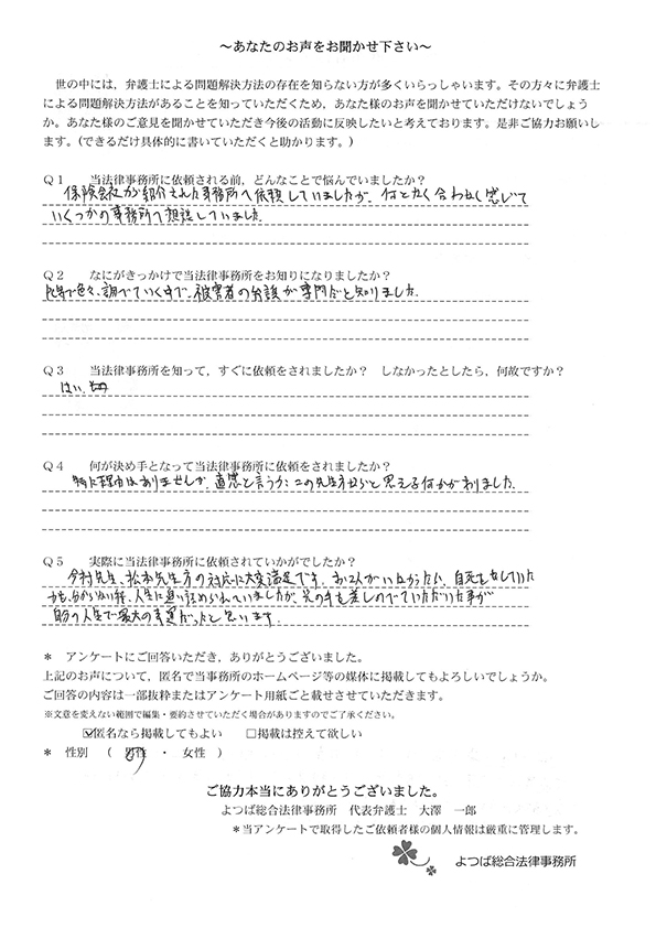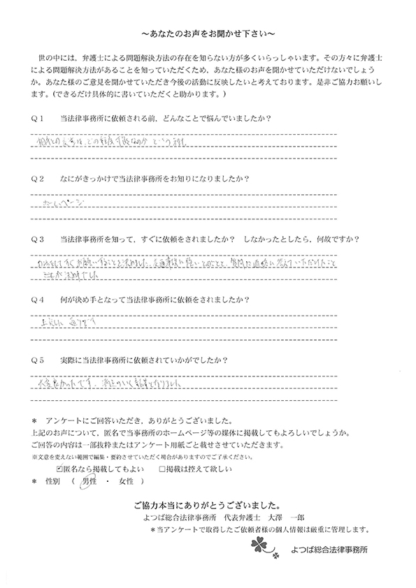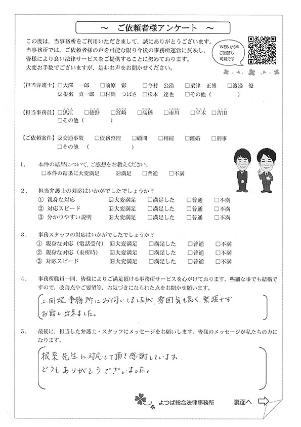 弁護士に依頼するのが初めてで不安でしたが、根來先生が物腰柔らかい感じで優しい方だったので終始安心してお任せ出来ました。