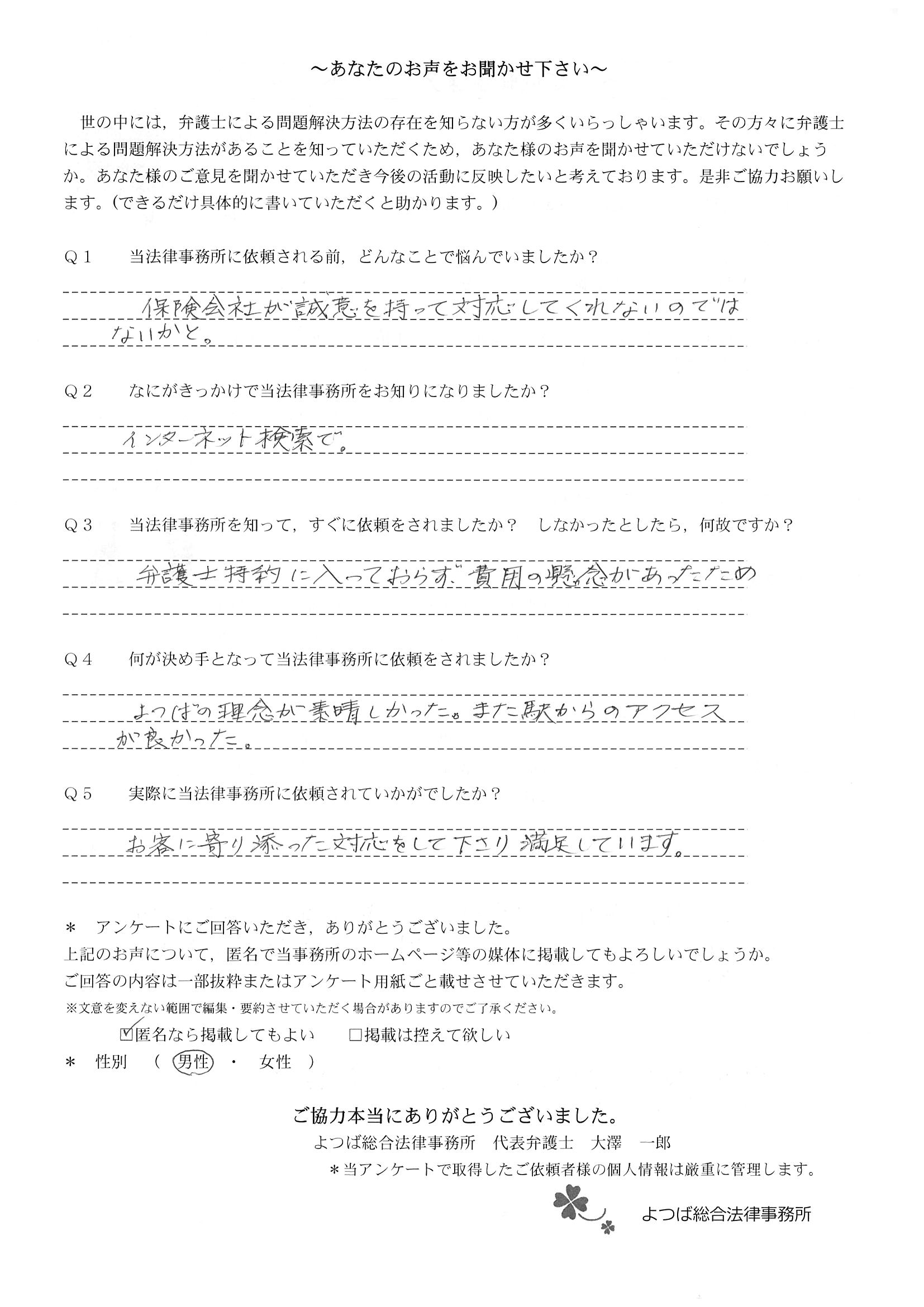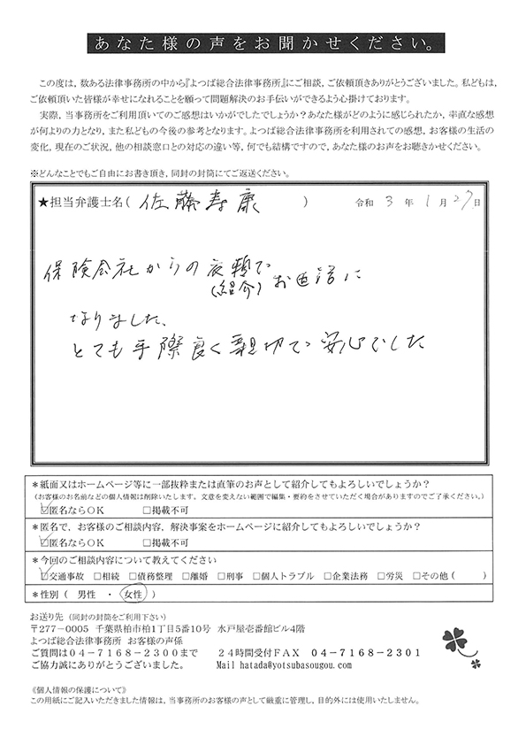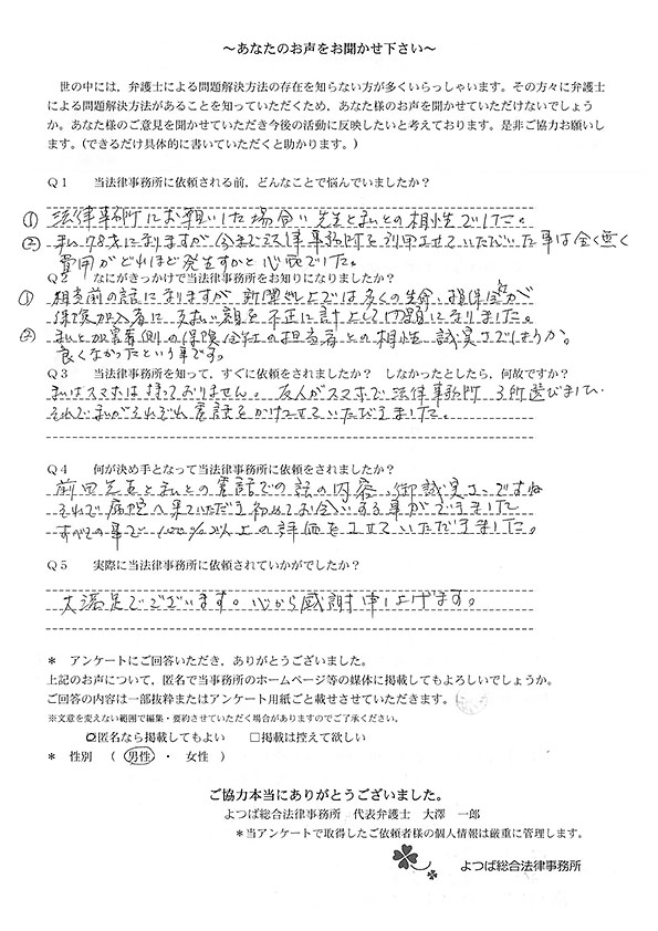 私たちは自動車保険の特約を使って、ご相談に伺いましたが、先生に入っていただくタイミング、その時までに私達がやるべき事を具体的にご教示くださり、それ以降どういうシナリオで交渉が進むのか明確にお話しくださったので安心して行動する事ができました。