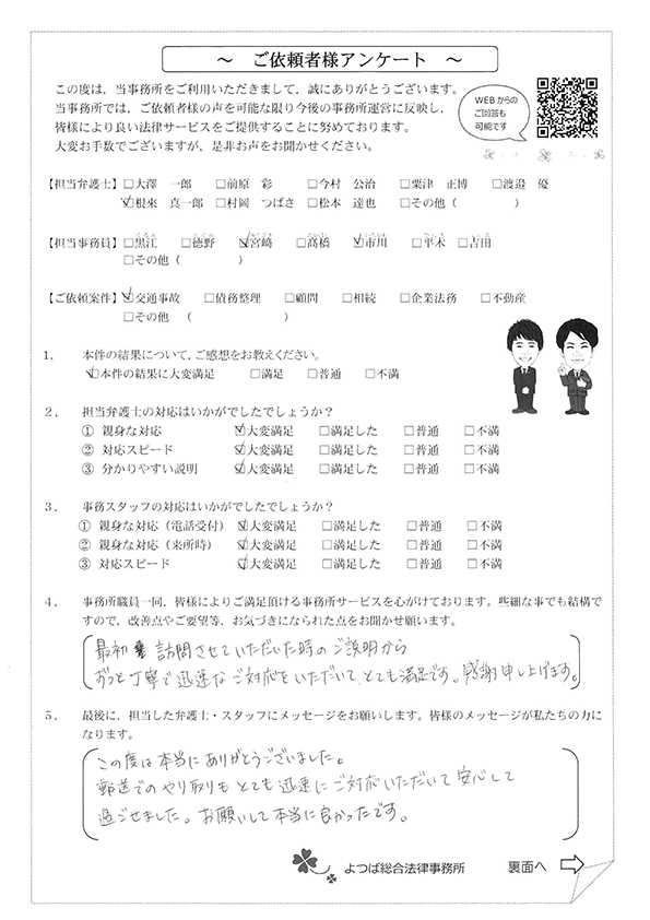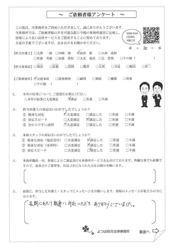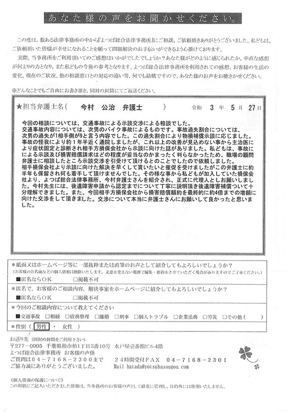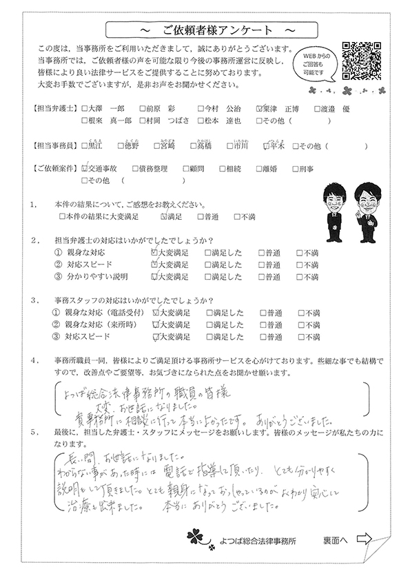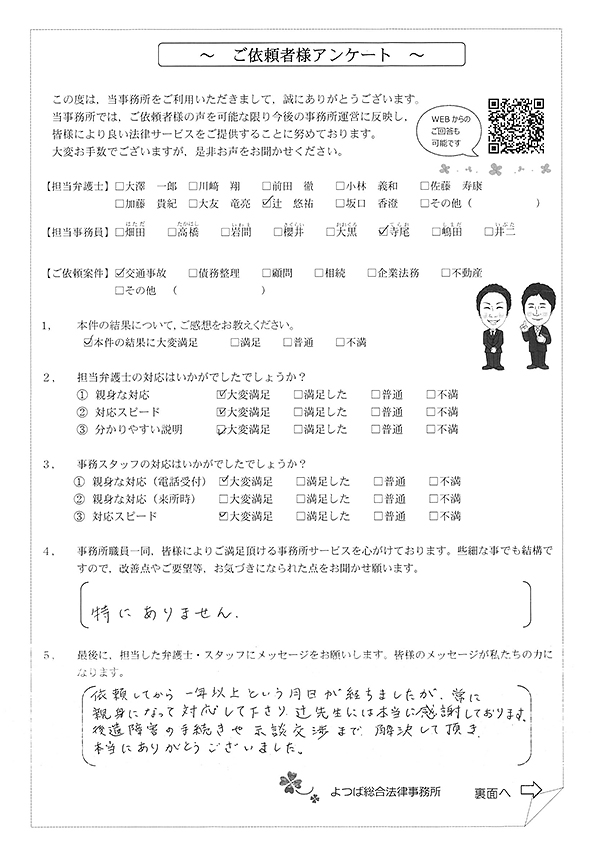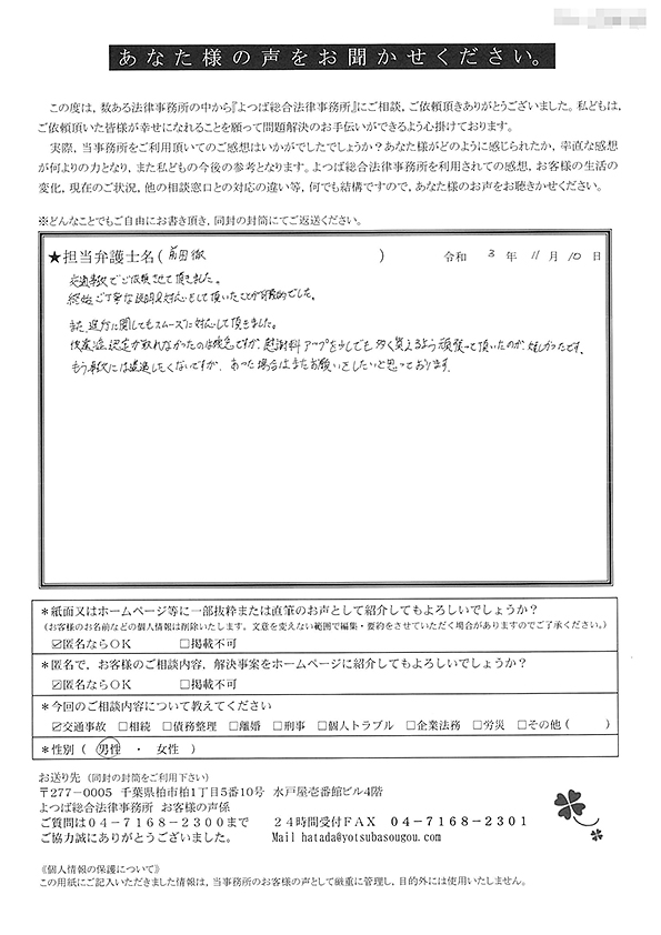 初回の相談後に依頼をしてから治療の完治まで1年以上かかってしまったのですがその間も連絡をいただき、治療の通院終了後からすぐに後遺障害認定の手続き、保険会社の交渉などをして頂き本当にありがとうございました。こちらの説明不足な電話やメールなどにもわかりやすく説明して頂き不安も無く相談やお願いなどができました。
