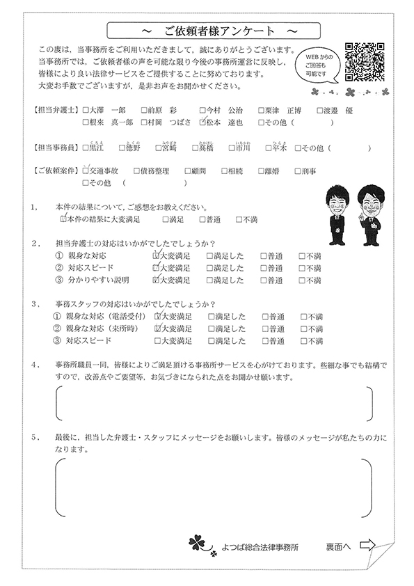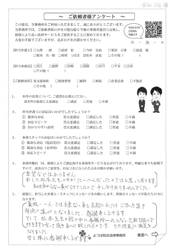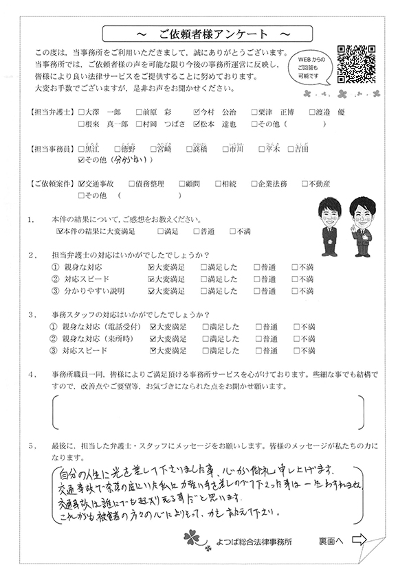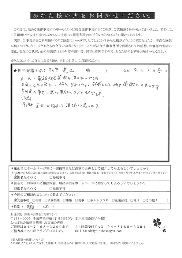 交通事故はイヤな出来事でしたが、松本先生と出会えて、素敵な優しい頼れる弁護士さんがいらっしゃることを知ることができました。