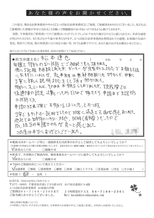 事故後遺症のため事務所の訪問が(移動)が難しい為、電話とe-メールだけでのやり取りとなりましたが、とても丁寧に且つ迅速に対応して頂きました。ありがとうございました。