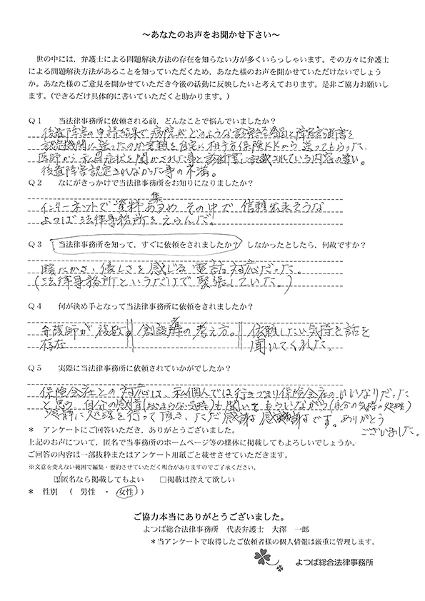 後遺障害の手続きや示談交渉まで解決して頂き、本当にありがとうございました。
