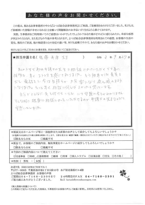 自分がどんなに気を付けていても、いつ災難にあうかわかりません。そんなときに親身になって頂けるのが弁護士の先生なのだと実感致しました。