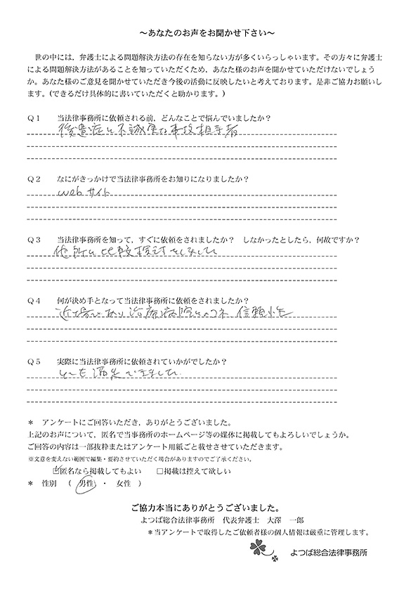 弁護士ドットコムのサイトでこちらを知り、すぐ依頼を決めた。