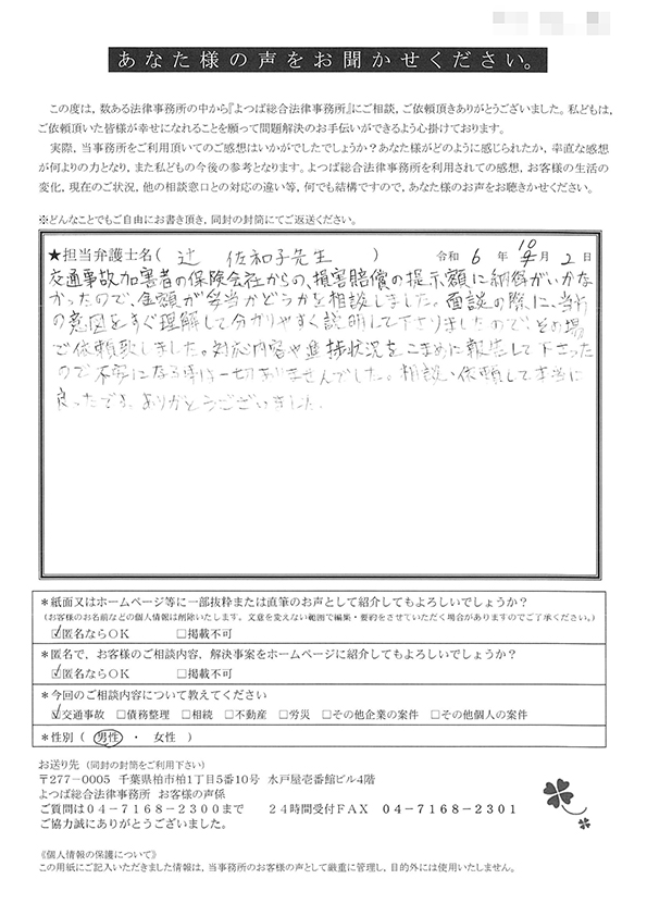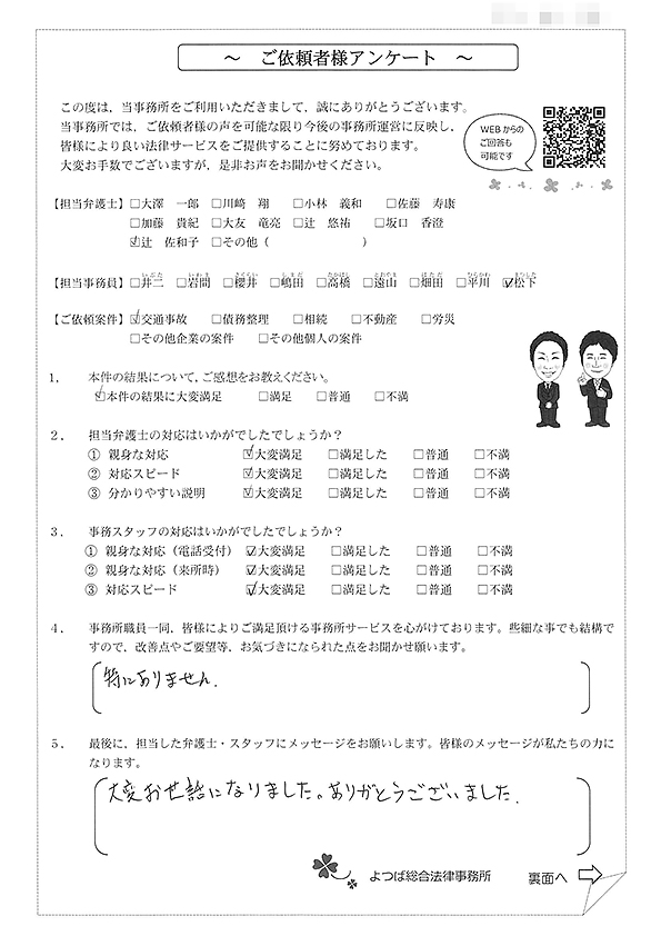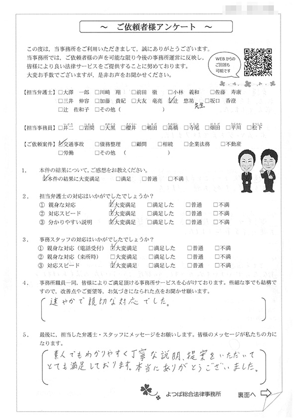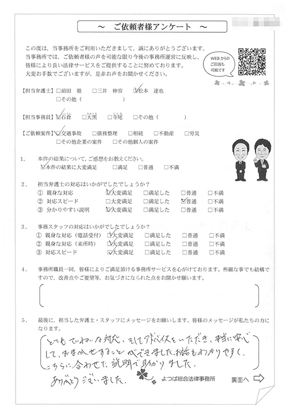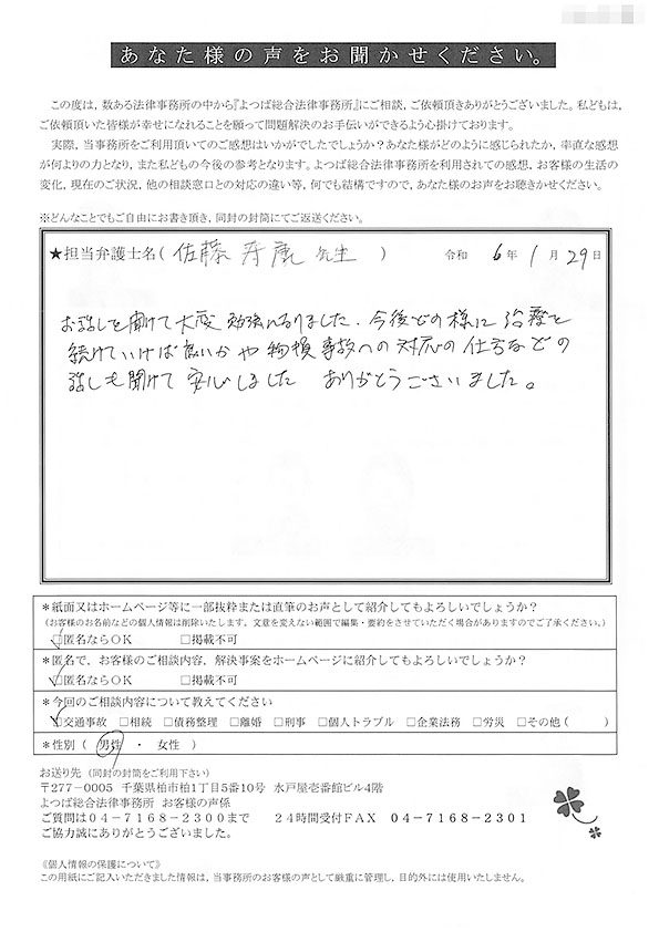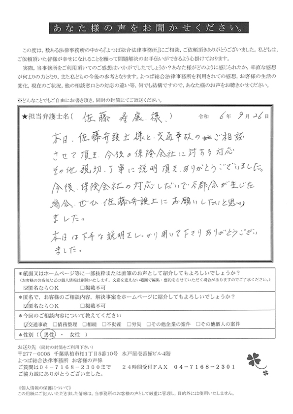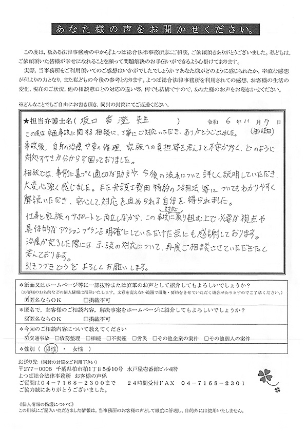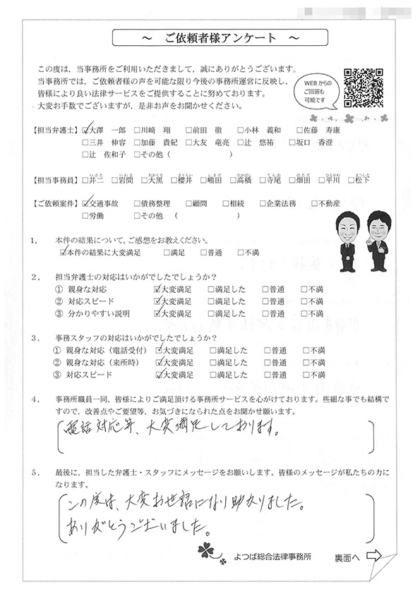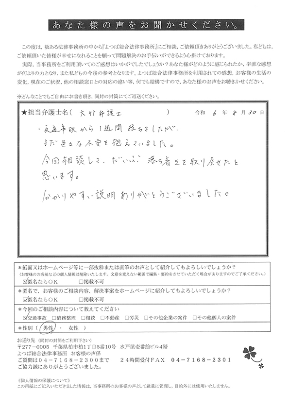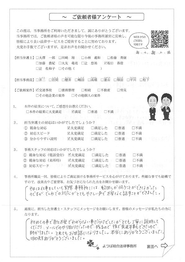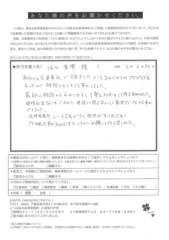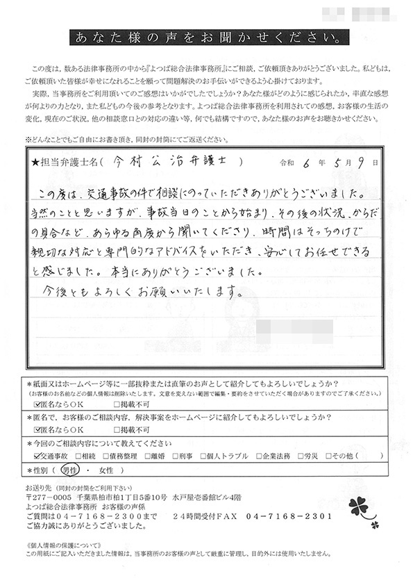 この度は交通事故に関する相談に丁寧にご対応いただき、ありがとうございました。