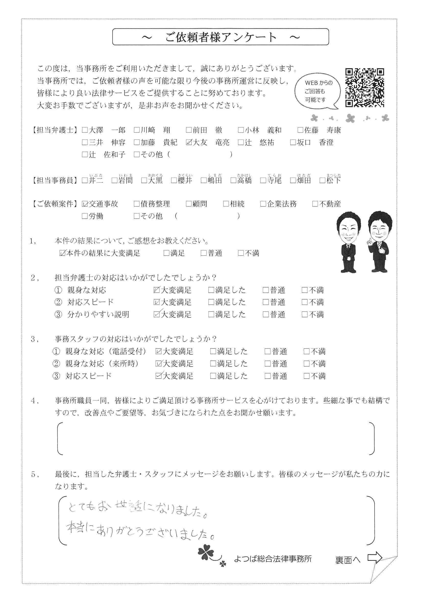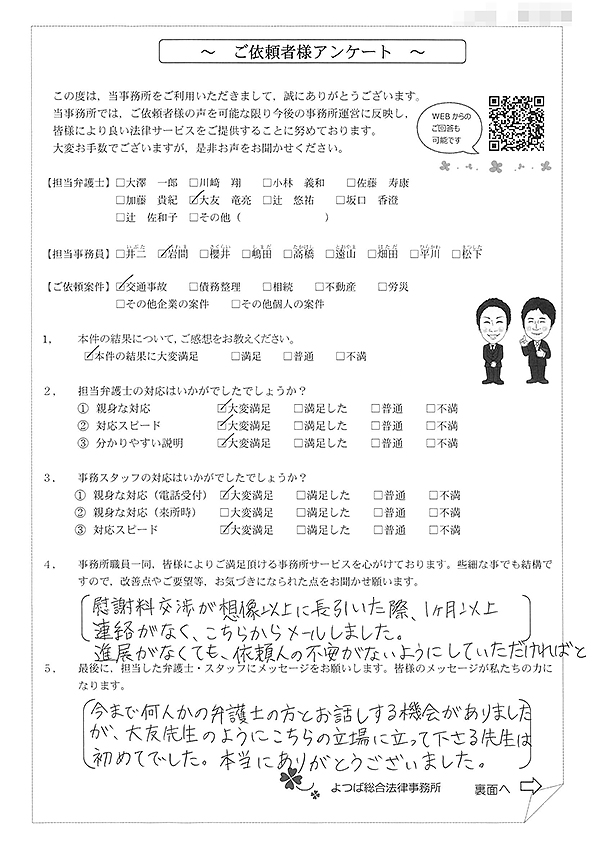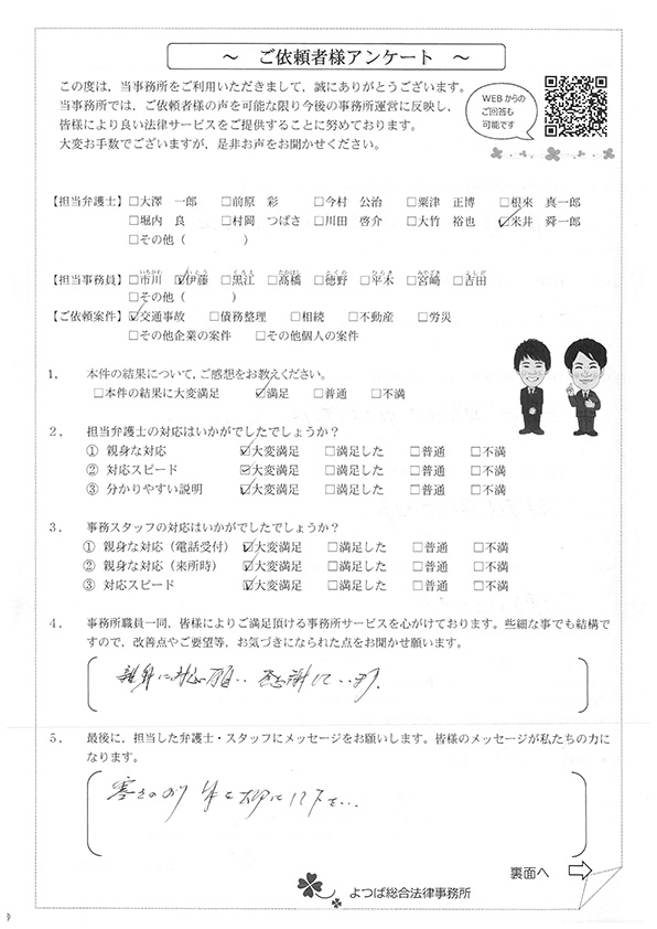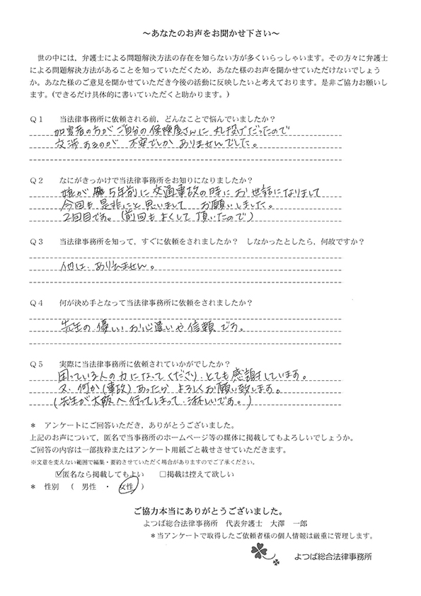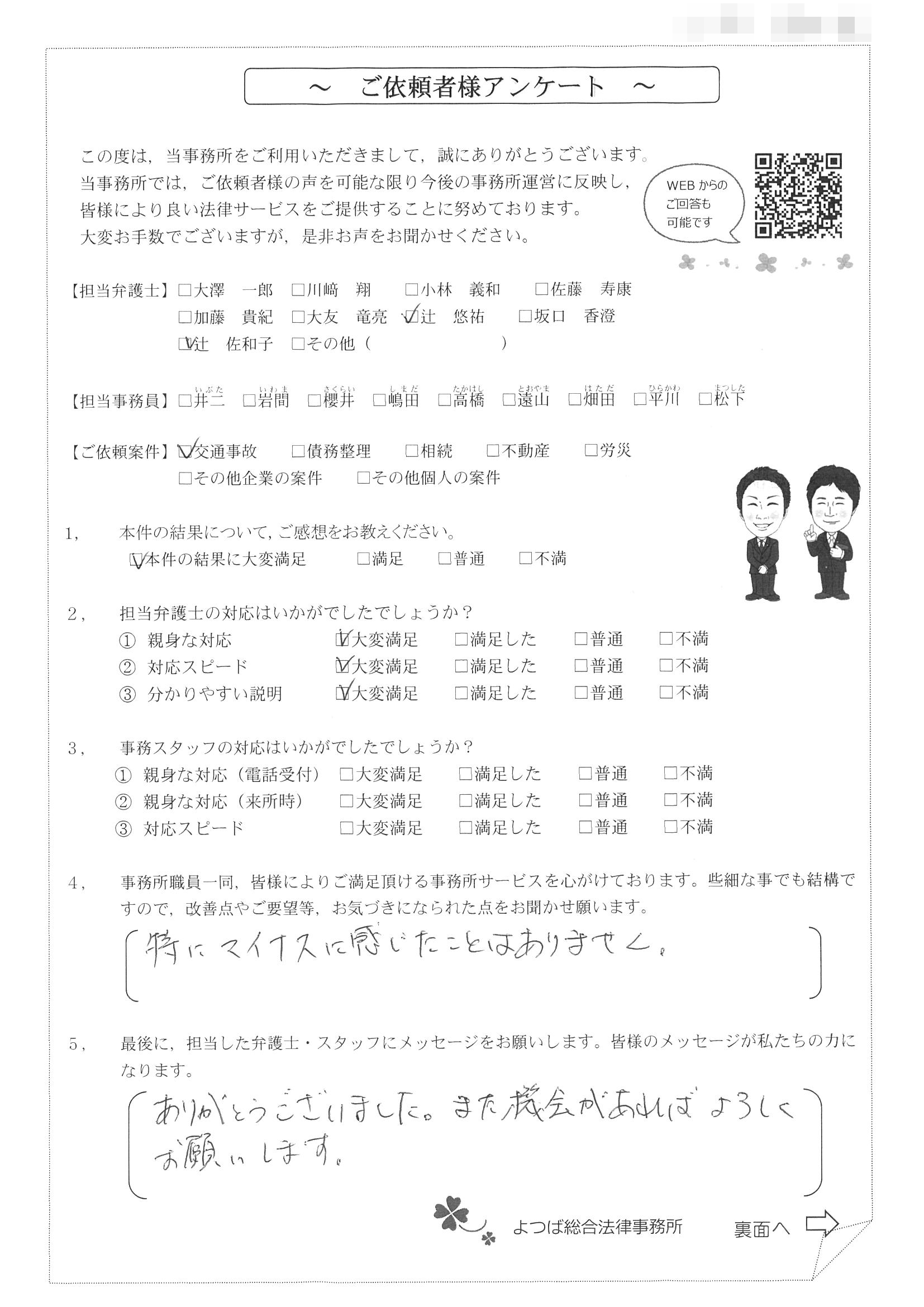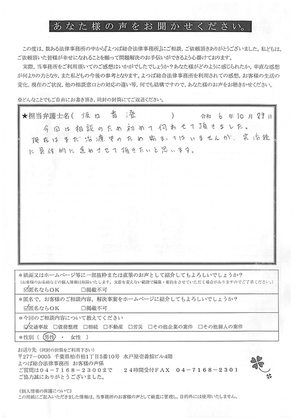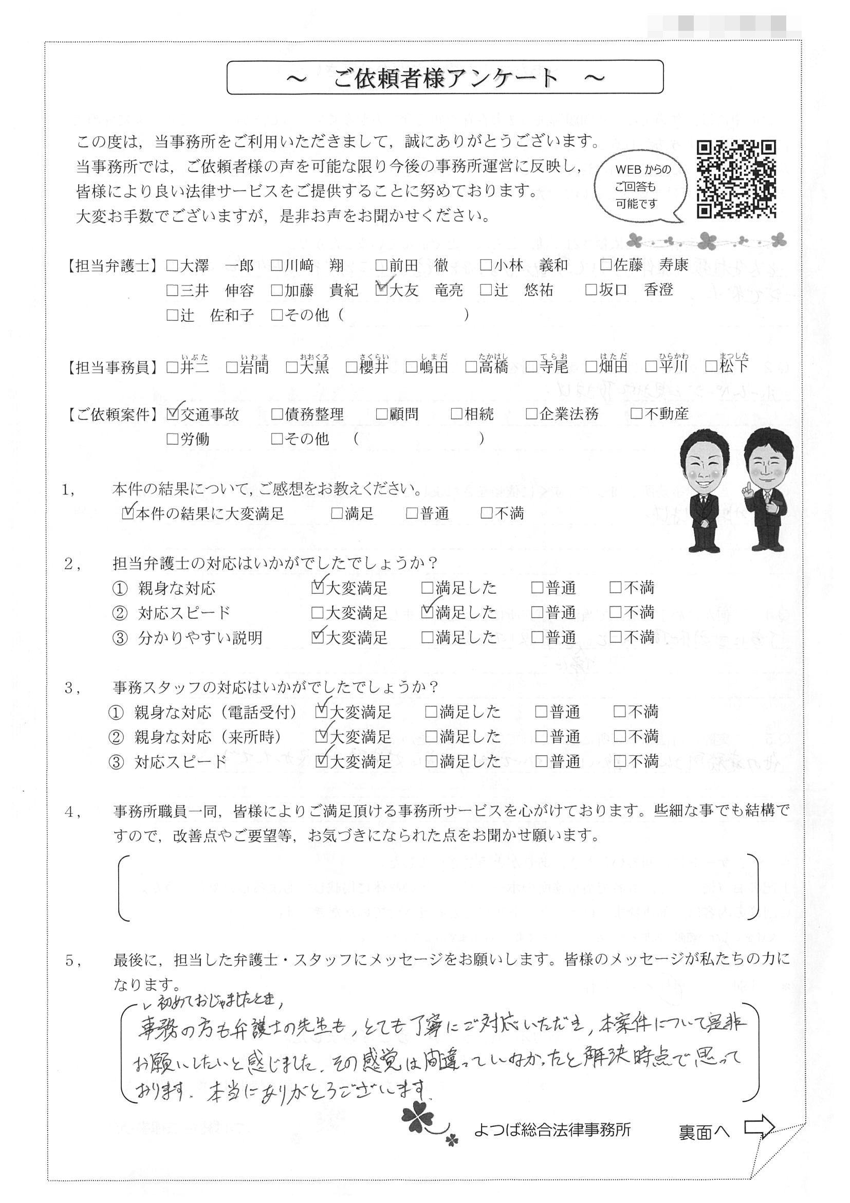 この度は交通事故に関する相談に丁寧にご対応いただき、ありがとうございました。