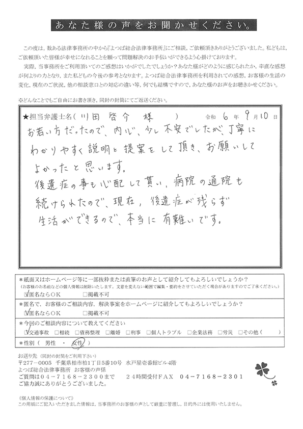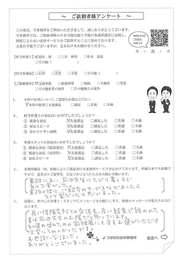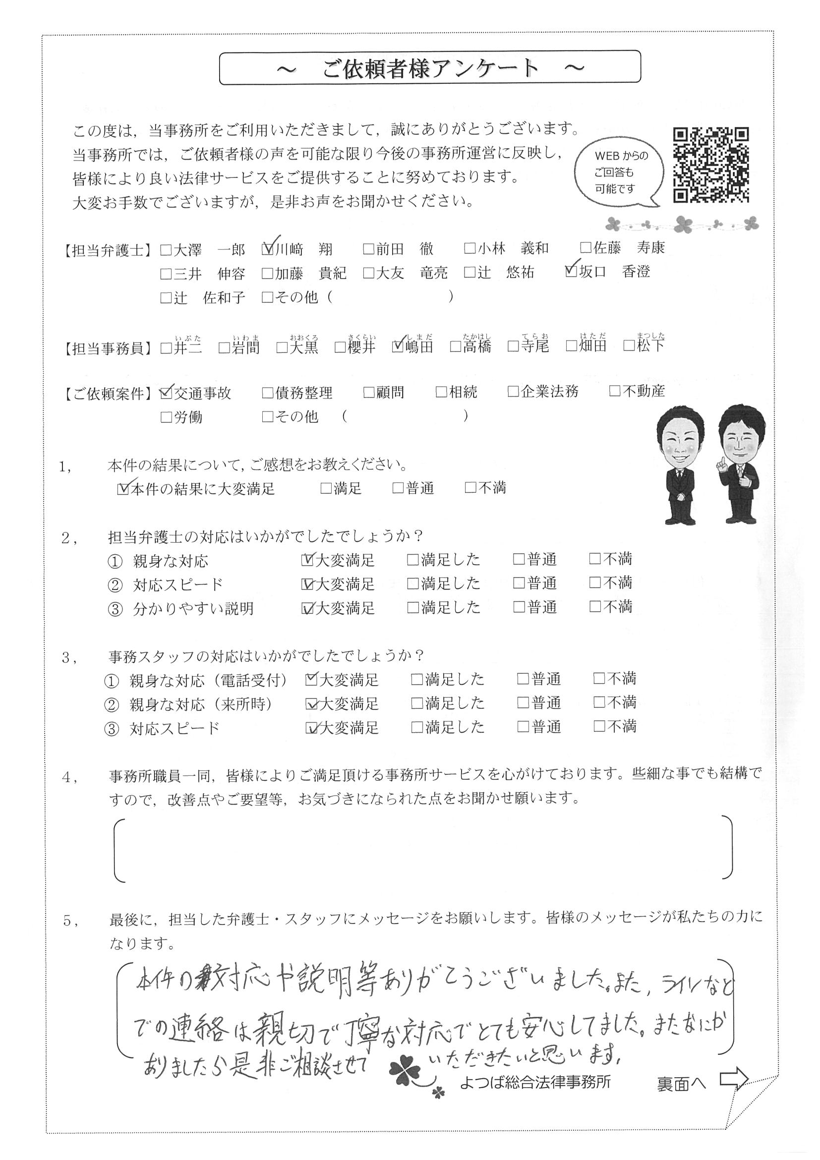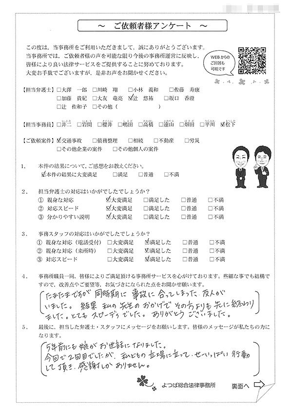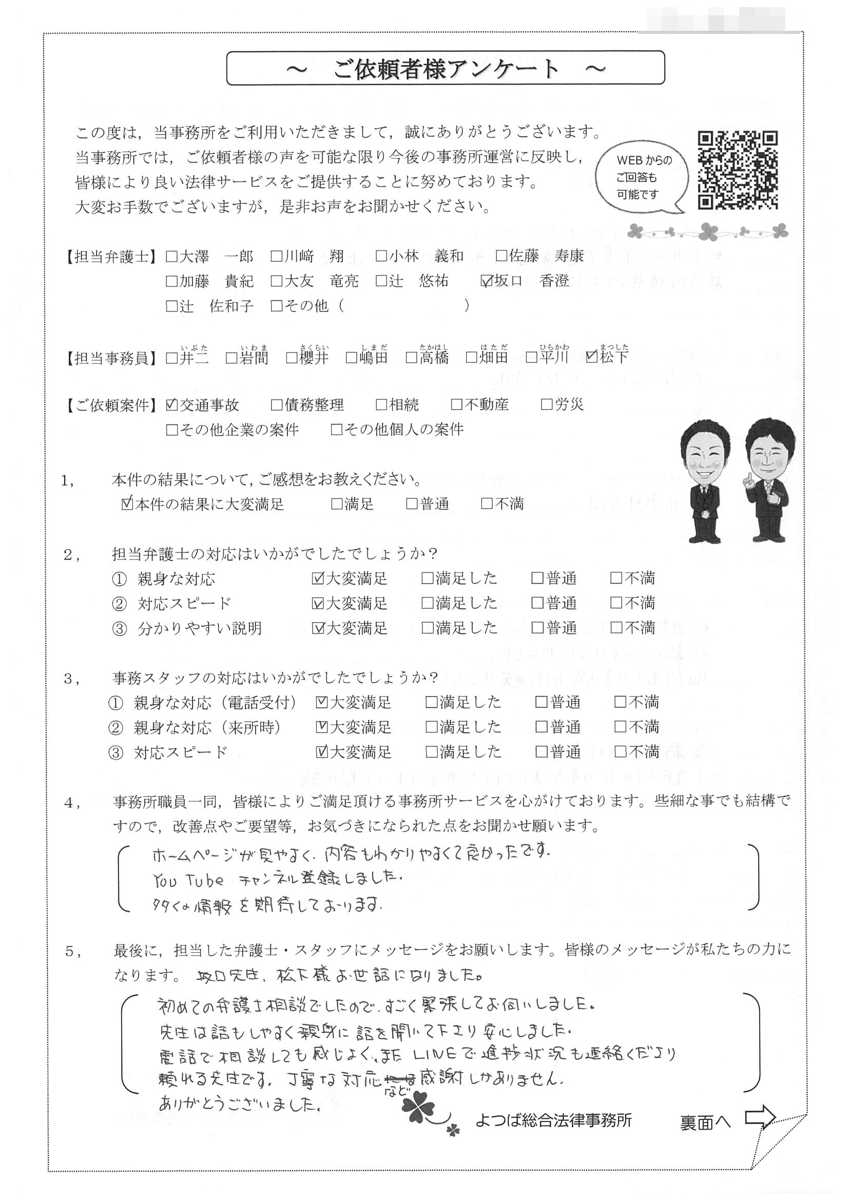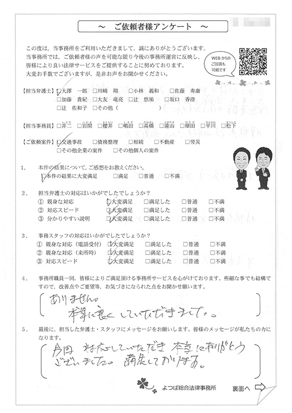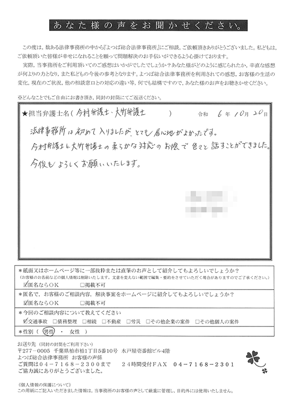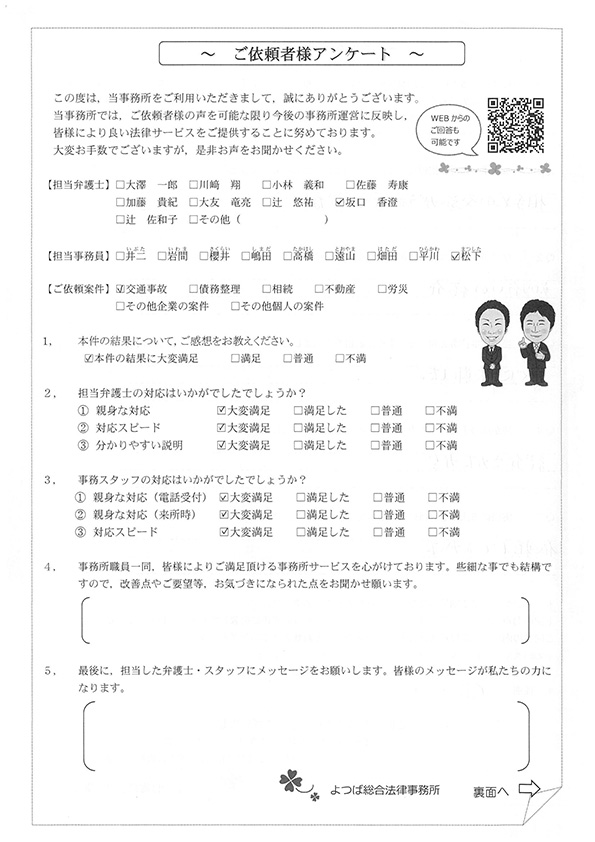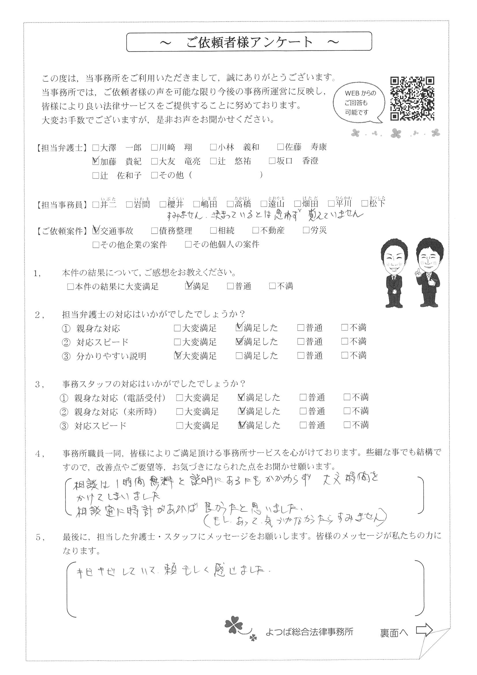 この度は交通事故に関する相談に丁寧にご対応いただき、ありがとうございました。