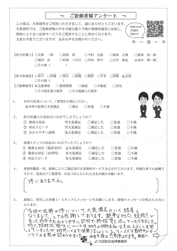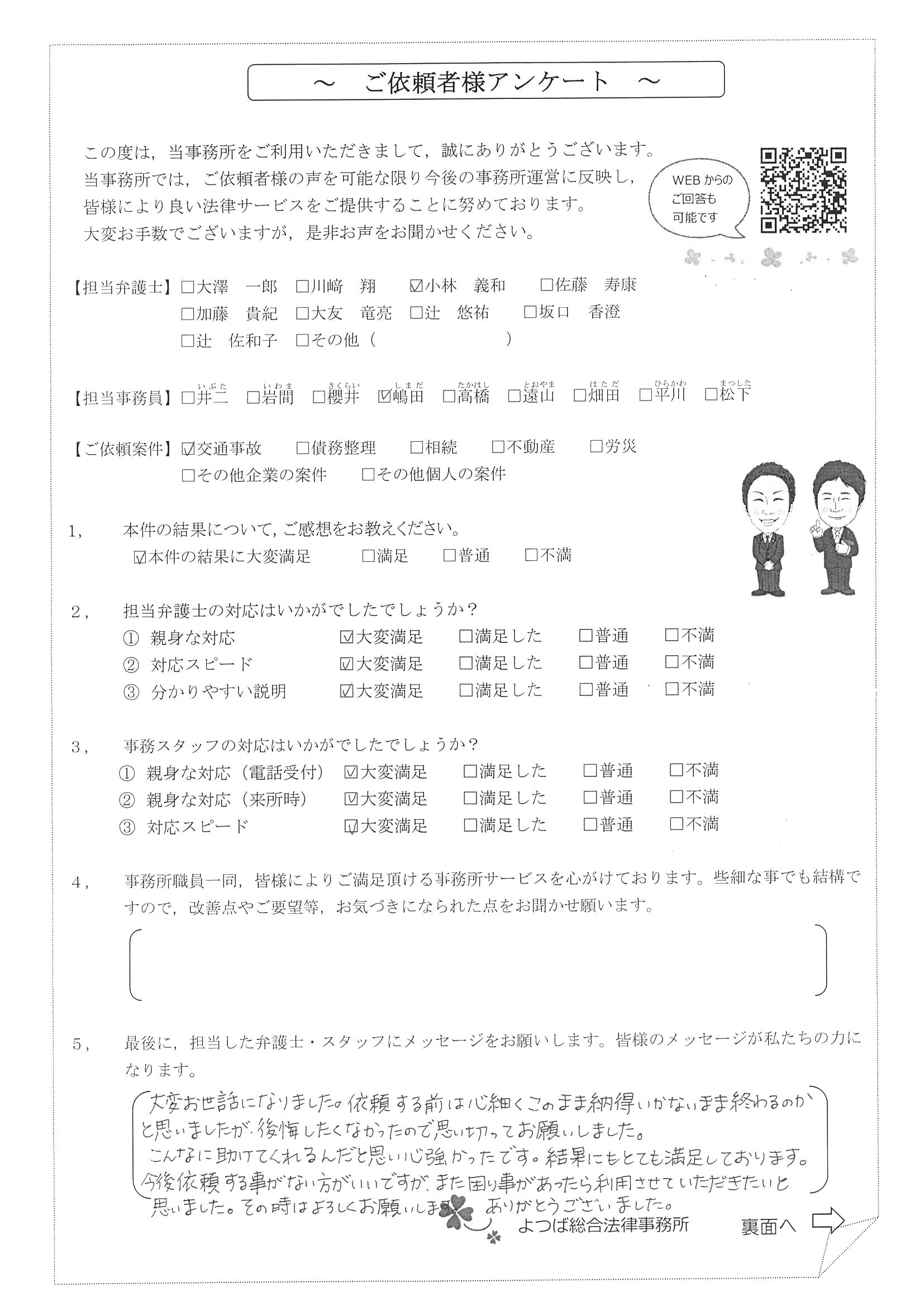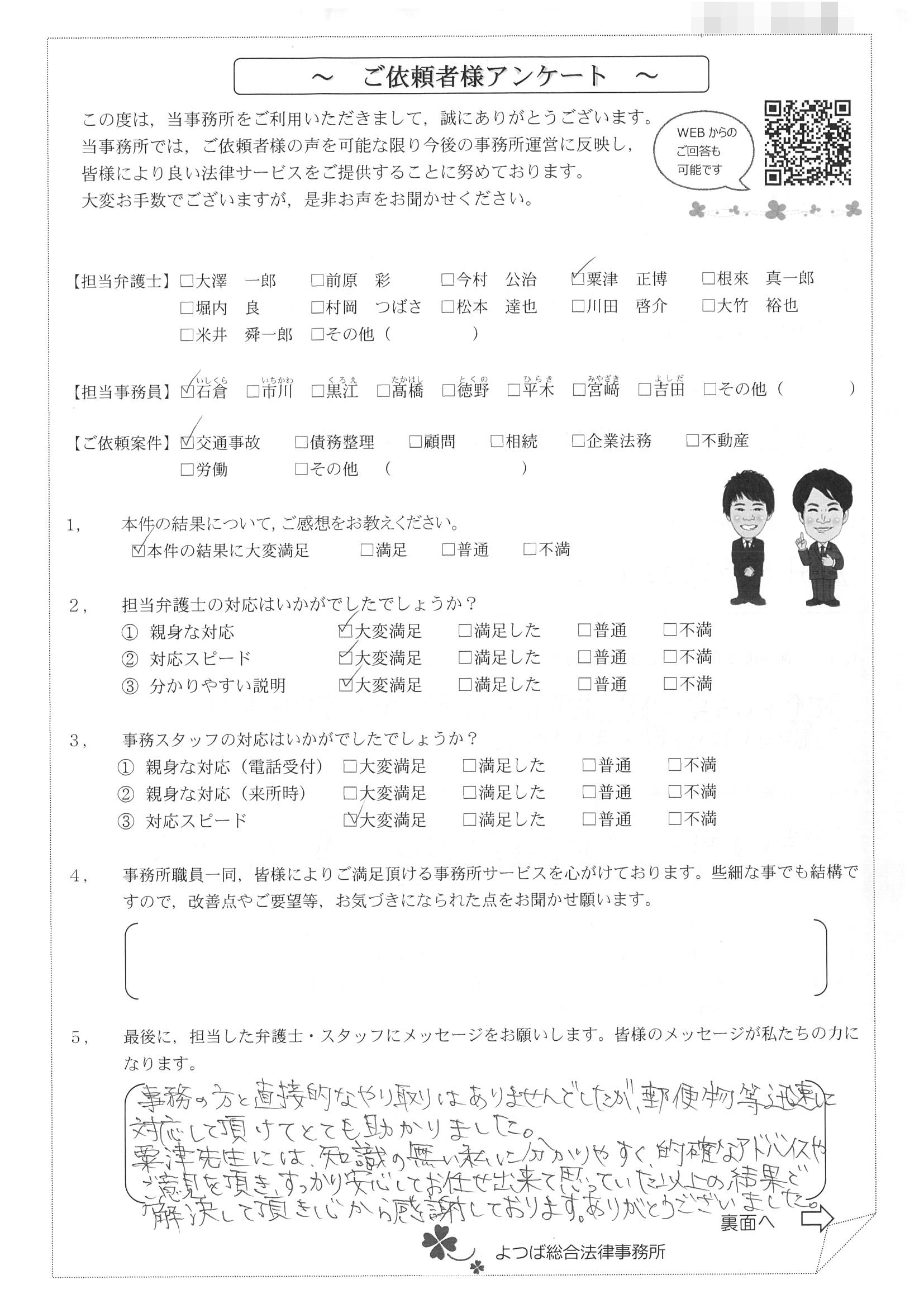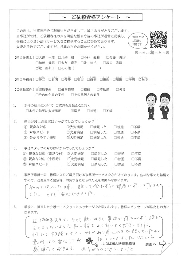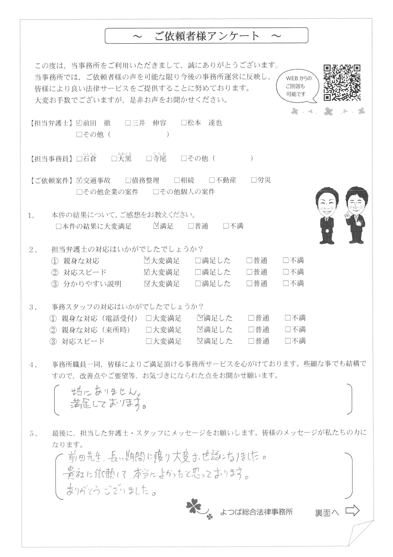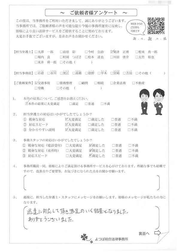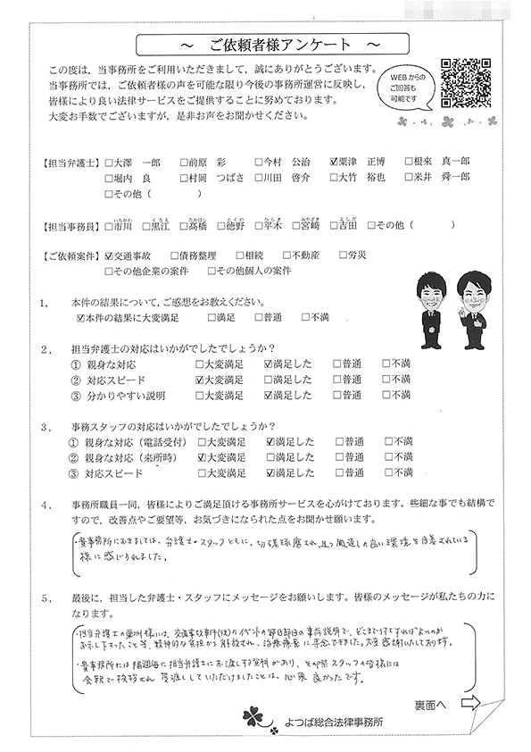 この度は交通事故に関する相談に丁寧にご対応いただき、ありがとうございました。