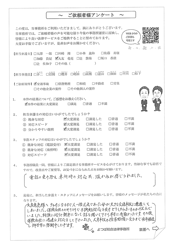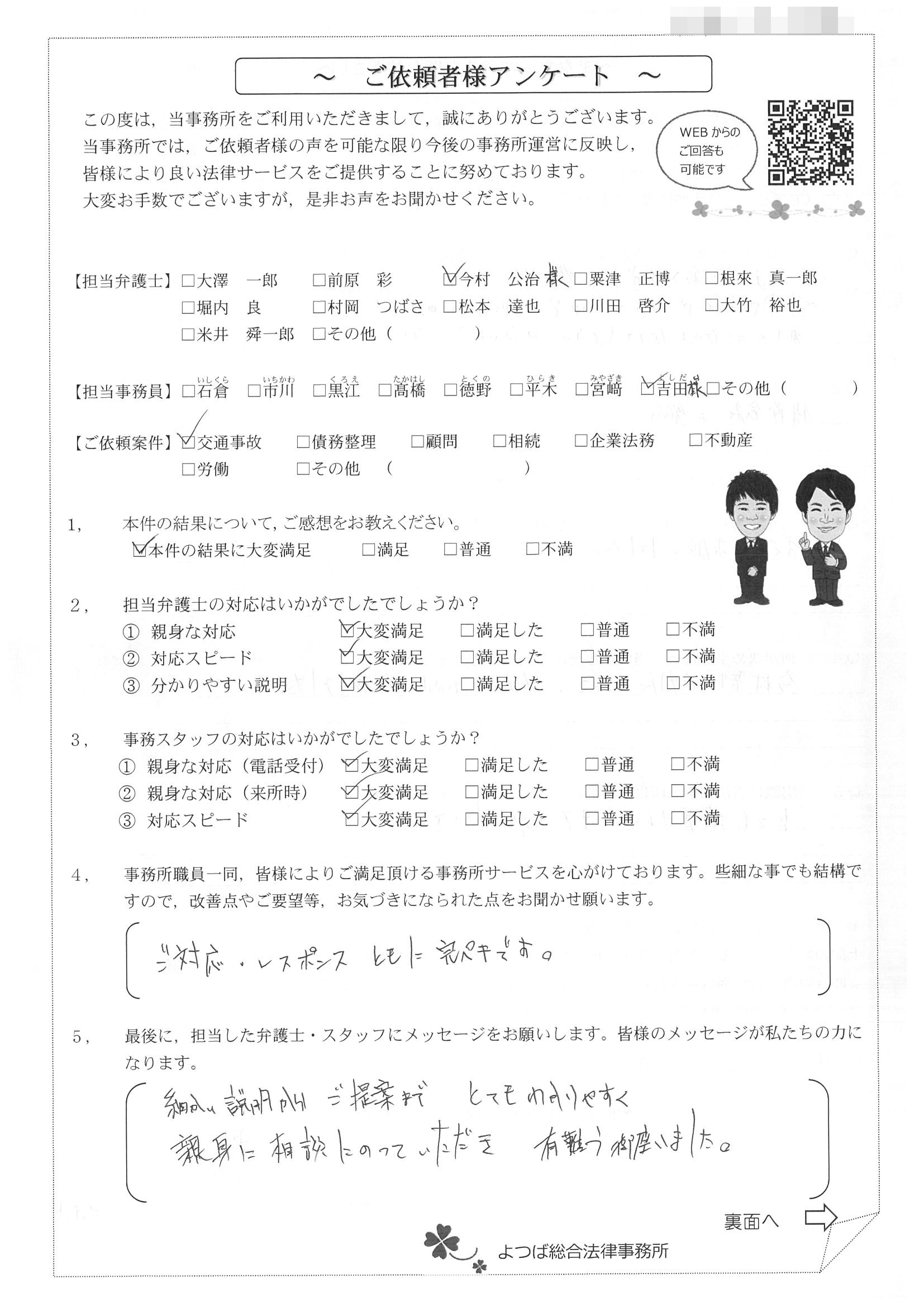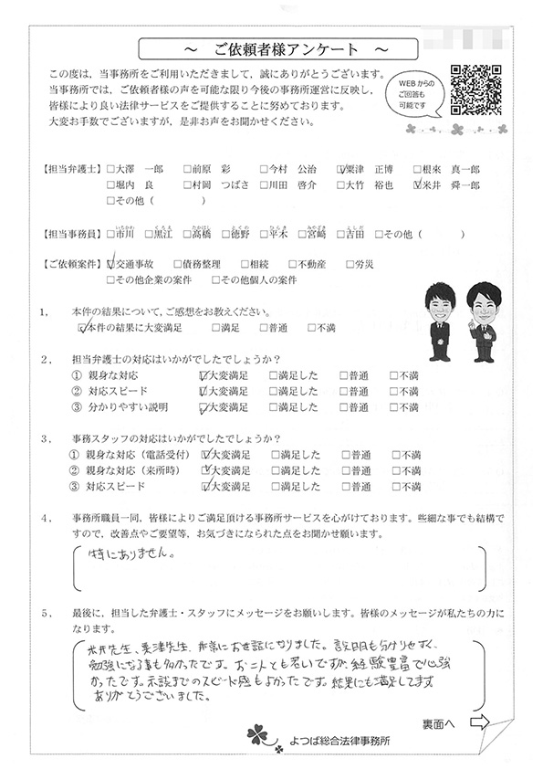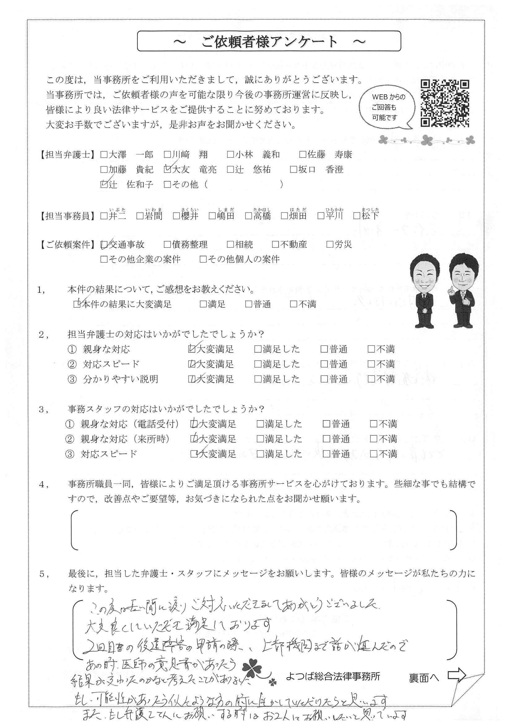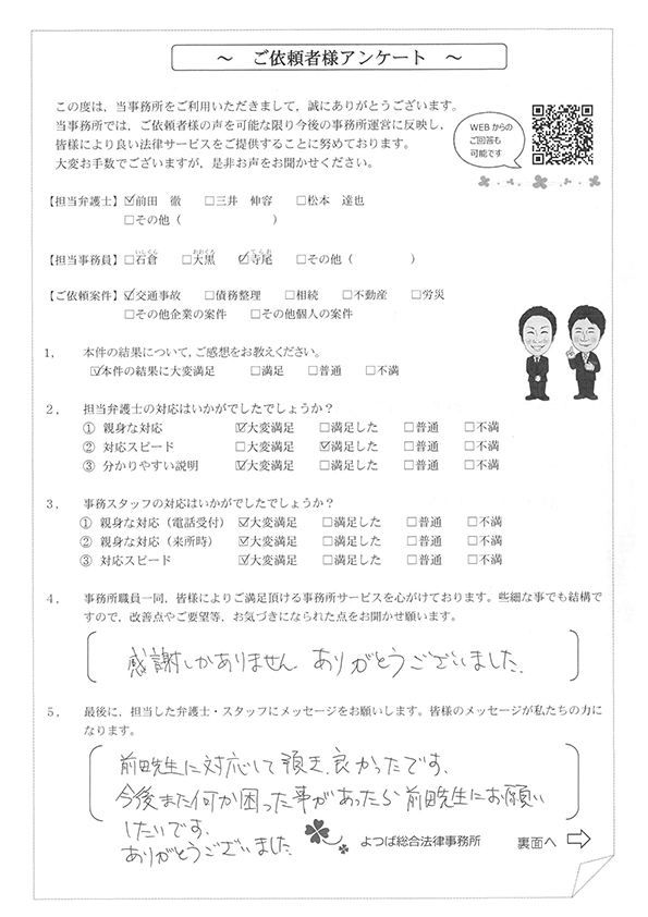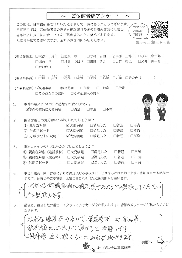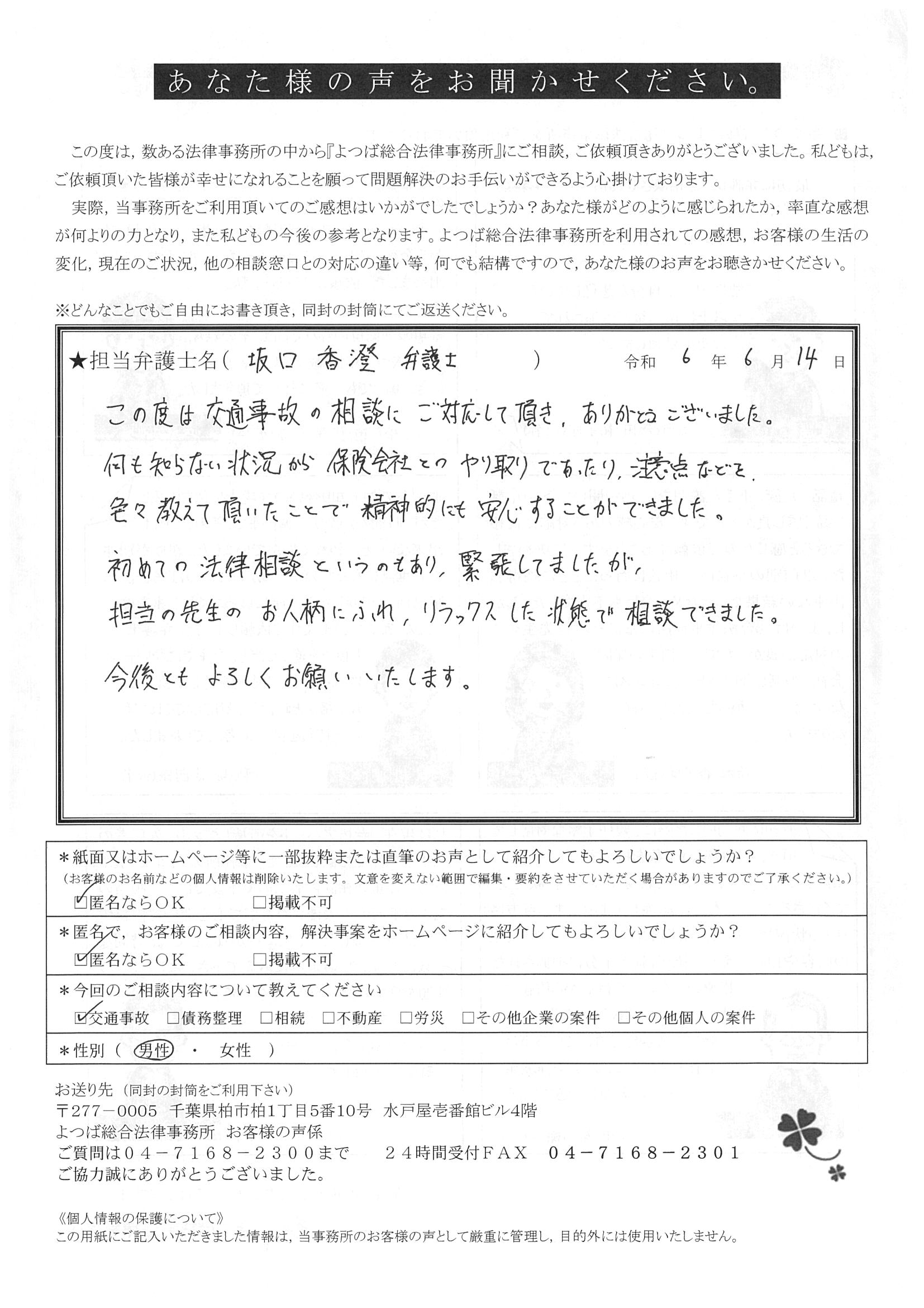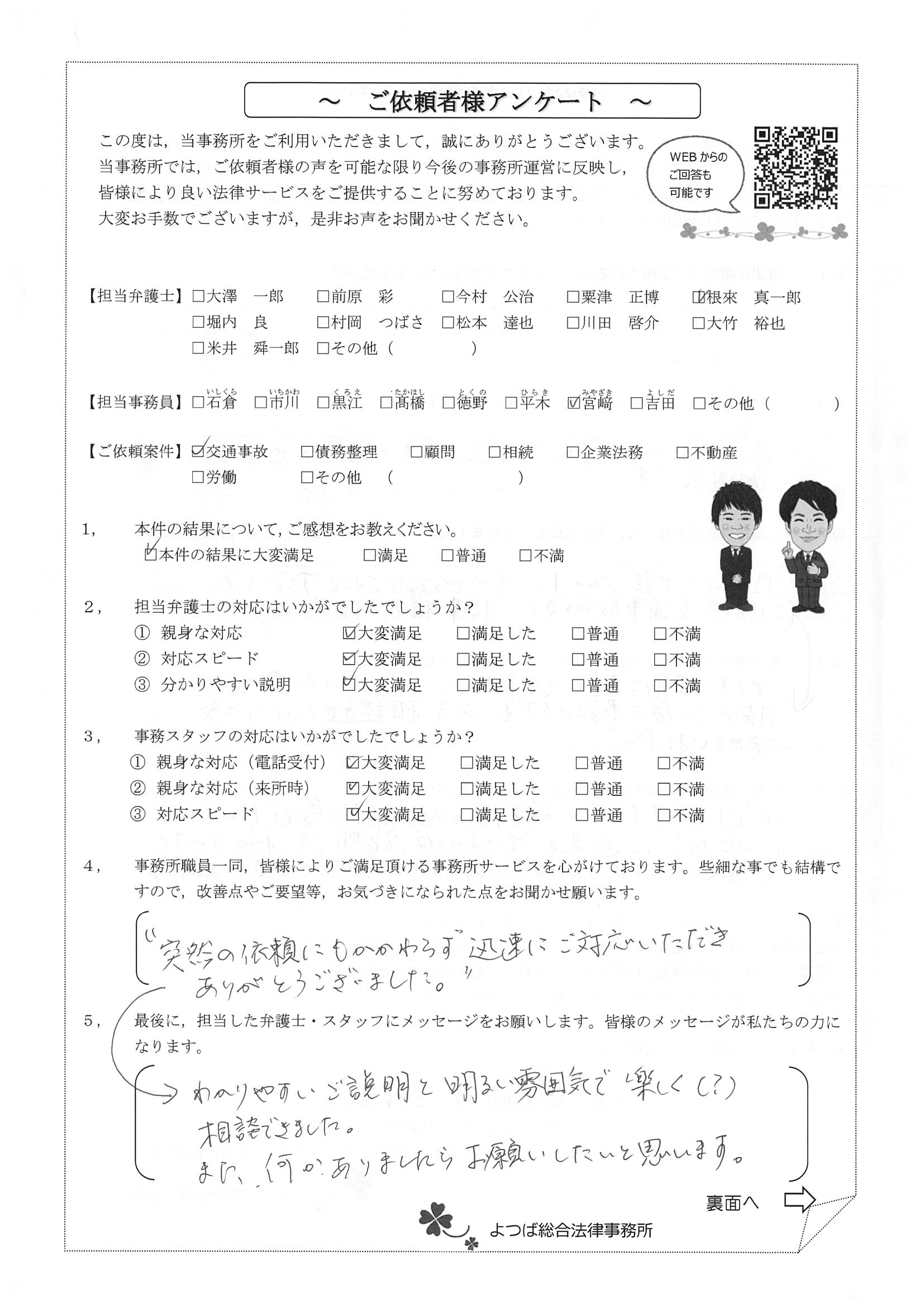 この度は交通事故に関する相談に丁寧にご対応いただき、ありがとうございました。