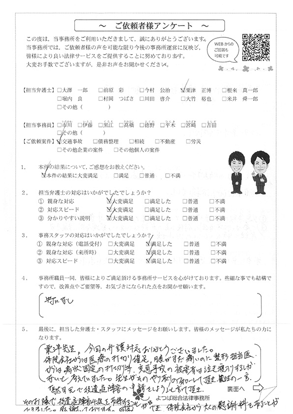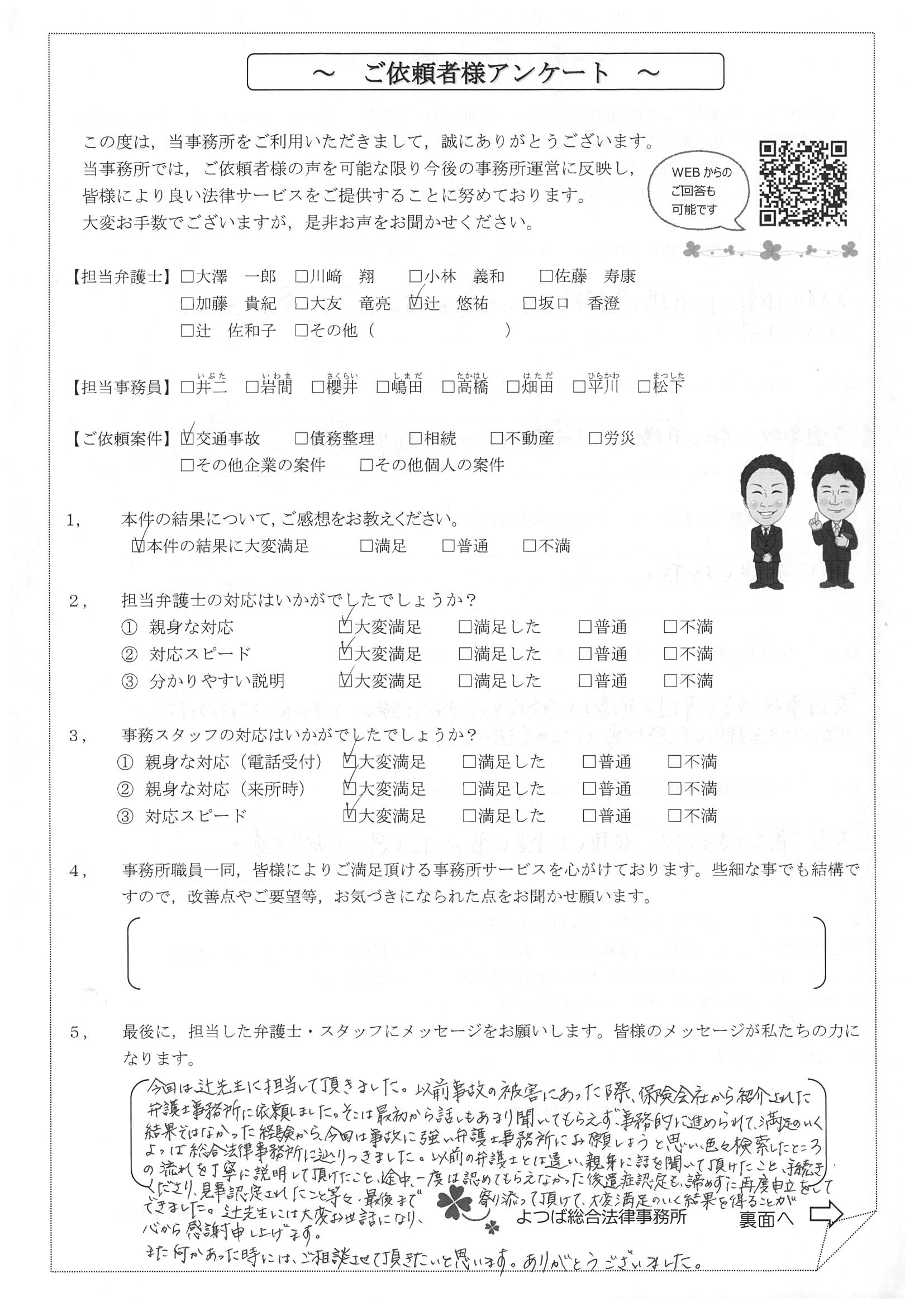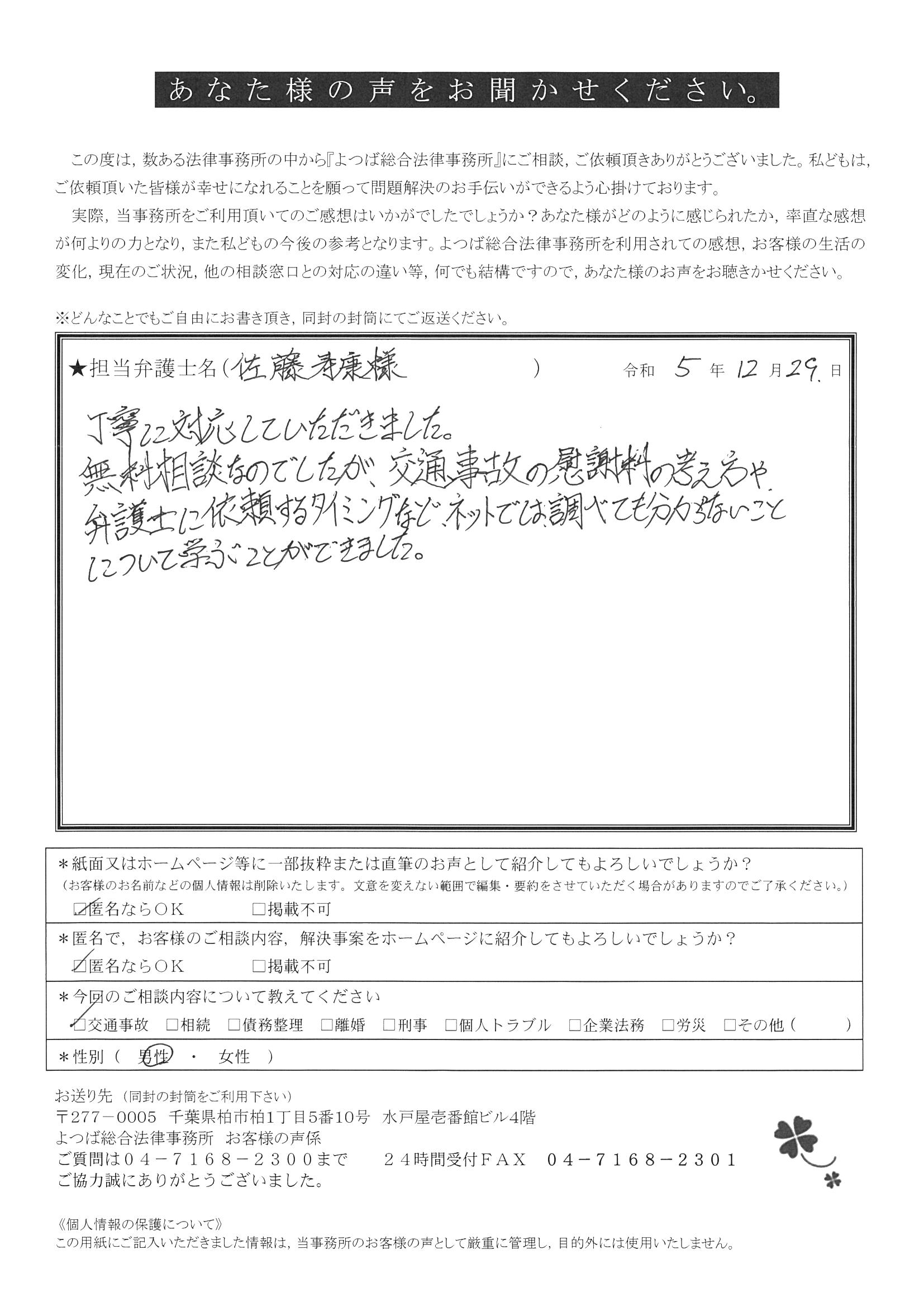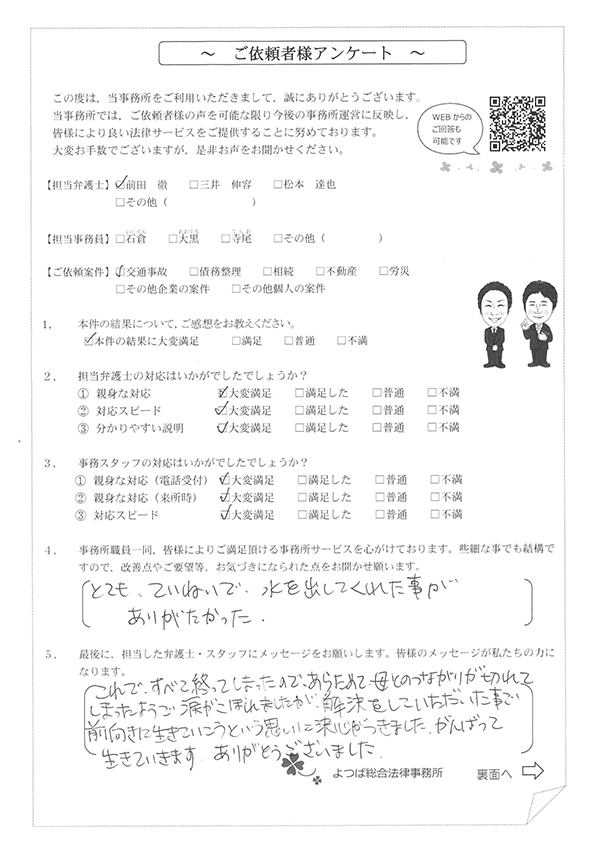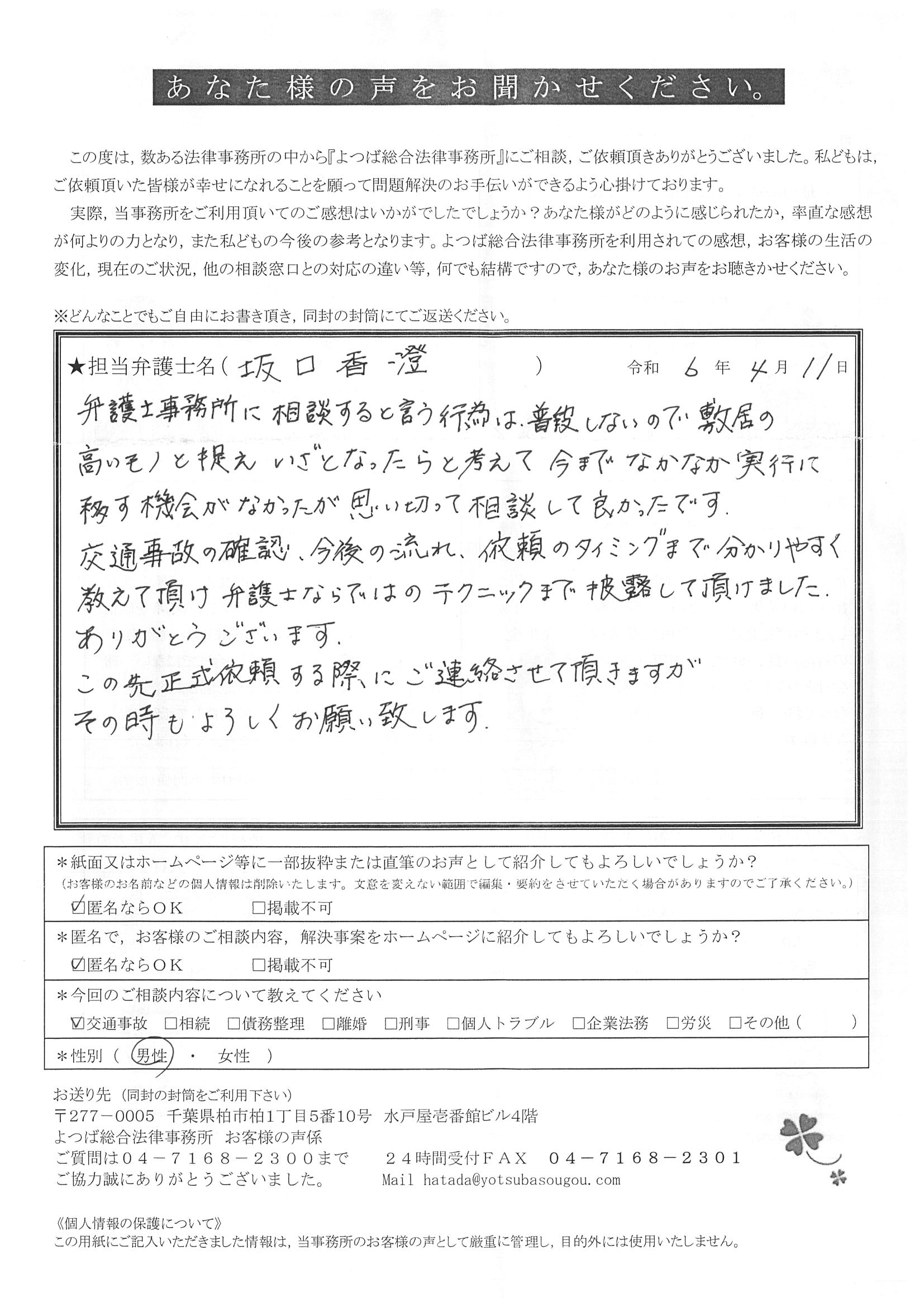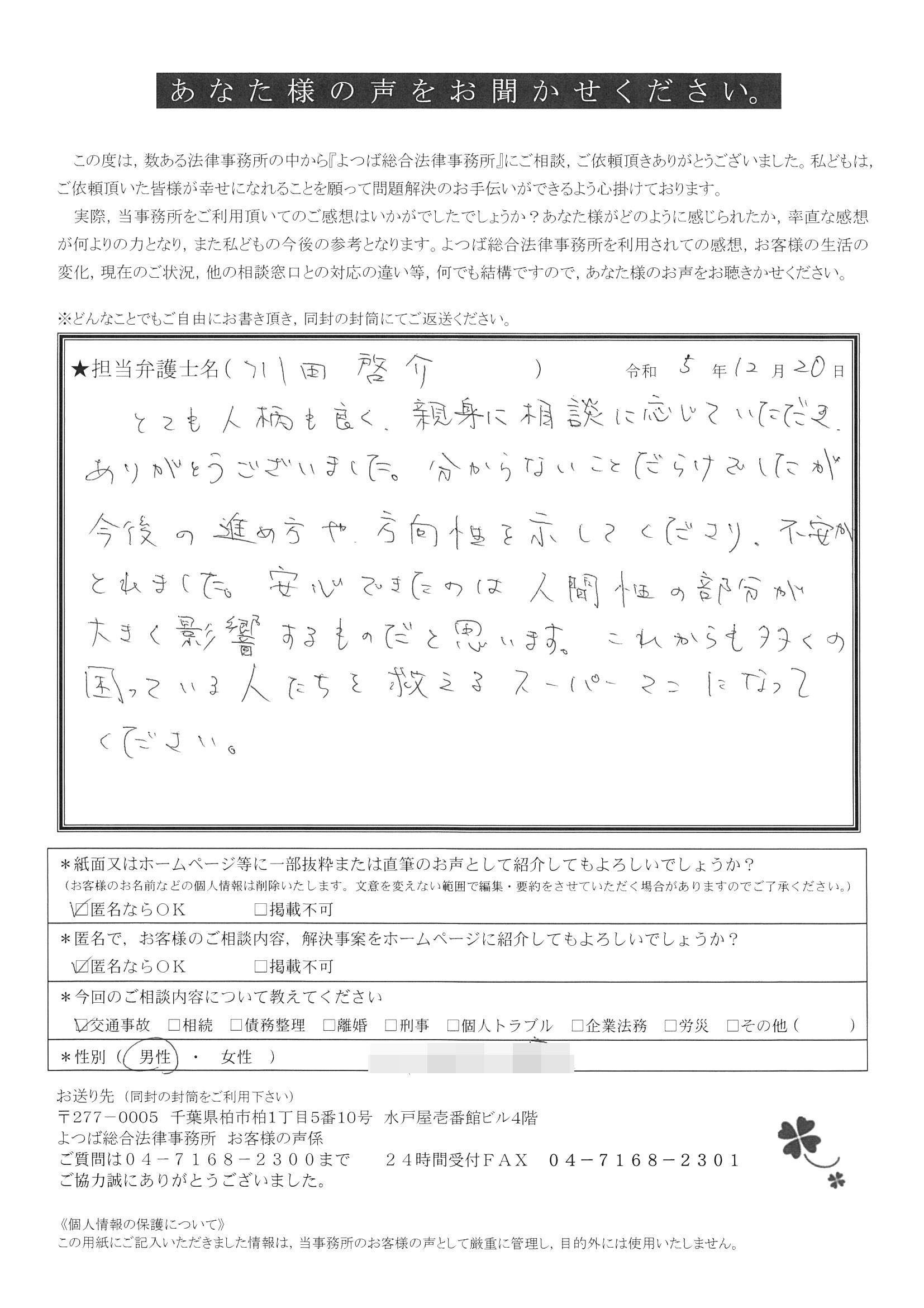 この度は交通事故に関する相談に丁寧にご対応いただき、ありがとうございました。