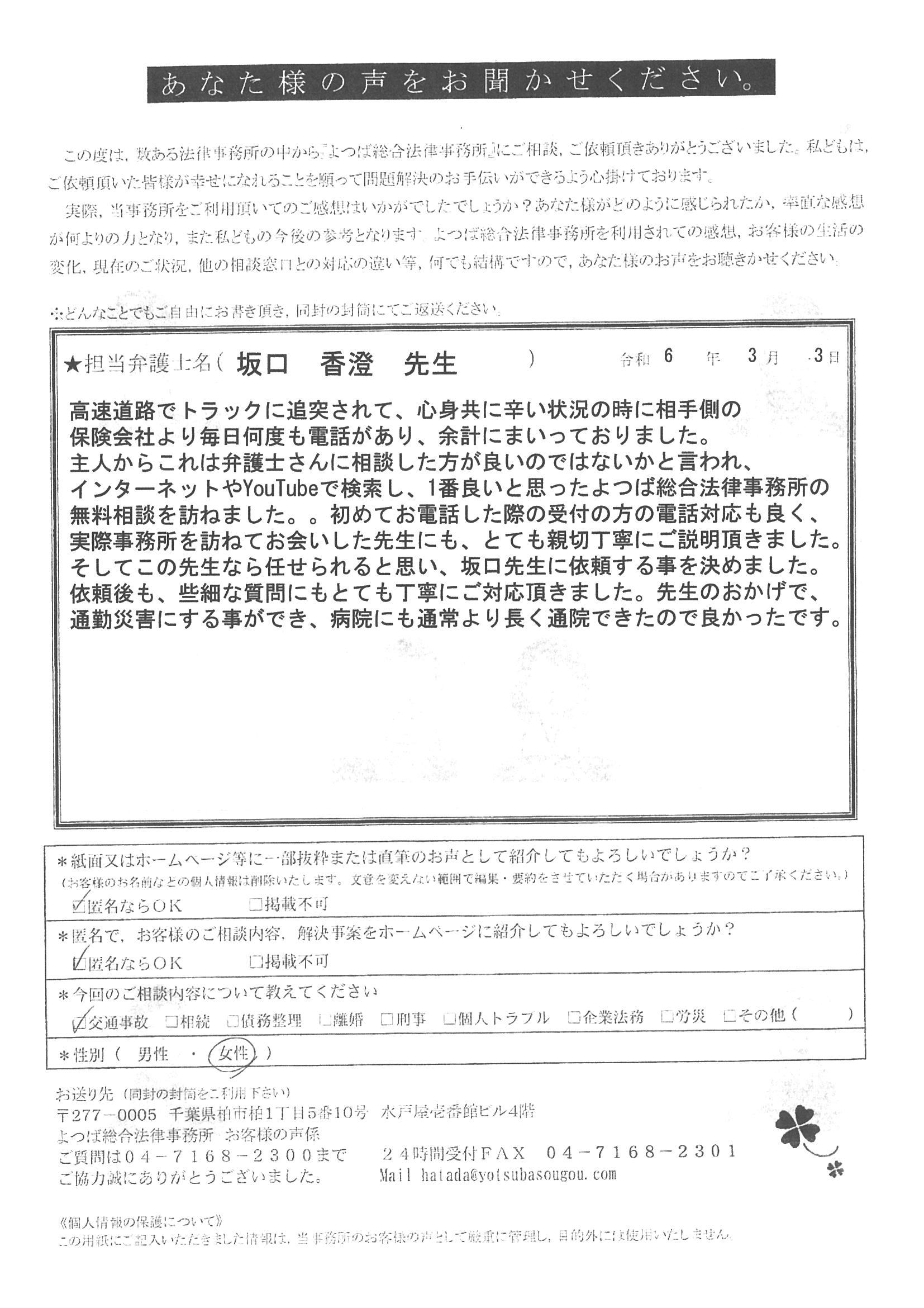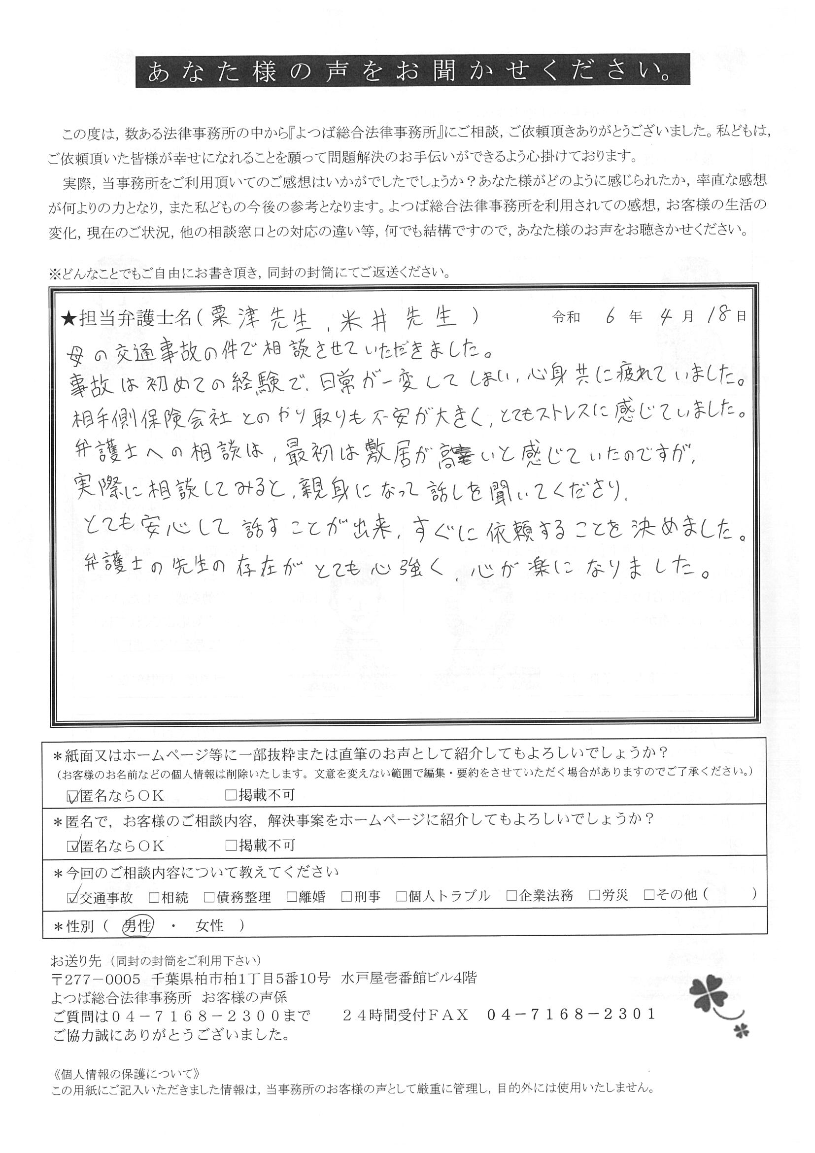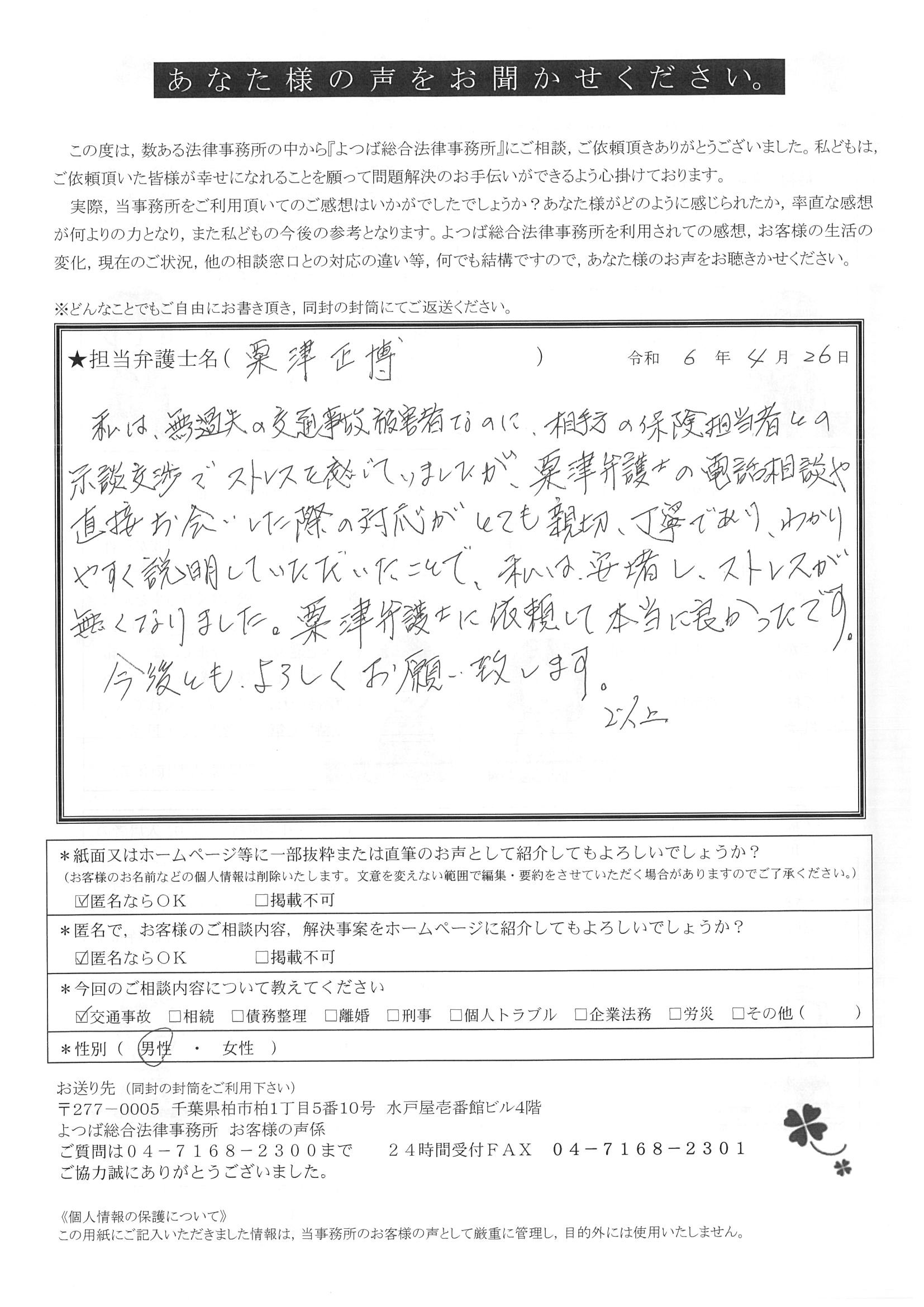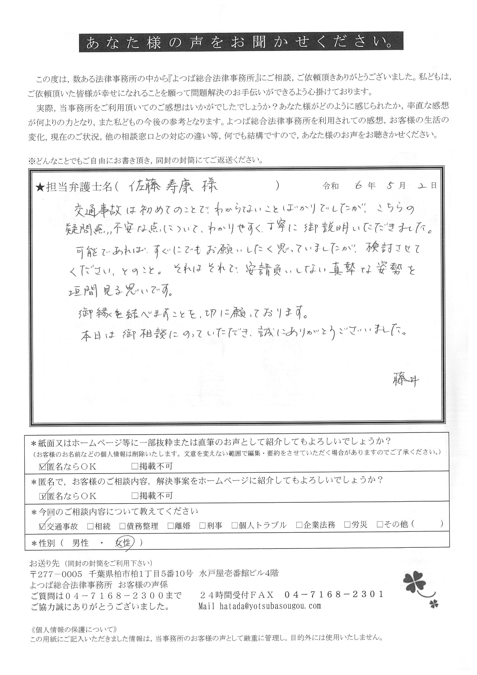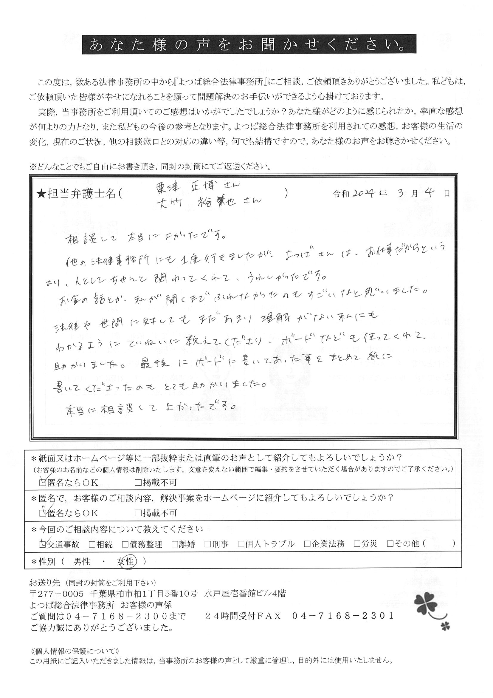 この度は交通事故に関する相談に丁寧にご対応いただき、ありがとうございました。