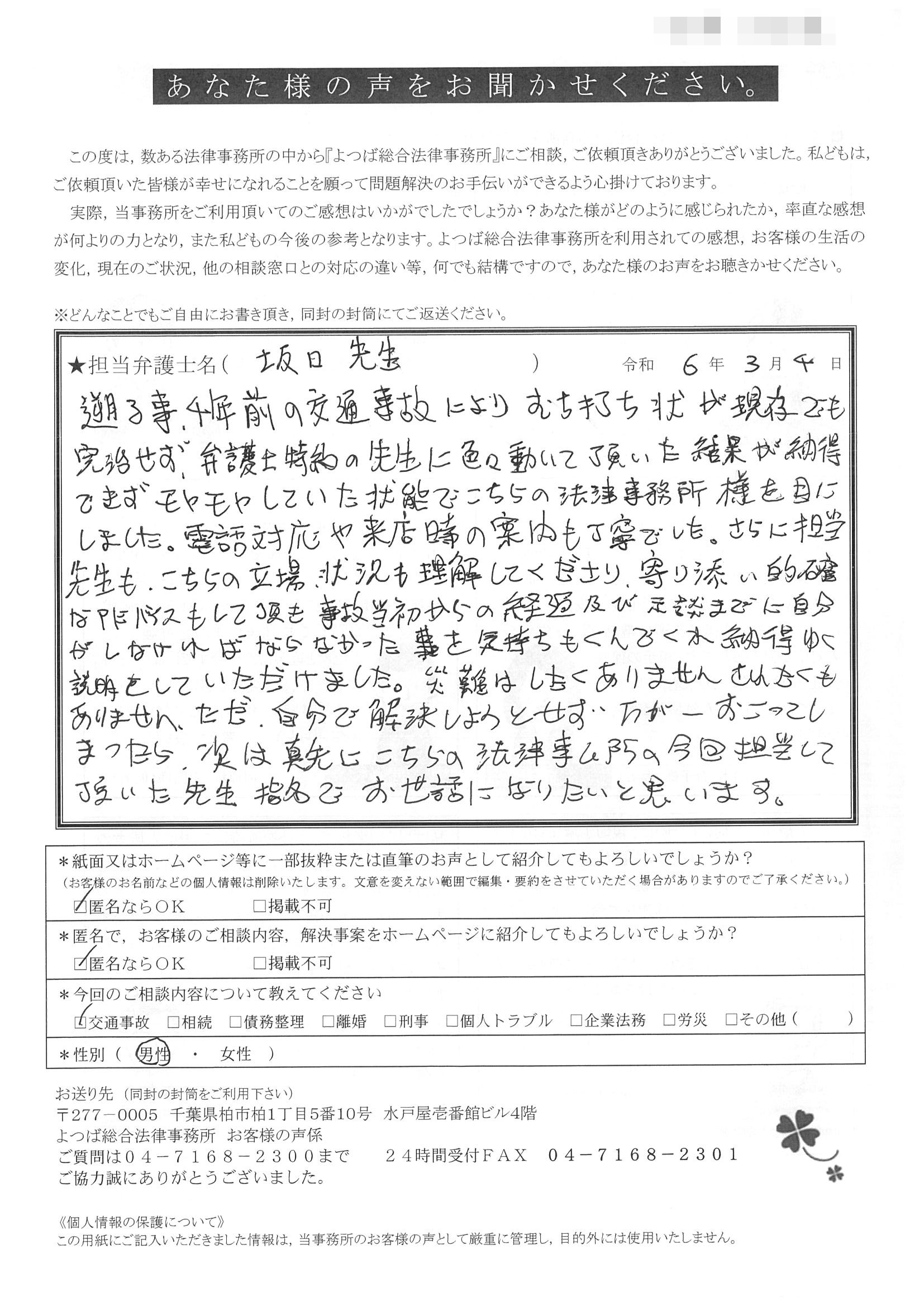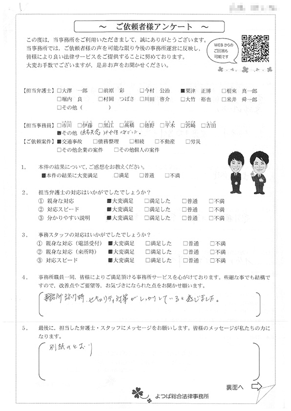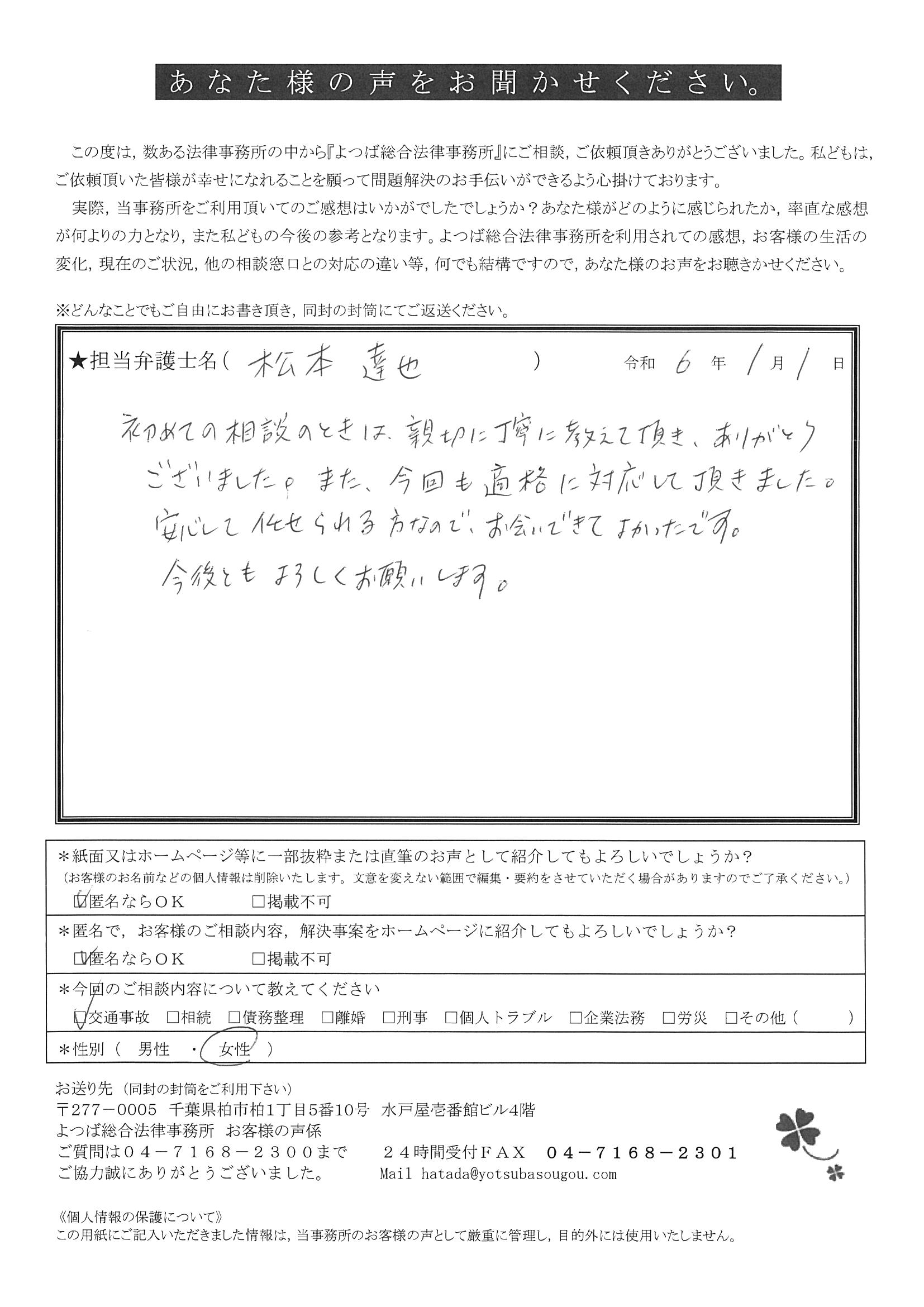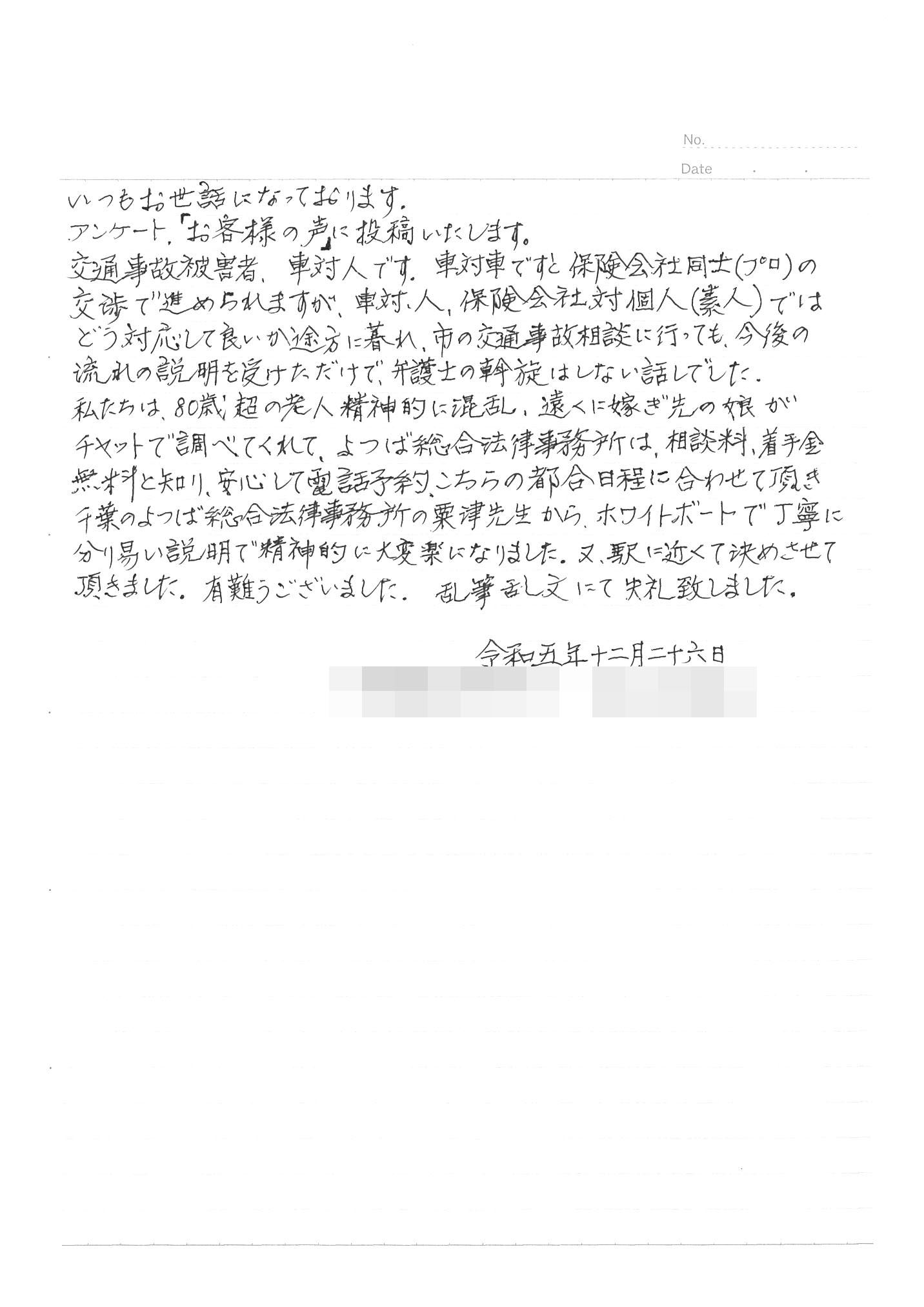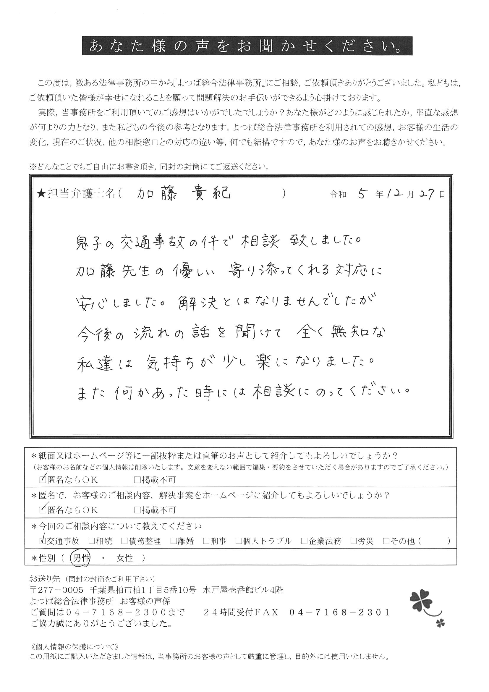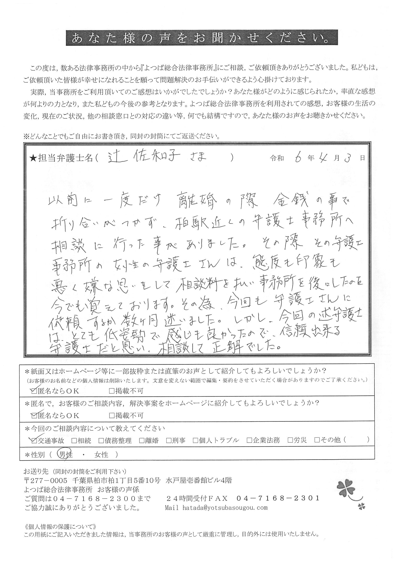 この度は交通事故に関する相談に丁寧にご対応いただき、ありがとうございました。