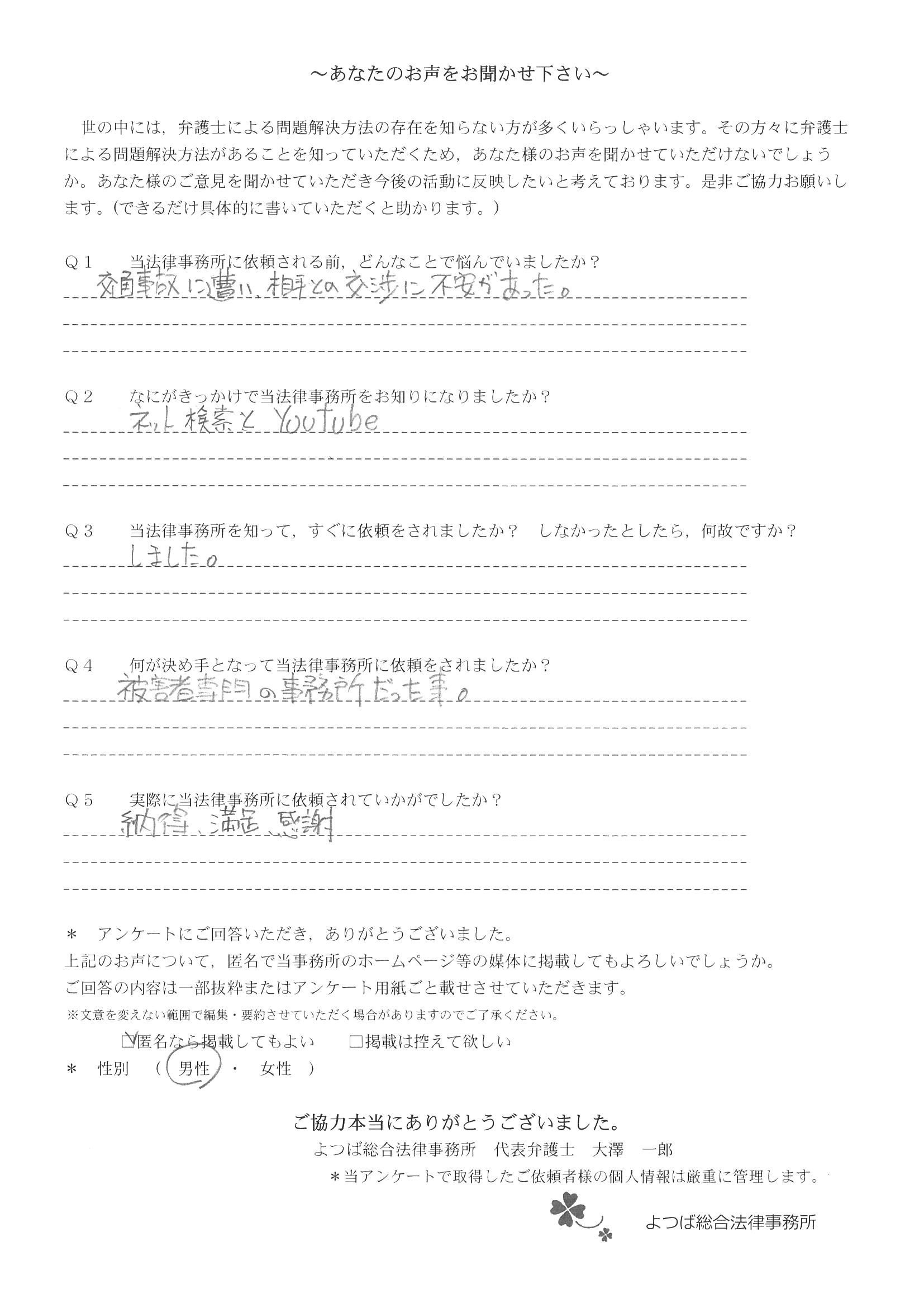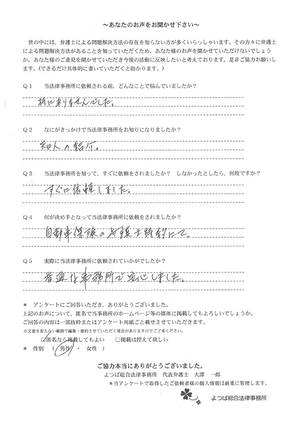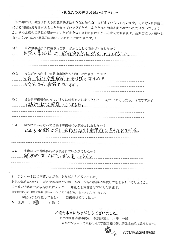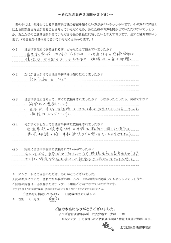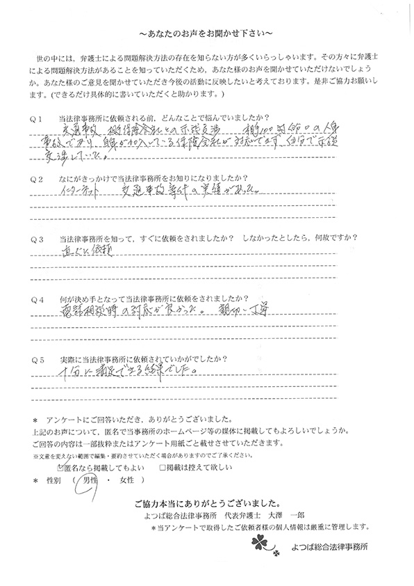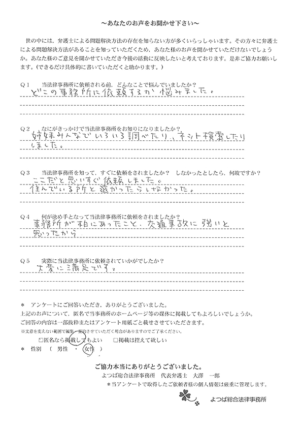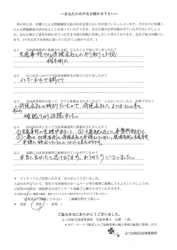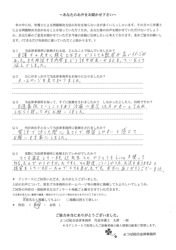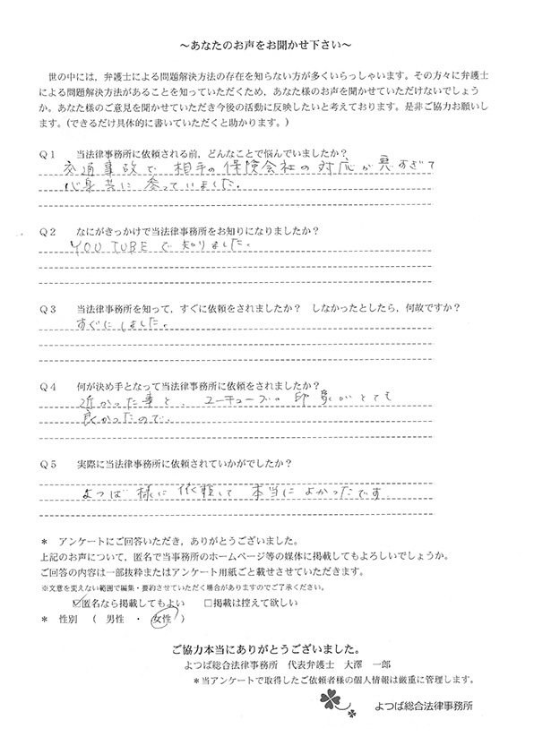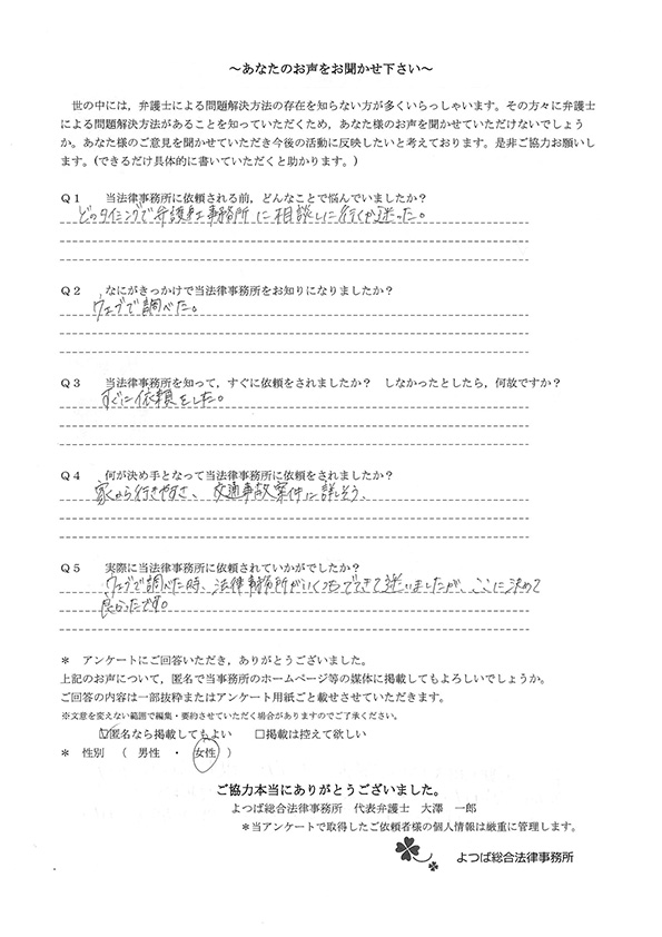 交通事故で悩んでいました。インターネットの口コミでこちらを知り依頼しました。