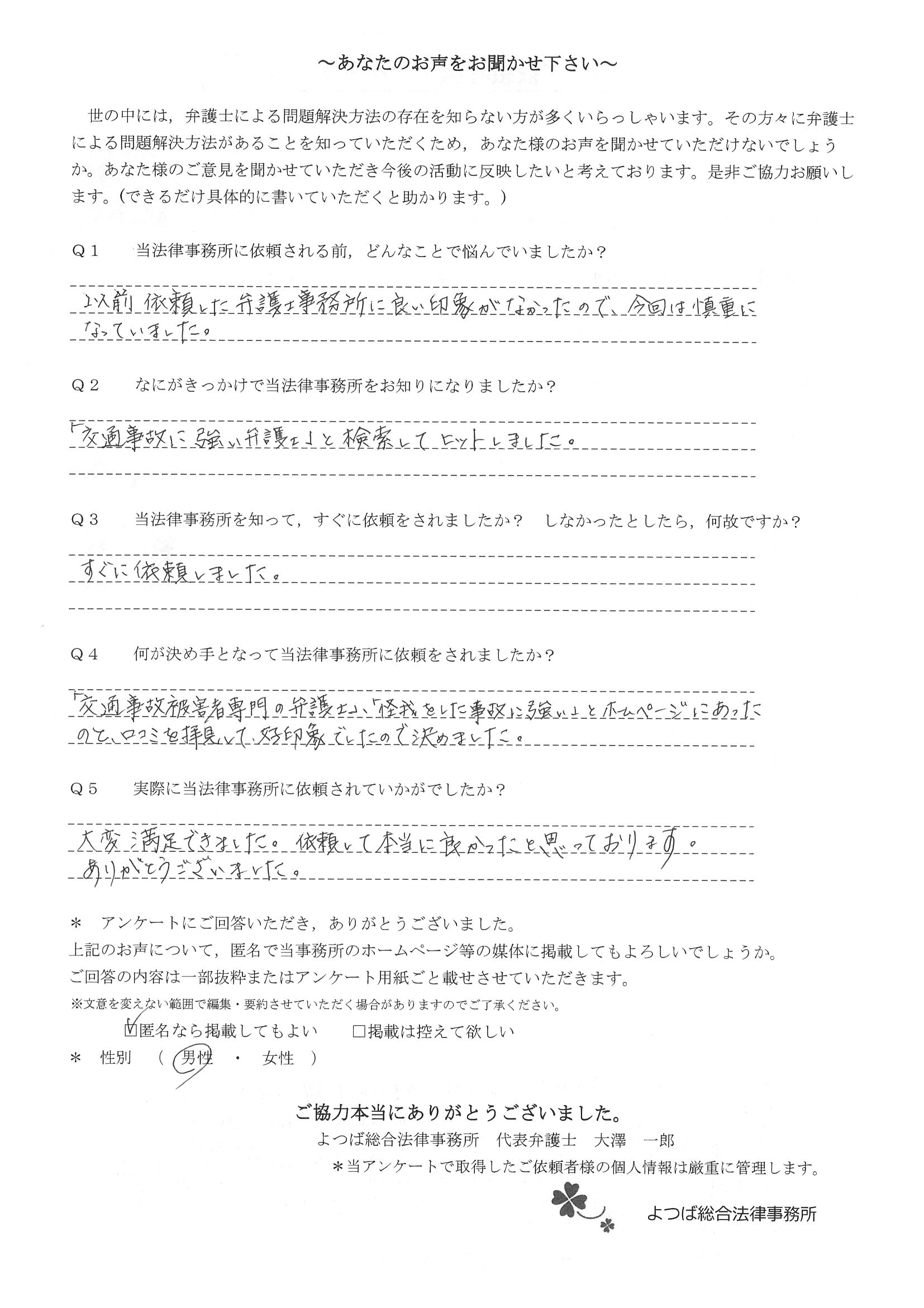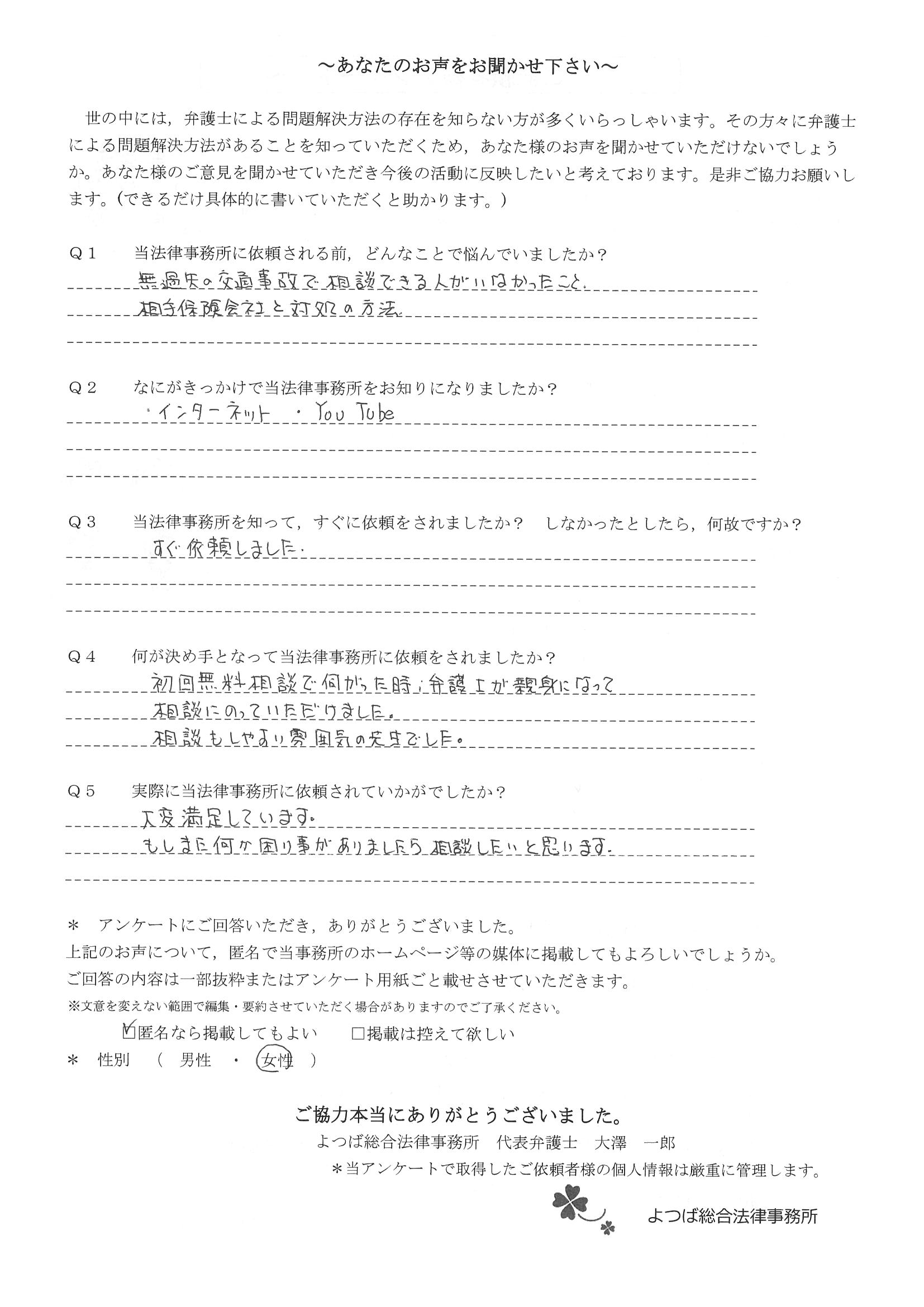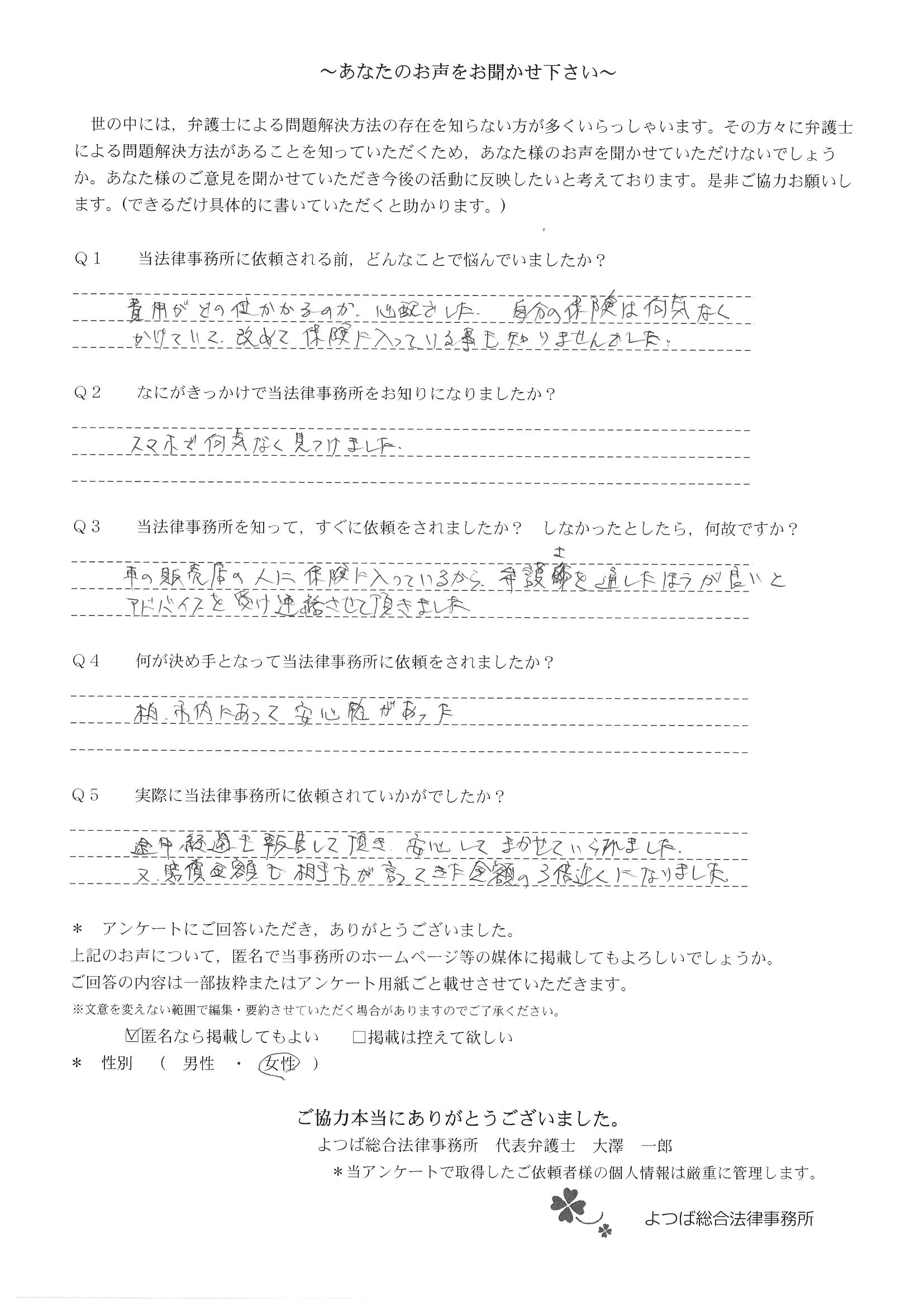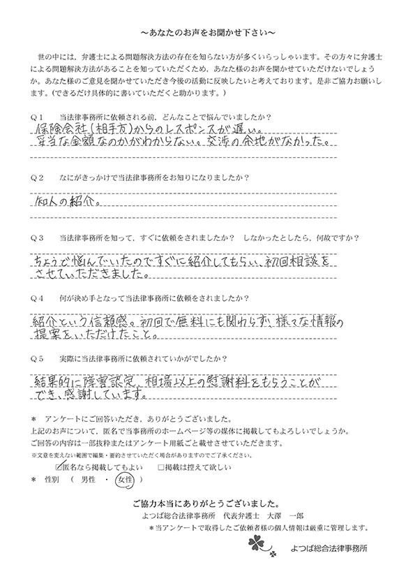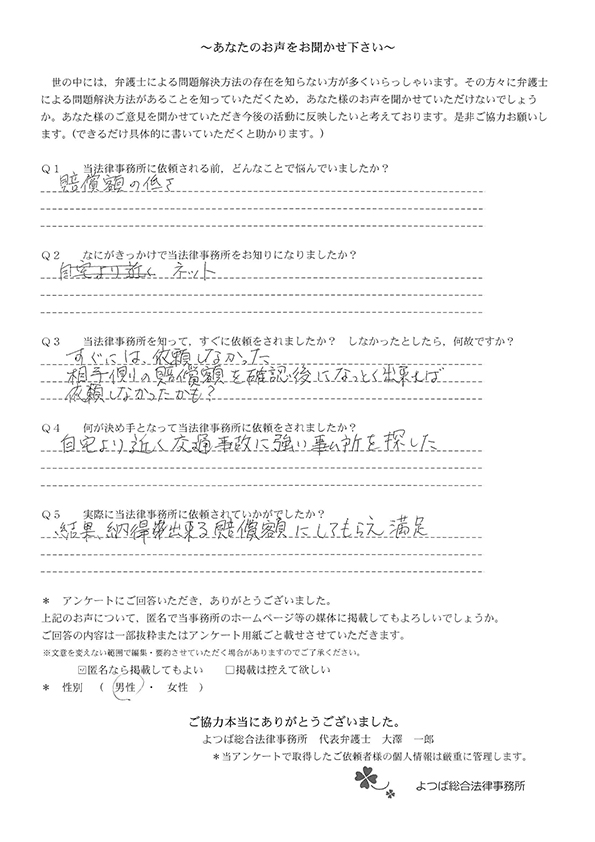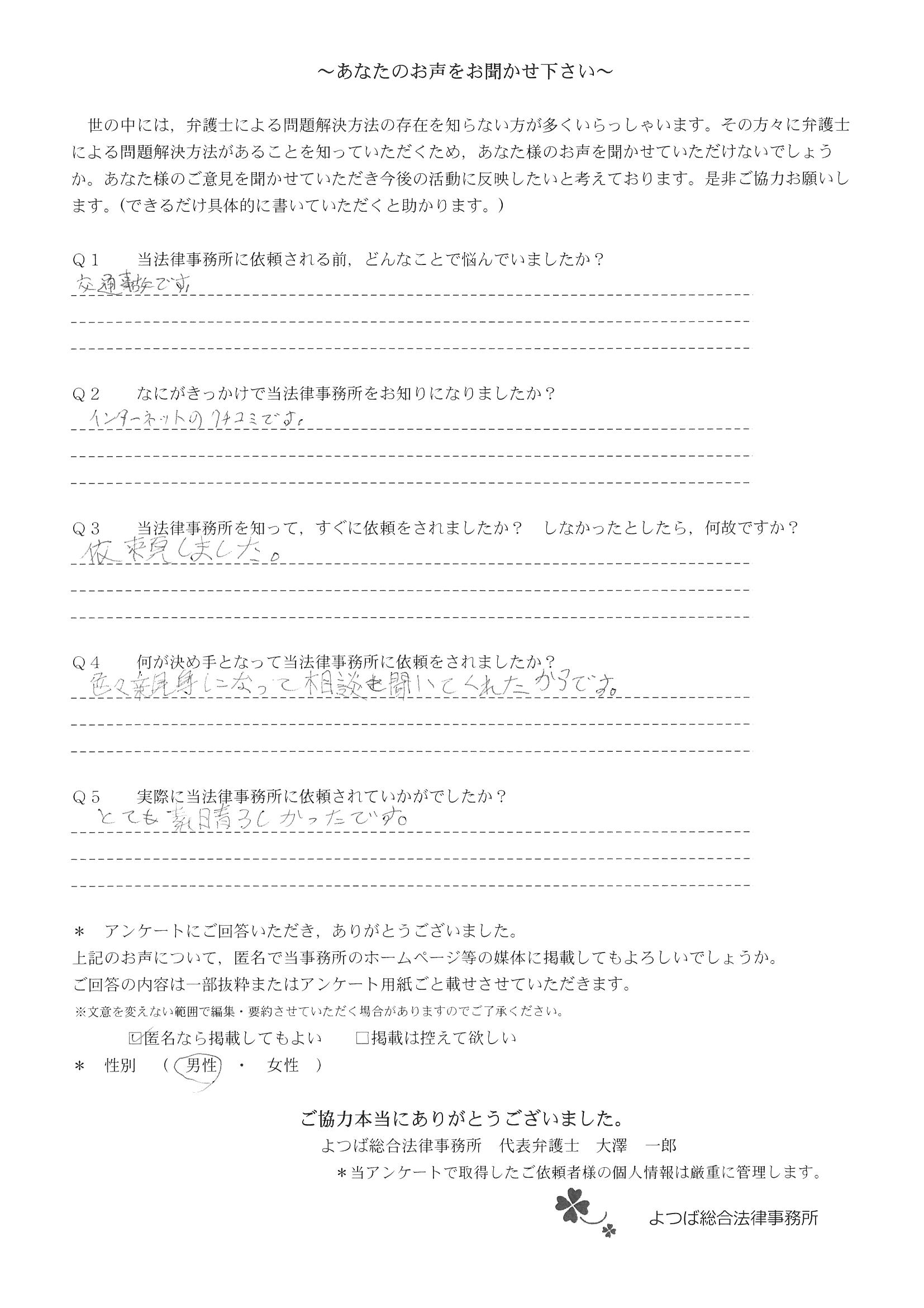 交通事故で悩んでいました。インターネットの口コミでこちらを知り依頼しました。