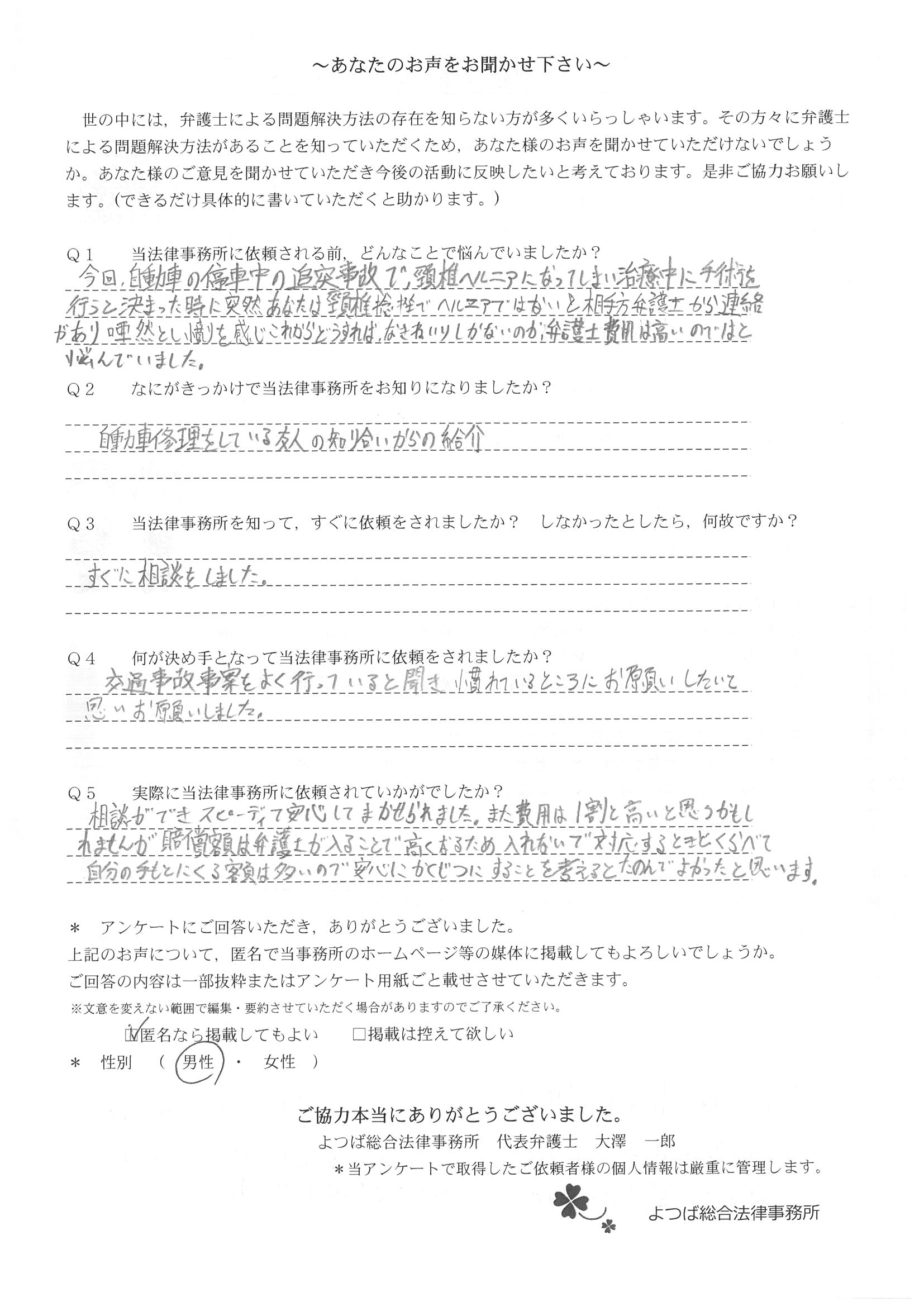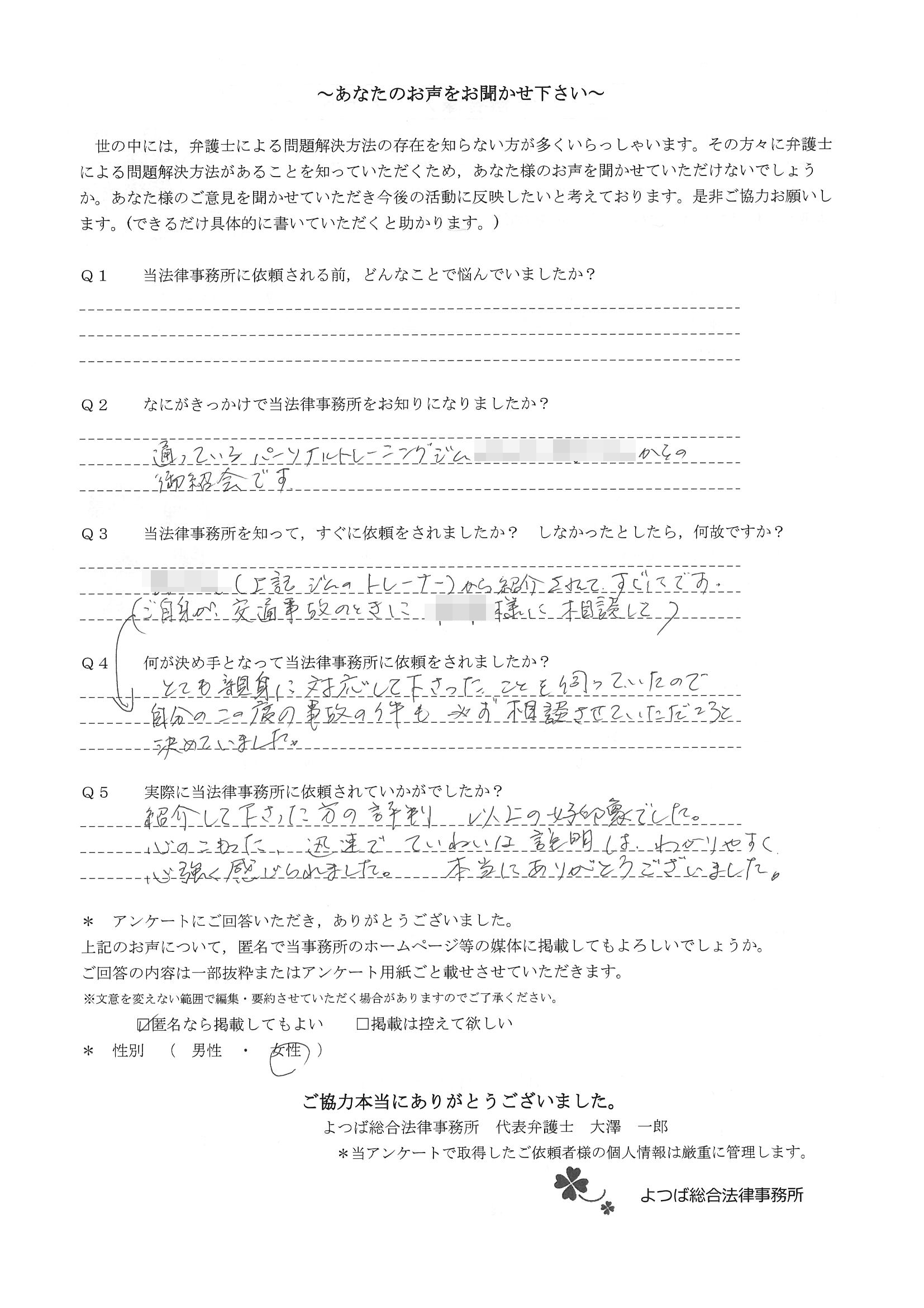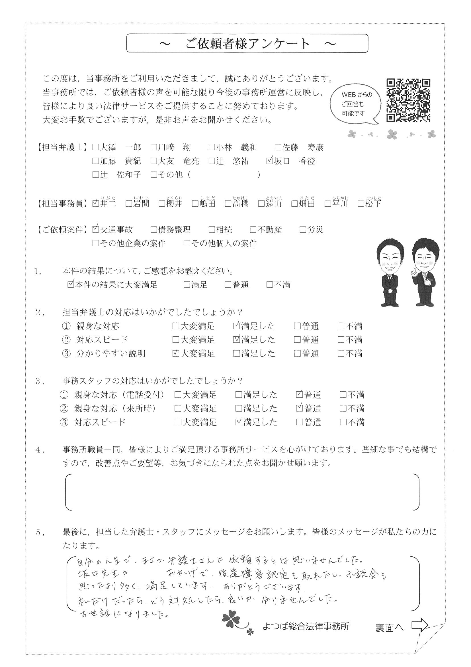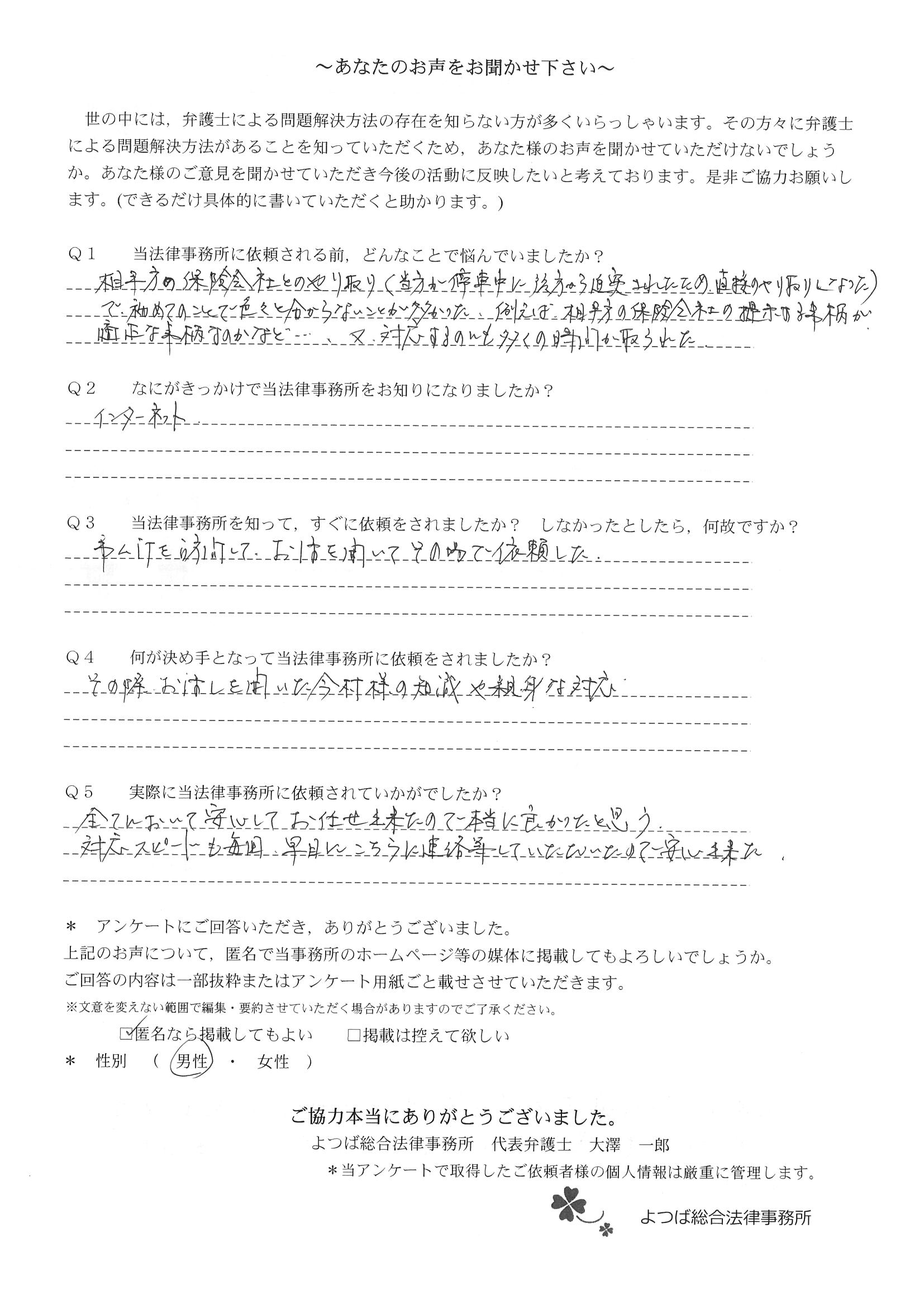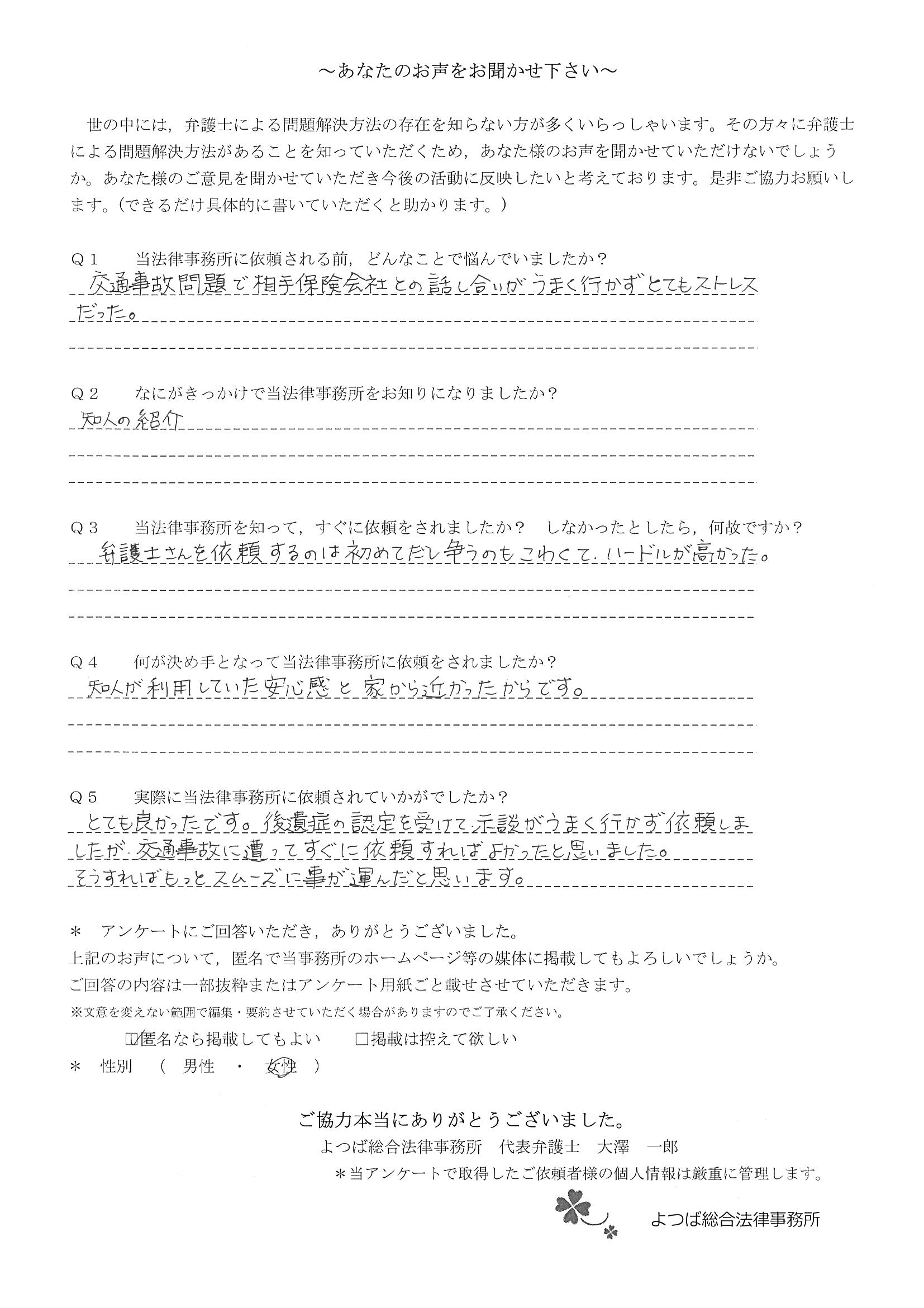 交通事故で悩んでいました。インターネットの口コミでこちらを知り依頼しました。