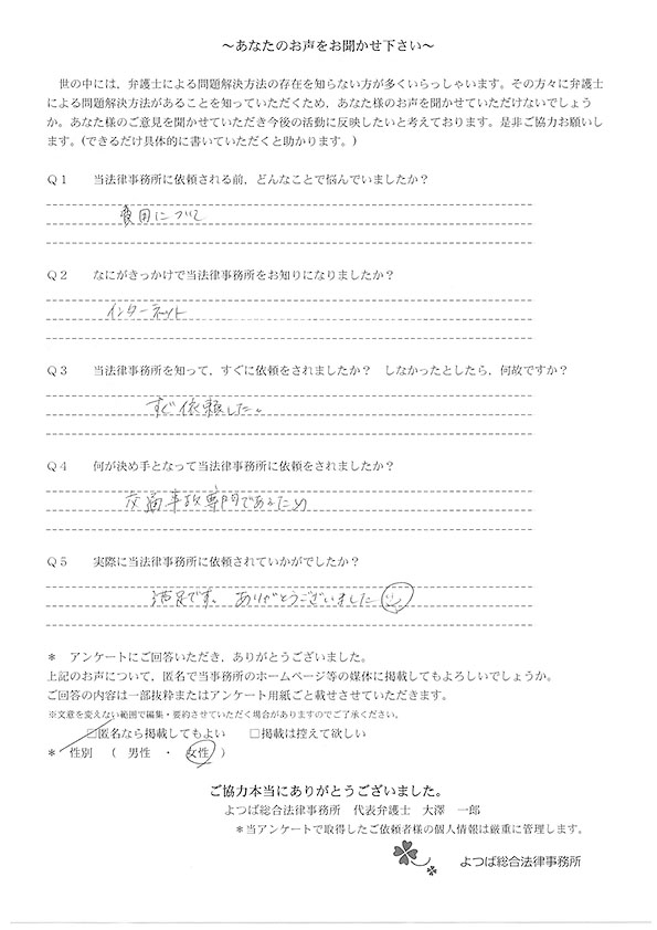 WEBで事務所を知り、口コミが決め手となり依頼しました。