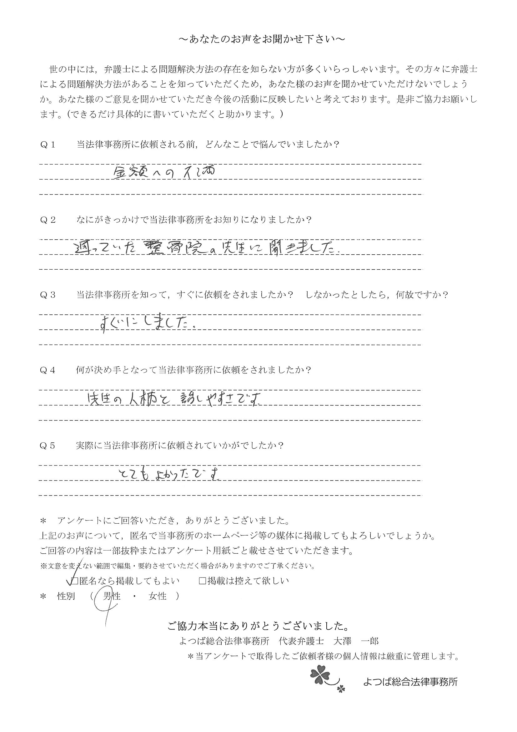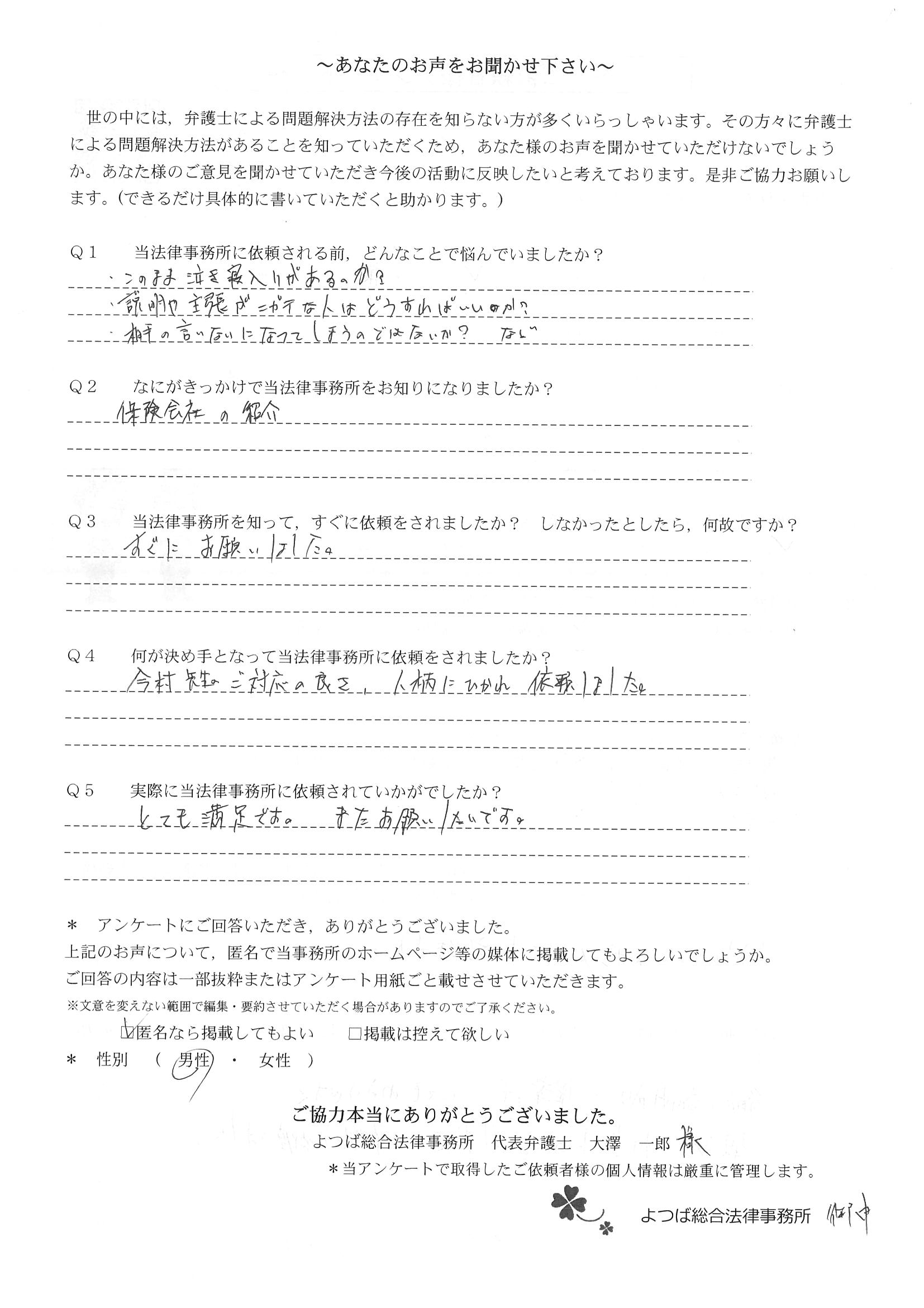 怪我の治療が終わり次第、正式に依頼させていただく予定ではございますが、何の迷いもなく、先生におねがいしたい。と思える先生で、相談させていただいて本当に良かったと思っております。本当にありがとうございました。