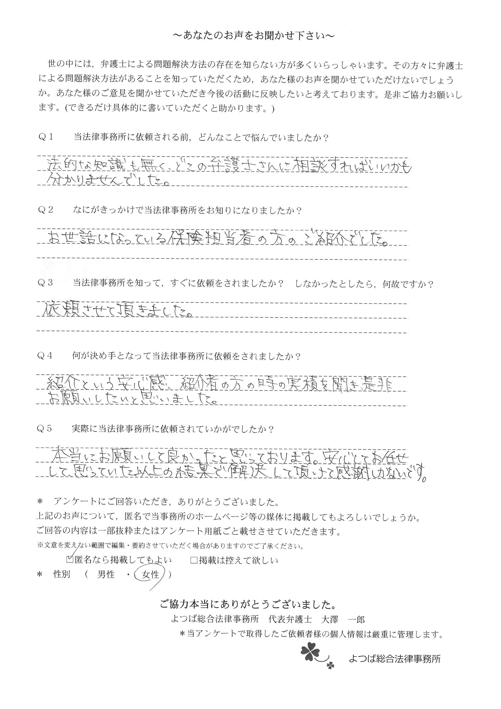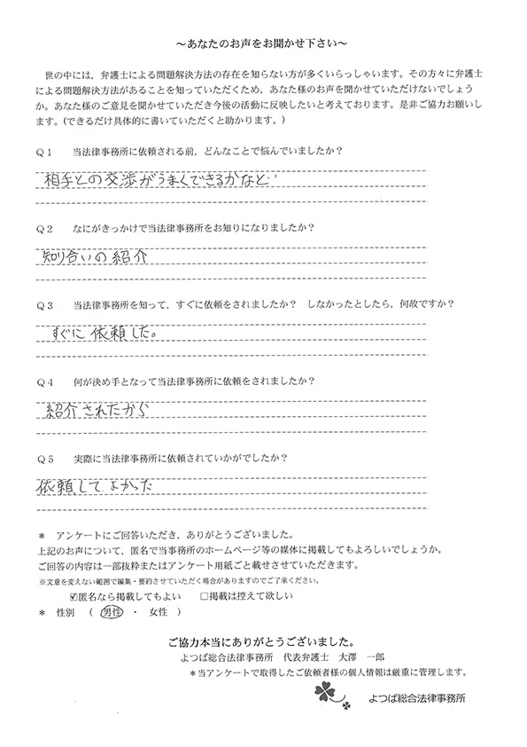 今回、初めて弁護士様にお願いしましたが、本当に安心してお任せできて良かったと思います。