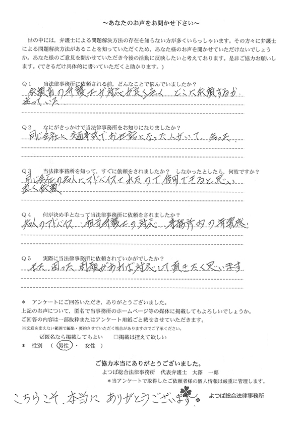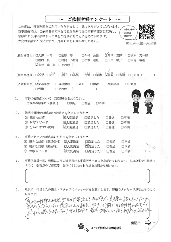 私達は80才超の老人、精神的に混乱、遠くに嫁ぎ先の娘がチャットで調べてくれて、よつば総合法律事務所は相談料、着手金無料と知り、安心して電話予約、こちらの都合、日程に合わせて頂き、また、駅に近くて決めさせて頂きました。ありがとうございました。
