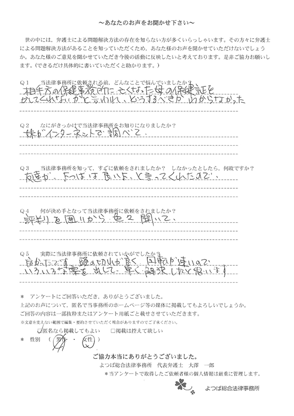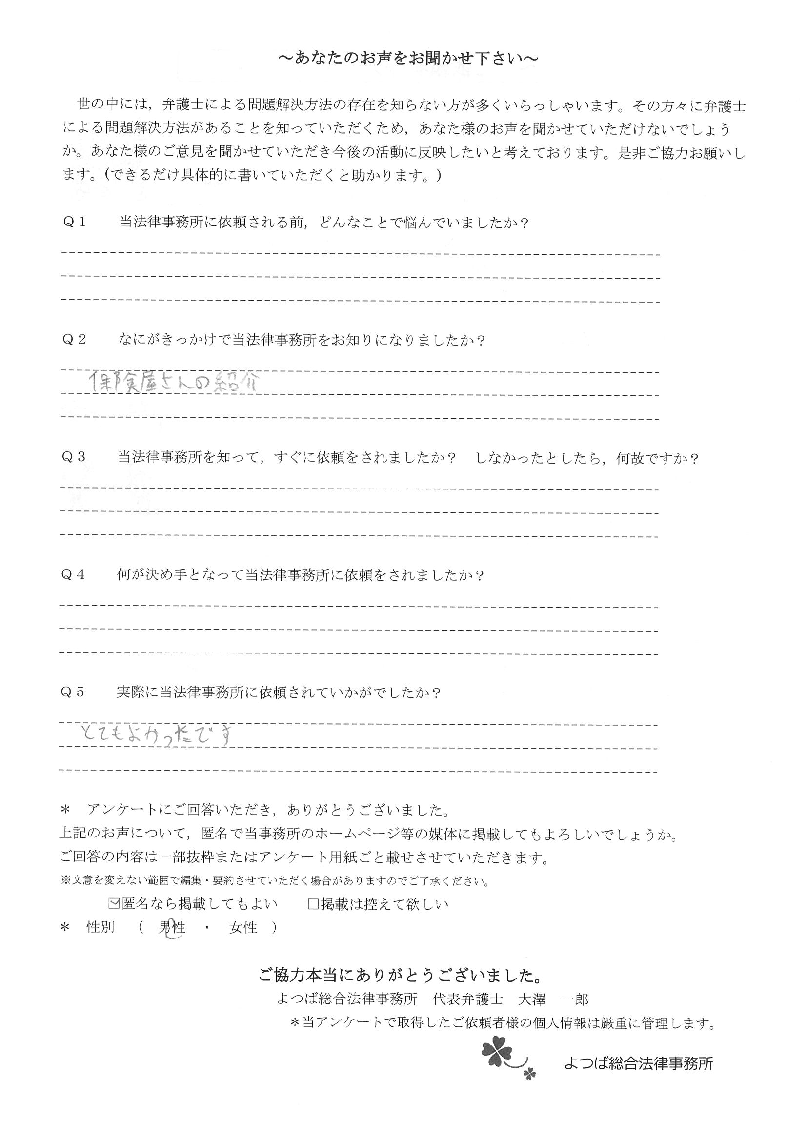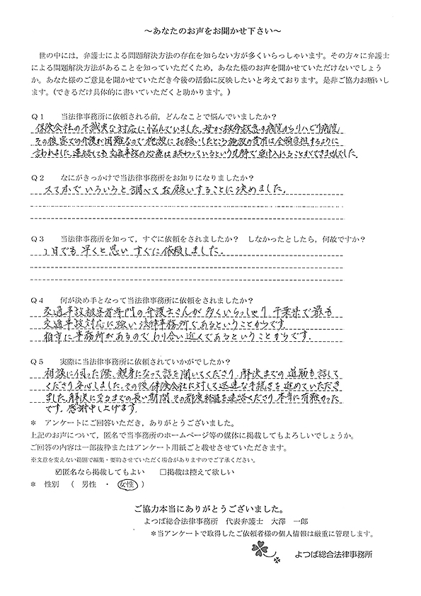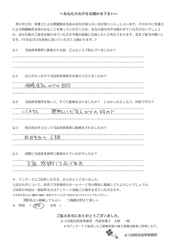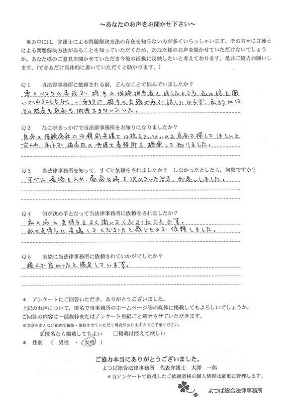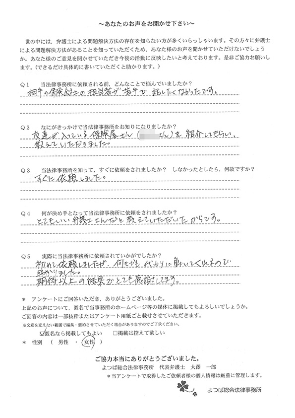 親身に対応して頂き、自分では保険会社の方とのやりとりは絶対できなかったことだったので、大変感謝しています。