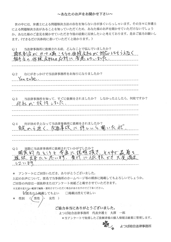 YouTubeでよつば総合法律事務所を知り、すぐに依頼をしました。
