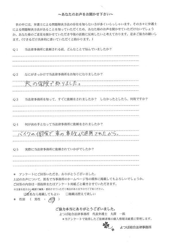 インターネットで、交通事故事件の実績があることを知り、すぐに依頼しました。