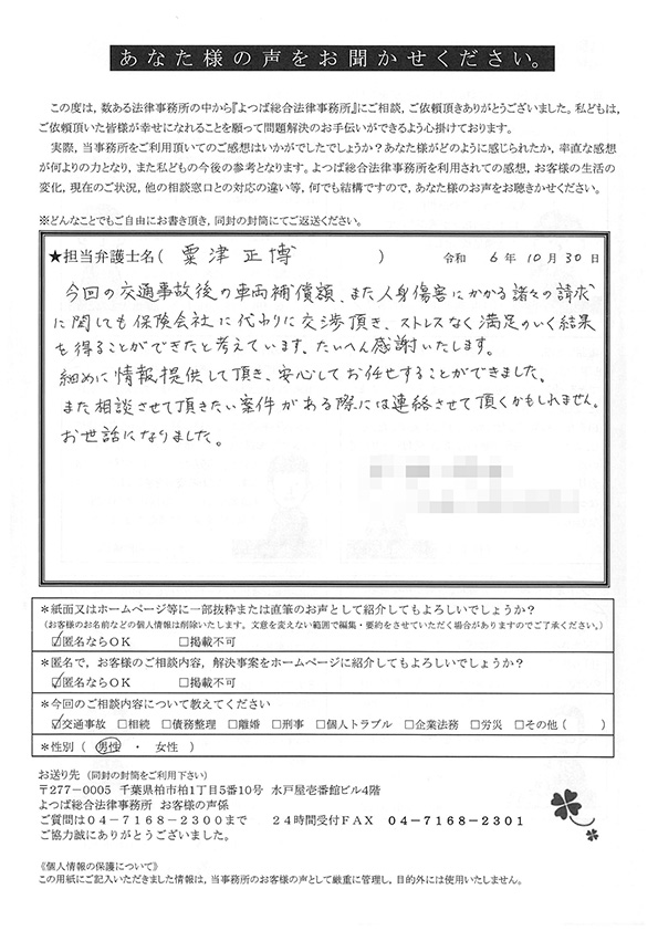 今回の交通事故後の車両補償額、また人身傷害にかかる諸々の請求に関しても保険会社に変わり交渉いただき、ストレスなく満足いく結果を得ることができたと考えています。