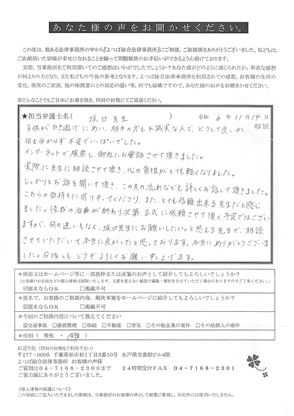 相談して本当に良かったです。他の法律事務所にも1度行きましたが、よつばさんはお仕事だからというより、人としてちゃんと関わってくれて嬉しかったです。