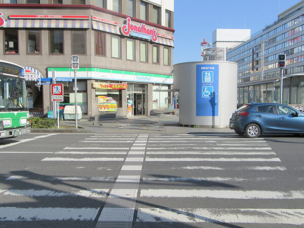 4.進んでいくと、目の前に横断歩道があるので渡ります。渡ったら左側にファミリーマートがあります。