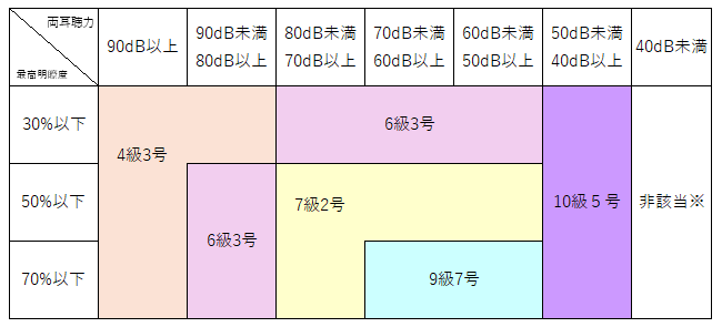 なお、両耳に異なった聴力障害が残ったとしても以下の表により左右別々の等級を定めるのではなく、両耳の聴力障害 の基準に従って等級を定めます。