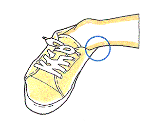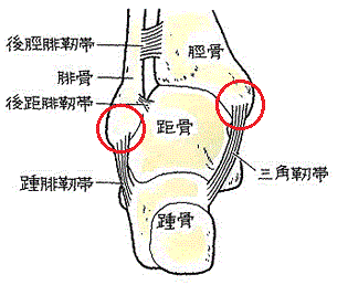 一方、青い丸の部分は、距骨骨軟骨損傷で痛みを感じるところです。