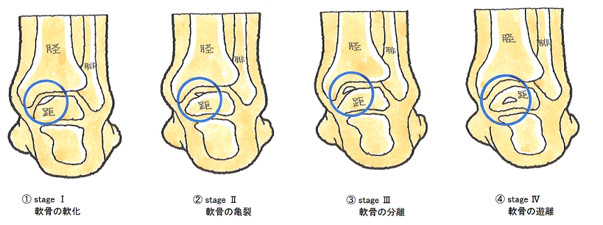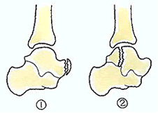 上記イラストの①②であれば、骨壊死に至ることは通常ありません。底屈位で整復した後、ギプス固定を行うことにより改善に向かいます。