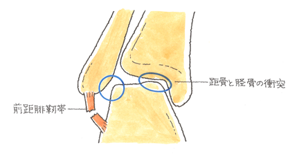 足関節底屈時に内返しの捻挫が起きたとき、前距腓靱帯を損傷、断裂することが珍しくありません。 このときに、距骨と脛骨が衝突し、その衝突の衝撃で、距骨内側の軟骨を損傷することがあります。 一方、背屈時に内返し捻挫があると、腓骨と接する距骨外側で軟骨が損傷します。