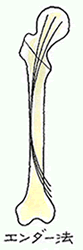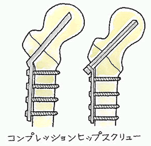安定型にとどまるときは、侵襲の少ないエンダー法が多く用いられますが、転位が激しいときは、固定性に優れているCHS法(コンプレッション ヒップ スクリュー)が用いられます。安定型骨折でもCHS法が行われることもあります。