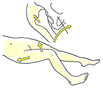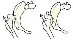後方脱臼が起こると、脱臼部位に激痛と腫れが生じ、関節の可動域は著しく制限されて内転、内旋し、後方に大腿骨が押し上げられることにより大腿は常に短縮します。