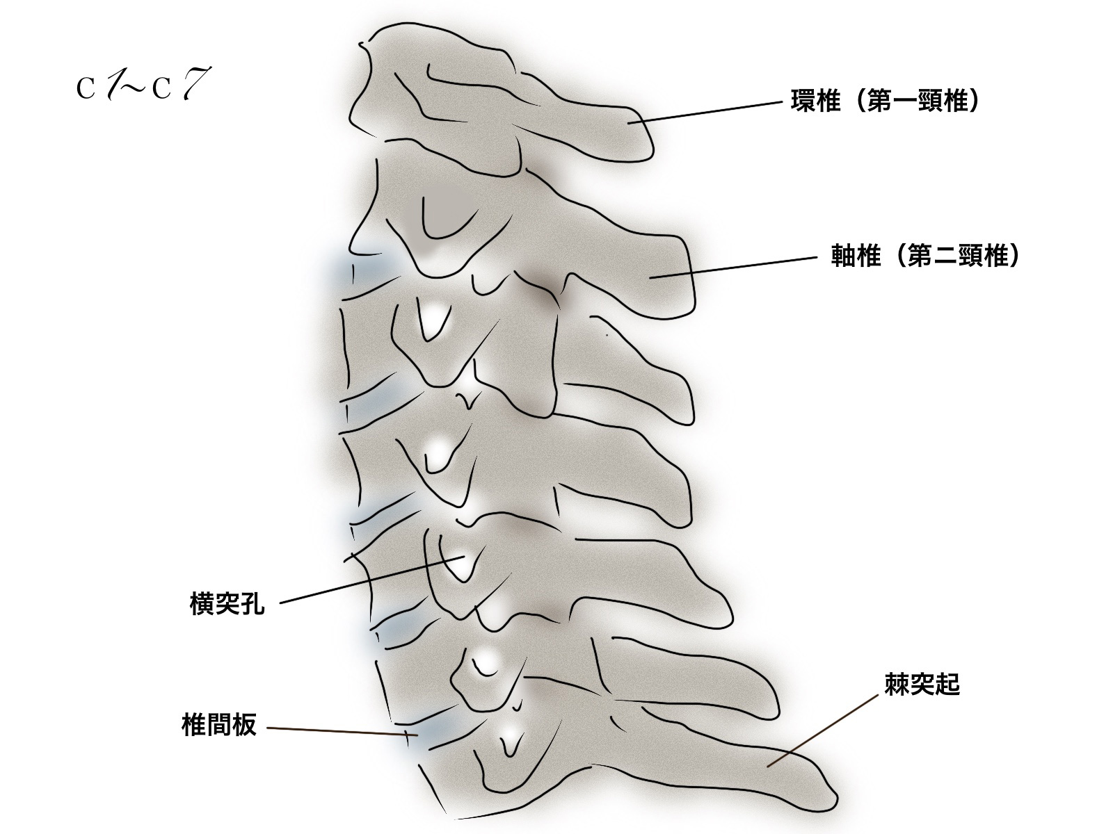 「首には7つの骨がある」といわれています。頸椎といいます。頸椎は、いずれも椎間板、靭帯、筋肉によってつながっています。