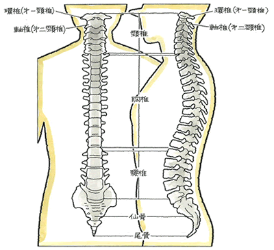 脊柱は、上から頚椎・胸椎・腰椎及び仙骨と尾骨で構成されます。頚椎は7個の椎骨、胸椎は12個の椎骨、腰椎は5個の椎骨でできています。