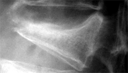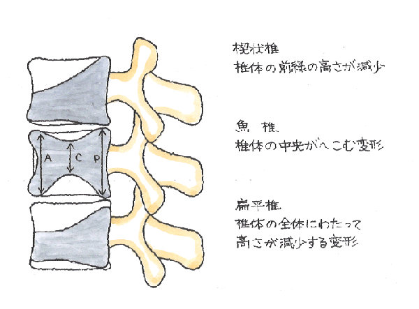 画像は側面から撮影したレントゲン写真です。脊椎の椎体前方がくさび形に変形しているのが分かります。