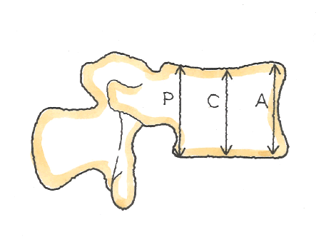 c. 椎体の高さが全体的に減少する場合(扁平椎といいます。)は、上位または下位の椎骨と比較し、A、C、Pがいずれも20パーセント以上減少しているとき
